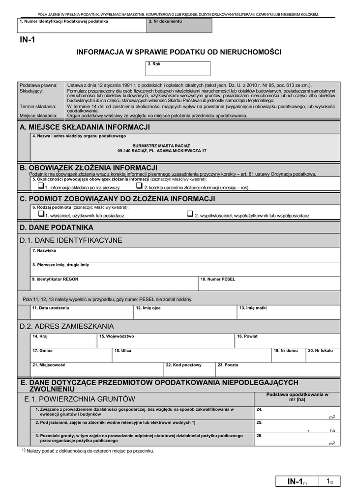 POLA JASNE WYPEŁNIA PODATNIK. WYPEŁNIAĆ NA MASZYNIE, KOMPUTEROWO LUB RĘCZNIE, DUŻYMI DRUKOWANYMI LITERAMI, CZARNYM LUB NIEBIESKIM KOLOREM. 1. Numer Identyfikacji Podatkowej podatnika 2. Nr dokumentu IN-1 INFORMACJA W SPRAWIE PODATKU OD NIERUCHOMOŚCI 3. Rok Podstawa prawna: Składający: Termin składania: Miejsce składania: Ustawa z dnia 12 stycznia 1991 r. o podatkach i opłatach lokalnych (tekst jedn. Dz. U. z 2010 r. Nr 95, poz. 613 ze zm.). Formularz przeznaczony dla osób fizycznych będących właścicielami nieruchomości lub obiektów budowlanych, posiadaczami samoistnymi nieruchomości lub obiektów budowlanych, użytkownikami wieczystymi gruntów, posiadaczami nieruchomości lub ich części albo obiektów budowlanych lub ich części, stanowiących własność Skarbu Państwa lub jednostki samorządu terytorialnego. W terminie 14 dni od zaistnienia okoliczności mających wpływ na powstanie (wygaśnięcie) obowiązku podatkowego, lub wysokość opodatkowania. Organ podatkowy właściwy ze względu na miejsce położenia przedmiotu opodatkowania. A. MIEJSCE SKŁADANIA INFORMACJI 4. Nazwa i adres siedziby organu podatkowego BURMISTRZ MIASTA RACIĄŻ 09-140 RACIĄŻ, PL. ADAMA MICKIEWICZA 17 B. OBOWIĄZEK ZŁOŻENIA INFORMACJI Podatnik ma obowiązek złożenia wraz z korektą informacji pisemnego uzasadnienia przyczyny korekty – art. 81 ustawy Ordynacja podatkowa. 5. Okoliczności powodujące obowiązek złożenia informacji (zaznaczyć właściwy kwadrat): 1. informacja składana po raz pierwszy 2. korekta uprzednio złożonej informacji (miesiąc – rok) C. PODMIOT ZOBOWIĄZANY DO ZŁOŻENIA INFORMACJI 6. Rodzaj podmiotu (zaznaczyć właściwy kwadrat): 1. właściciel, użytkownik lub posiadacz 2. współwłaściciel, współużytkownik lub współposiadacz D. DANE PODATNIKA D.1. DANE IDENTYFIKACYJNE 7. Nazwisko 8. Pierwsze imię, drugie imię 9. Identyfikator REGON 10. Numer PESEL Pola 11, 12, 13 należy wypełnić w przypadku, gdy numer PESEL nie został nadany. 11. Data urodzenia 12. Imię ojca 13. Imię matki D.2. ADRES ZAMIESZKANIA 14. Kraj 17. Gmina 15. Województwo 16. Powiat 18. Ulica 21. Miejscowość 19. Nr domu 22. Kod pocztowy 20. Nr lokalu 23. Poczta E. DANE DOTYCZĄCE PRZEDMIOTÓW OPODATKOWANIA NIEPODLEGAJĄCYCH ZWOLNIENIU Podstawa opodatkowania w m2 (ha) E.1. POWIERZCHNIA GRUNTÓW 1. Związane z prowadzeniem działalności gospodarczej, bez względu na sposób zakwalifikowania w ewidencji gruntów i budynków 24. 2. Pod jeziorami, zajęte na zbiorniki wodne retencyjne lub elektrowni wodnych 1) 25. 3. Pozostałe grunty, w tym zajęte na prowadzenie odpłatnej statutowej działalności pożytku publicznego przez organizacje pożytku publicznego 26. m2 , ha m2 1) Należy podać z dokładnością do czterech miejsc po przecinku. IN-1 (1) 1/2 POLA JASNE WYPEŁNIA PODATNIK. WYPEŁNIAĆ NA MASZYNIE, KOMPUTEROWO LUB RĘCZNIE, DUŻYMI DRUKOWANYMI LITERAMI, CZARNYM LUB NIEBIESKIM KOLOREM. E.2. POWIERZCHNIA BUDYNKÓW LUB ICH CZĘŚCI Podstawa opodatkowania w m2 1. Mieszkalne - ogółem 27. - od 1,40 do 2,20 m (zaliczyć 50% powierzchni) 28. m2 w tym kondygnacji - powyżej 2,20 m o wysokości: 2. Związane z prowadzeniem działalności gospodarczej oraz części budynków mieszkalnych zajęte na prowadzenie działalności gospodarczej - ogółem m2 29. m2 30. m2 - od 1,40 do 2,20 m (zaliczyć 50% powierzchni) 31. w tym kondygnacji - powyżej 2,20 m o wysokości: 3. Zajęte na prowadzenie działalności gospodarczej w zakresie obrotu kwalifikowanym materiałem siewnym ogółem - od 1,40 do 2,20 m (zaliczyć 50% powierzchni) - od 1,40 do 2,20 m (zaliczyć 50% powierzchni) m2 m2 35. m2 36. m2 37. w tym kondygnacji - powyżej 2,20 m o wysokości: 5. Pozostałe, w tym zajętych na prowadzenie odpłatnej statutowej działalności pożytku publicznego przez organizacje pożytku publicznego – ogółem w tym kondygnacji o wysokości: m2 33. 34. w tym kondygnacji - powyżej 2,20 m o wysokości: 4. Związane z udzielaniem świadczeń zdrowotnych w rozumieniu przepisów o działalności leczniczej, zajęte przez podmioty udzielające tych świadczeń - ogółem - m2 32. od 1,40 do 2,20 m (zaliczyć 50% powierzchni) m2 38. m2 39. m2 40. m2 - powyżej 2,20 m 41. m2 E.3. WARTOŚĆ BUDOWLI LUB ICH CZĘŚCI ZWIĄZANYCH Z PROWADZENIEM DZIAŁALNOŚCI GOSPODARCZEJ Podstawa opodatkowania w zł* Budowle 42. zł F. INFORMACJA O ZAŁĄCZNIKACH (do niniejszej informacji dołączono) 43. Liczba załączników ZN-1/A 44. Załącznik ZN-1/B składany (zaznaczyć właściwy kwadrat): tak nie G. OŚWIADCZENIE I PODPIS PODATNIKA / OSOBY REPREZENTUJĄCEJ PODATNIKA Oświadczam, że są mi znane przepisy Kodeksu karnego skarbowego o odpowiedzialności za podanie danych niezgodnych z rzeczywistością. 45. Imię 46. Nazwisko 47. Data wypełnienia informacji (dzień - miesiąc - rok) 48. Podpis (pieczęć) podatnika / osoby reprezentującej podatnika 2) H. ADNOTACJE ORGANU PODATKOWEGO 49. Uwagi organu podatkowego 50. Data (dzień - miesiąc - rok) 51. Podpis przyjmującego formularz *Zgodnie z art. 63 § 1 ustawy z dnia 29 sierpnia 1997 r. – Ordynacja podatkowa (tekst jednolity: Dz.U. z 2005 r. Nr 8, poz. 60 ze zm.), podstawy opodatkowania, kwoty podatków, odsetki za zwłokę, opłaty prolongacyjne, oprocentowanie nadpłat oraz wynagrodzenia przysługujące płatnikom zaokrągla się do pełnych złotych, w ten sposób, że końcówki kwot wynoszące mniej niż 50 groszy pomija się, a końcówki kwot wynoszące 50 i więcej groszy podwyższa się do pełnych złotych. 2) Niepotrzebne skreślić. IN-1 (1) 2/2