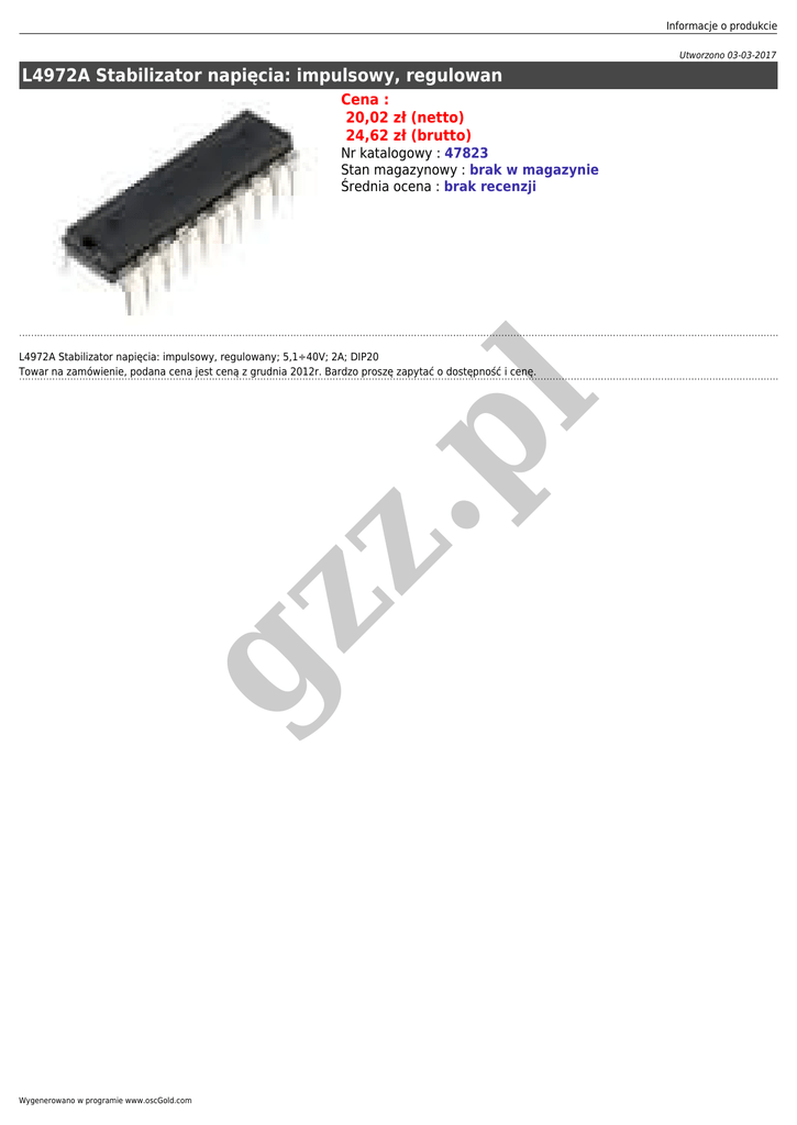 Informacje o produkcie Utworzono 03-03-2017 L4972A Stabilizator napięcia: impulsowy, regulowan Cena : 20,02 zł (netto) 24,62 zł (brutto) Nr katalogowy : 47823 Stan magazynowy : brak w magazynie Średnia ocena : brak recenzji gz z .p l L4972A Stabilizator napięcia: impulsowy, regulowany; 5,1÷40V; 2A; DIP20 Towar na zamówienie, podana cena jest ceną z grudnia 2012r. Bardzo proszę zapytać o dostępność i cenę. Wygenerowano w programie www.oscGold.com