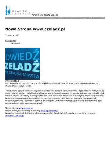 Portal Miasta Miasta Czeladź http://www.czeladz.pl/aktualnosci/index/Nowa-Strona-www.czeladz.pl/idn:87/printpdf Nowa Strona www.czeladź.pl 31 marca 2016 kategoria: Aktualności www.czeladź.pl Już 1 kwietnia, i to nie jest prima aprilis, po kilku miesiącach przygotowań, portal internetowy naszego miasta zmieni swoje oblicze. Nowa strona będzie nowocześniejsza i zdecydowanie bardziej komunikatywna. Będzie też responsywna, co oznacza że jej wygląd i układ będzie się automatycznie dostosowywał do rozmiaru okna urządzeń takich jak tablety, czy też smartfony. Łatwiej będzie odnaleźć potrzebne informacje w biuletynie informacji publicznej. Wraz ze zmianą wizerunku miejskiego portalu, sukcesywnie zmieniane też będą witryny wszystkich miejskich jednostek i zakładów. Zgodnie z wymogami unijnymi i obowiązująca ustawą, dostosowane będą one do potrzeb osób niepełnosprawnych. Strona Miasta www.czeladź.pl Strona Biuletynu Informacji Publicznej www.bip.czeladz.pl Wszystkie informacje i aktualności publikowane do 1 kwietnia 2016 zostały przeniesione na stronę archiwum.czeladz.pl