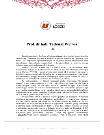 Prof. dr hab. Tadeusz Wyrwa Dorobek naukowy Profesora Tadeusza Wyrwy jest bardzo bogaty i wielce różnorodny. Obejmuje trzynaście książek w języku francuskim i polskim oraz ponad sto artykułów opublikowanych w wydawnictwach zbiorowych oraz periodykach francuskich, niemieckich i holenderskich z zakresu prawa państwowego, nauk politycznych i historii. Tadeusz Wyrwa urodził się 15 marca 1926 r. w Warszawie. Jako młodzieniec walczył na Kielecczyźnie w oddziale AK dowodzonym przez ojca Józefa Wyrwę. W 1945 r. został aresztowany przez UB i więziony, najpierw w Końskich a następnie w Łodzi. Zdołał uciec z więzienia ale zagrożony ponownym aresztowaniem, podjął decyzję o nielegalnym opuszczeniu Polski. W 1947 r. przedostał się przez Czechosłowację do Niemiec Zachodnich. Na uniwersytecie w Kilonii rozpoczął studia prawnicze. Nie mogąc uzyskać prawa stałego pobytu, w 1949 r. zdecydował się wyjechać do Stanów Zjednoczonych. Tutaj, na początku 1950 r., popadł w spór z władzami odmawiając służby w wojsku amerykańskim. Po dwuletnim procesie sąd amerykański podzielił jego racje i uznał za niewinnego. Jednak skutki konfliktu, nagłośnione przez prasę amerykańską i polonijną, uniemożliwiły mu osiedlenie się w Stanach Zjednoczonych na stałe. W listopadzie 1952 r. Tadeusz Wyrwa przybył do Hiszpanii. W ramach programu pomocowego dla młodzieży pochodzącej z krajów zza żelaznej kurtyny, podjął studia politologiczne na Uniwersytecie w Madrycie. Po ich ukończeniu w przyspieszonym trybie przygotował i obronił pracę doktorską z zakresu nauk politycznych w 1958 r. Dwa lata później uzyskał doktorat w dziedzinie nauk politycznych w Polskim Uniwersytecie na Obczyźnie (PUO) w Londynie. Szukając pracy wyjechał do Paryża, gdzie przez cztery lata pracował dorywczo jako pracownik fizyczny. Uczył się języka francuskiego i przygotowywał nowe rozprawy naukowe. Pod kierunkiem prof. René M E D A L H O N O R I S C A U S A U N I W E R S Y T E T U Ł Ó D Z K I E G O / S t r o n a 1 M E D A L H O N O R I S C A U S A U N I W E R S Y T E T U Ł Ó D Z K I E G O Capitanta, specjalisty w zakresie prawa państwowego i nauk politycznych, napisał doktorat: Przemiany społeczno-polityczne w Polsce współczesnej. Od polski szlacheckiej do proletariackiej, obroniony w 1963 r. Pięć lat później uzyskał kolejny doktorat w zakresie literatury i nauk humanistycznych na Sorbonie. W 1964 r. Tadeusz Wyrwa został przyjęty do pracy w prestiżowym Centre National de la Recherche Scientifique w Paryżu znajdując wreszcie stabilizację zawodową i warunki dla rozwoju pracy naukowej. Związał się z tą instytucją na stałe aż do przejścia na emeryturę. Systematycznie awansował i osiągnął stanowisko kierownika badań odpowiadające statusowi profesora. Aktywnie uczestniczył w życiu naukowym francuskim i polskim emigracyjnym, zwłaszcza jako współpracownik paryskiej Kultury i wydawanych przez Instytut Literacki Zeszytów Historycznych. Wziął udział jako referent w Kongresie Współczesnej Nauki i Kultury Polskiej na Obczyźnie (1970) oraz w Kongresach Kultury Polskiej na Obczyźnie w 1985 i 1995 r. Profesor Tadeusz Wyrwa przyjechał do Polski, po latach emigracji, pierwszy raz w 1973 r. Został zaproszony przez Uniwersytet Jagielloński, który zorganizował wówczas w Krakowie pierwsze Spotkanie Uczonych Polskiego Pochodzenia. Od 1989 r. przyjeżdża do kraju coraz częściej. Utrzymuje kontakty z uczonymi z kraju, publikuje dla polskiego czytelnika i stara się na bieżąco komentować publikacje naukowe ukazujące się w Polsce. Dorobek naukowy Profesora Tadeusza Wyrwy jest bardzo bogaty i wielce różnorodny. Obejmuje trzynaście książek w języku francuskim i polskim oraz ponad sto artykułów opublikowanych w wydawnictwach zbiorowych oraz periodykach francuskich, niemieckich i holenderskich z zakresu prawa państwowego, nauk politycznych i historii. Prace z dwóch pierwszych dziedzin wydawał w Paryżu zyskując uznanie francuskiego środowiska naukowego: Le Mexique (1968), La Gestion de l’Entreprise socialiste. L’Experience Polonaise (1970), Les Républiques Andines (Bolivie, Chili, Colombie, Equateur, Pérou, Venezuela) (1972), La Pensée politique polonaise a l’époque de l’Humanisme et de la Renaissance (Un apport a la connaissance de l?Europe moderne)(1978), La resistance Polonaise et la politique en Europe (1983) i L’idée européenne dans la Resistance a travers la presse clandestine en France et en Pologne 1939-1945 (1987). W pisarstwie historycznym Profesora Tadeusza Wyrwy dominuje problematyka najnowszej historii Polski. W 1974 r. opublikował w londyńskiej Oficynie Poetów i Malarzy książkę W cieniu legendy Majora Hubala a w następnych latach kolejne prace: Prasa konspiracyjna w imieniu Polski Walczącej 1940-1945 (1984) i Historyk na obczyźnie a najnowsze dzieje Polski (1986). W 1999 r. Wydawnictwo Norbertinum w Lublinie wydało jego książkę Bezdroża dziejów Polski. Kraj i emigracja po 1 września 1939 r. (następne wydania w 1999 i 2000 r.). Kolejna M E D A L H O N O R I S C A U S A U N I W E R S Y T E T U Ł Ó D Z K I E G O / S t r o n a 2 M E D A L H O N O R I S C A U S A U N I W E R S Y T E T U Ł Ó D Z K I E G O książka Profesora wydana w Polsce przez PWN, Krytyczne eseje z historii Polski XX wieku, jest zbiorem kilkudziesięciu artykułów, przyczynków i recenzji wcześniej już publikowanych na łamach paryskiej Kultury, Zeszytów Historycznych i londyńskiego Pamiętnika Literackiego. Ostatnio Profesor wydał w Norbertinum pracę Posłannictwo historii czasu pogardy i zakłamania (2004) oraz zbiór studiów Pokoleniowe rozstaje dróg (2007). Profesor Tadeusz Wyrwa jest jednym z najbardziej znanych i cenionych humanistów polskich na uchodźstwie. Jego twórczość naukowa została doceniona przez polskie instytucje emigracyjne i krajowe. Otrzymał nagrody Kultury (1991), Związku Pisarzy Pol