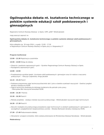 Ogólnopolska debata nt. kształcenia technicznego w polskim systemie edukacji szkół podstawowych i gimnazjalnych Regionalne Centrum Rozwoju Edukacji w Opolu i DPH „JAWI” Witold Jakubek mają zaszczyt zaprosić na Ogólnopolską debatę nt. kształcenia technicznego w polskim systemie edukacji szkół podstawowych i gimnazjalnych, która odbędzie się 30 maja 2016 r. w godz. 13:00 - 17:30 w Regionalnym Centrum Rozwoju Edukacji w Opolu przy ul. Głogowskiej 27 Program konferencji 13.00 - 13.30 Rejestracja uczestników 13:30 - 14:00 Wstęp do debaty ● ● Otwarcie i powitanie zaproszonych gości – Dyrektor Regionalnego Centrum Rozwoju Edukacji w Opolu. Wystąpienia zaproszonych gości. 14:00 - 14:50 ● Przedstawienie wyników badań „Uczniowie szkół podstawowych i gimnazjum oraz ich rodzice o nauczaniu praktycznym” – Patrycja Czajkowska, Kinga Jakubek 14.15 – 15.15 Panel I ● ● Podstawa programowa zajęć technicznych/techniki dziś i jutro w świetle oczekiwań nauczycieli – Ewelina Langfort doradca metodyczny RCRE. Zajęcia techniczne podstawą do dalszego kształcenia dla potrzeb rynku pracy – Mieczysław Biel nauczyciel konsultant RCRE. 15.00 – 15.30 Przerwa 15.30 – 16.30 Panel II ● Metoda projektów – wiodąca metoda nauczania praktycznego – Witold Jakubek nauczyciel zajęć technicznych. 16.30 – 17.30 Panel III ● Warunki niezbędne do praktycznego prowadzenia zajęć technicznych w szkołach podstawowych i gimnazjach, ze szczególnym uwzględnieniem bezpieczeństwa uczniów – Wiesław Bartoszek doradca metodyczny RCRE. 17.30 – 17.40 Podsumowanie debaty ● Odczytanie i przyjęcie wniosków, które zostaną skierowane do Ministerstwa Edukacji Narodowej – Witold Jakubek. Moderatorzy: 1 Ewelina Langfort - doradca metodyczny RCRE Witold Jakubek - nauczyciel zajęć technicznych _____________________________________________________ Zgłoszenia drogą elektroniczną do 26 maja 2016 r. Karta zgłoszenia Więcej informacji Mieczysław Biel - Kierownik Pracowni Kształcenia Zawodowego [email protected] tel. 77 404 75 69 kom. +48 608869204 Ewelina Langfort , [email protected] 695456413 Witold Jakubek [email protected] tel. kom. 601 508 266 2