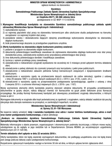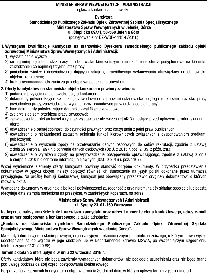 MINISTER SPRAW WEWNĘTRZNYCH I ADMINISTRACJI ogłasza konkurs na stanowisko: Dyrektora Samodzielnego Publicznego Zakładu Opieki Zdrowotnej Szpitala Specjalistycznego Ministerstwa Spraw Wewnętrznych w Jeleniej Górze ul. Cieplicka 69/71, 58-560 Jelenia Góra (postępowanie nr DZ-WOP-1113-8/2016) 1. Wymagane kwalifikacje kandydata na stanowisko Dyrektora samodzielnego publicznego zakładu opieki zdrowotnej Ministerstwa Spraw Wewnętrznych i Administracji: 1) wykształcenie wyższe; 2) co najmniej pięcioletni staż pracy na stanowisku kierowniczym albo ukończone studia podyplomowe na kierunku zarządzanie i co najmniej trzyletni staż pracy; 3) posiadanie wiedzy i doświadczenia dających rękojmię prawidłowego wykonywania obowiązków na stanowisku objętym konkursem; 4) brak prawomocnego skazania za przestępstwo popełnione umyślnie. 2. Oferty kandydatów na stanowiska objęte konkursem powinny zawierać: 1) podanie o przyjęcie na stanowisko objęte konkursem; 2) dokumenty potwierdzające kwalifikacje zawodowe do zajmowania stanowiska objętego konkursem oraz staż pracy (świadectwa pracy, zaświadczenia wydane przez pracodawcę potwierdzające staż pracy); 3) inne dokumenty potwierdzające dorobek i kwalifikacje zawodowe; 4) życiorys z opisem przebiegu pracy zawodowej; 5) zaświadczenie o niekaralności (oryginał) wystawione nie wcześniej niż 3 miesiące przed upływem terminu składania ofert; 6) oświadczenie o pełnej zdolności do czynności prawnych oraz korzystaniu z pełni praw publicznych; 7) oświadczenie o niekaralności zakazem pełnienia funkcji kierowniczych związanych z dysponowaniem środkami publicznymi; 8) oświadczenie o wyrażeniu zgody na przetwarzanie danych osobowych do celów rekrutacji, zgodnie z ustawą z dnia 29 sierpnia 1997 r. o ochronie danych osobowych (Dz.U. z 2015 r. poz. 2135, z późn. zm.); 9) oświadczenie o wyrażeniu zgody na przeprowadzenie postępowania sprawdzającego, zgodnie z ustawą z dnia 5 sierpnia 2010 r. o ochronie informacji niejawnych (Dz.U. z 2016 r. poz. 1167). Wyżej wymienione elementy oferty kandydata powinny stanowić odrębne dokumenty. W przypadku przedstawienia dokumentów w języku obcym, należy dołączyć również ich tłumaczenie na język polski dokonane przez tłumacza przysięgłego. Na prośbę Komisji Konkursowej kandydat jest obowiązany przedstawić oryginały dokumentów, o których mowa w pkt 2. Wymagane dokumenty w oryginale albo kopii poświadczonej za zgodność z oryginałem, należy składać osobiście lub pocztą (decyduje data stempla naniesiona na przesyłce), w zamkniętych kopertach, na adres: Ministerstwo Spraw Wewnętrznych i Administracji ul. Syreny 23, 01-150 Warszawa Na kopercie należy umieścić: imię i nazwisko kandydata oraz adres i numer telefonu kontaktowego, adres e-mail oraz numer postępowania konkursowego, a także adnotację: „Konkurs na stanowisko dyrektora Samodzielnego Publicznego Zakładu Opieki Zdrowotnej Szpitala Specjalistycznego Ministerstwa Spraw Wewnętrznych w Jeleniej Górze”. Materiały informacyjne o stanie prawnym, organizacyjnym i ekonomicznym podmiotu leczniczego, o którym mowa wyżej, udostępniane są do wglądu w jego siedzibie lub w Departamencie Zdrowia MSWiA, po wcześniejszym uzgodnieniu telefonicznym (22 31 520 88). Termin składania ofert upłynie w dniu 22 września 2016 r. Oferty kandydatów, które nie będą zawierały wymaganych dokumentów, nie podlegają uzupełnieniu oraz nie będą brane pod uwagę podczas dalszej części postępowania konkursowego. Rozpatrzenie zgłoszonych kandydatur nastąpi w terminie 30 dni od dnia, w którym upływa termin zgłaszania ofert.