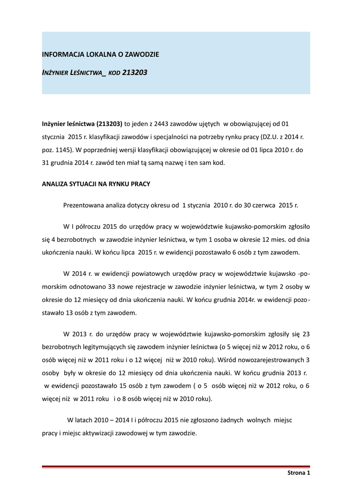 INFORMACJA LOKALNA O ZAWODZIE INŻYNIER LEŚNICTWA_ KOD 213203 Inżynier leśnictwa (213203) to jeden z 2443 zawodów ujętych w obowiązującej od 01 stycznia 2015 r. klasyfikacji zawodów i specjalności na potrzeby rynku pracy (DZ.U. z 2014 r. poz. 1145). W poprzedniej wersji klasyfikacji obowiązującej w okresie od 01 lipca 2010 r. do 31 grudnia 2014 r. zawód ten miał tą samą nazwę i ten sam kod. ANALIZA SYTUACJI NA RYNKU PRACY Prezentowana analiza dotyczy okresu od 1 stycznia 2010 r. do 30 czerwca 2015 r. W I półroczu 2015 do urzędów pracy w województwie kujawsko-pomorskim zgłosiło się 4 bezrobotnych w zawodzie inżynier leśnictwa, w tym 1 osoba w okresie 12 mies. od dnia ukończenia nauki. W końcu lipca 2015 r. w ewidencji pozostawało 6 osób z tym zawodem. W 2014 r. w ewidencji powiatowych urzędów pracy w województwie kujawsko -pomorskim odnotowano 33 nowe rejestracje w zawodzie inżynier leśnictwa, w tym 2 osoby w okresie do 12 miesięcy od dnia ukończenia nauki. W końcu grudnia 2014r. w ewidencji pozo stawało 13 osób z tym zawodem. W 2013 r. do urzędów pracy w województwie kujawsko-pomorskim zgłosiły się 23 bezrobotnych legitymujących się zawodem inżynier leśnictwa (o 5 więcej niż w 2012 roku, o 6 osób więcej niż w 2011 roku i o 12 więcej niż w 2010 roku). Wśród nowozarejestrowanych 3 osoby były w okresie do 12 miesięcy od dnia ukończenia nauki. W końcu grudnia 2013 r. w ewidencji pozostawało 15 osób z tym zawodem ( o 5 osób więcej niż w 2012 roku, o 6 więcej niż w 2011 roku i o 8 osób więcej niż w 2010 roku). W latach 2010 – 2014 I i półroczu 2015 nie zgłoszono żadnych wolnych miejsc pracy i miejsc aktywizacji zawodowej w tym zawodzie. Strona 1 BEZROBOTNI I ZGŁOSZONE WOLNE MIEJSCA PRACY LUB AKTYWIZACJI ZAWODOWEJW ZAWODZIE INŻYNIER LEŚNICTWA Wyszczególnienie Bezrobotni zarejestrowani w okresie ogółem Bezrobotni według stanu na koniec okresu Osoby do 12 miesięcy od dnia ukończenia nauki ogółem Osoby do 12 miesięcy od dnia ukończenia nauki na koniec okresu Wolne miejsca pracy i miejsca aktywizacji zawodowej ogółem Wolne miejsca pracy i miejsca aktywizacji zawodowej na koniec okresu I półrocze 2015 4 6 1 0 0 0 2014 33 13 2 0 0 0 2013 23 15 3 1 0 0 2012 18 10 6 0 0 0 2011 17 9 4 0 0 0 2010 11 7 3 0 0 0 Źródło: Opracowanie własne na podstawie raportów z monitoringu zawodów deficytowych i nadwyżkowych za lata 2010 2014 r. i I półrocze 2015 Brak zgłoszonych wolnych miejsc pracy lub aktywizacji zawodowej dla osób nowozarejstrowanych spowodował, że zawód inżynier leśnictwa w latach 2010-2014 został sklasyfikowany jako zawód nadwyżkowy, tzn. taki, na który na rynku pracy istnieje mniejsze zapotrzebowanie niż liczba osób poszukujących pracy w zawodzie.1 Z uwagi na nową metodologię prowadzenia monitoringu zawodów deficytowych i nadwyżkowych, zawód inżynier leśnictwa w I półroczu 2015r. nie miał określonego statusu na rynku pracy. 2 1 Podziału na zawody deficytowe, zrównoważone i nadwyżkowe dokonuje się na podstawie wskaźnika intensywności nadwyżki (deficytu) wyrażonego jako iloraz liczby zgłoszonych wolnych miejsc pracy i miejsc aktywizacji zawodowej w badanym okresie, w danym zawodzie i liczby zarejestrowanych bezrobotnych w badanym okresie, w danym zawodzie. Zawody deficytowe to takie, dla których wskaźnik przekracza wartość 1,1; zawody zrównoważone to te, dla których wartość wskaźnika mieści się w przedziale od 0,9 do 1,1; natomiast zawody nadwyżkowe to te, w których przypadku wskaźnik wynosi poniżej 0,9. 2 Wyniki z monitoringu zawodów zawarte w „Informacji sygnalnej z monitoringu zawodów deficytowych w województwie kujawsko-pomorskim w I półroczu 2015r.” dostępne są na stronie internetowej http://podlupa.wup.torun.pl/biblioteka/raporty-wyniki/ . Metodologia prowadzenia monitoringu w 2015r. dostępna jest na stronie internetowej http://podlupa.wup.torun.pl/w zakładce Biblioteka/Materiały ze spotkań. Strona 2 Powiat Województwo kujawsko-pomorskie Bydgoszcz grodzki Bydgoszcz ziemski Grudziądz grodzki Grudziądz ziemski Toruń grodzki Toruń ziemski Włocławek grodzki Włocławek ziemski Aleksandrów Kujawski Brodnica Chełmno Golub-Dobrzyń Inowrocław Lipno Mogilno Nakło nad Notecią Radziejów Rypin Sępólno Krajeńskie Świecie Tuchola Wąbrzeźno Żnin Bezrobotni nowozarejestrowani w I półroczu 2015. INŻYNIER LEŚNICTWA Wolne miejsca pracy i miejsca aktywizacji zawodowej zgłoszone w I półroczu 2015.. Bezrobotni wg stanu w dniu 30.06.15. 4 0 6 2 0 1 1 - - 0 0 0 0 0 0 2 0 0 0 0 0 0 2 0 0 0 0 0 0 2 0 0 0 0 0 0 - Źródło: Opracowanie własne na podstawie raportów z monitoringu zawodów deficytowych i nadwyżkowych za I półrocze 2015 WYNIKI BADANIA PRACODAWCÓW W wynikach badania wśród pracodawców, przeprowadzonego przez Wojewódzki Urząd Pracy w Toruniu w latach 2010-2014 nie ma informacji na temat planów zatrudnienia lub zwolnienia osób z zawodem inżynier leśnictwa.3 WYNIKI BADAŃ OFERT INTERNETOWYCH Raport z monitoringu internetowych ofert pracy dla województwa kujawskopomorskiego nie zawiera informacji dotyczących zawodu inżynier leśnictwa 5 3 Raport z badania 445 pracodawców 6 kluczowych branż woj. kujawsko-pomorskiego przeprowadzonego w 2014r. w ramach projektu WUP Rynek Pracy pod Lupą II oraz wyniki badań 2000 pracodawców przeprowadzonych w latach 20102013 w ramach projektu Rynek Pracy pod Lupą, znajdują się na stronie www.podlupa.wup.torun.pl. Strona 3 ANALIZA KSZTAŁCENIA W ZAWODZIE (SZKOŁY) Niniejsza informacja została przygotowana na podstawie danych Głównego Urzędu Statystycznego na temat studentów roku akademickiego 2014/2015 oraz absolwentów roku akademickiego 2013/2014 przekazanych, na potrzeby prowadzenia monitoringu zawodów deficytowych i nadwyżkowych przez Departament Rynku Pracy w Ministerstwie Pracy i Polityki Społecznej. W województwie kujawsko-pomorskim nie ma szkoły wy