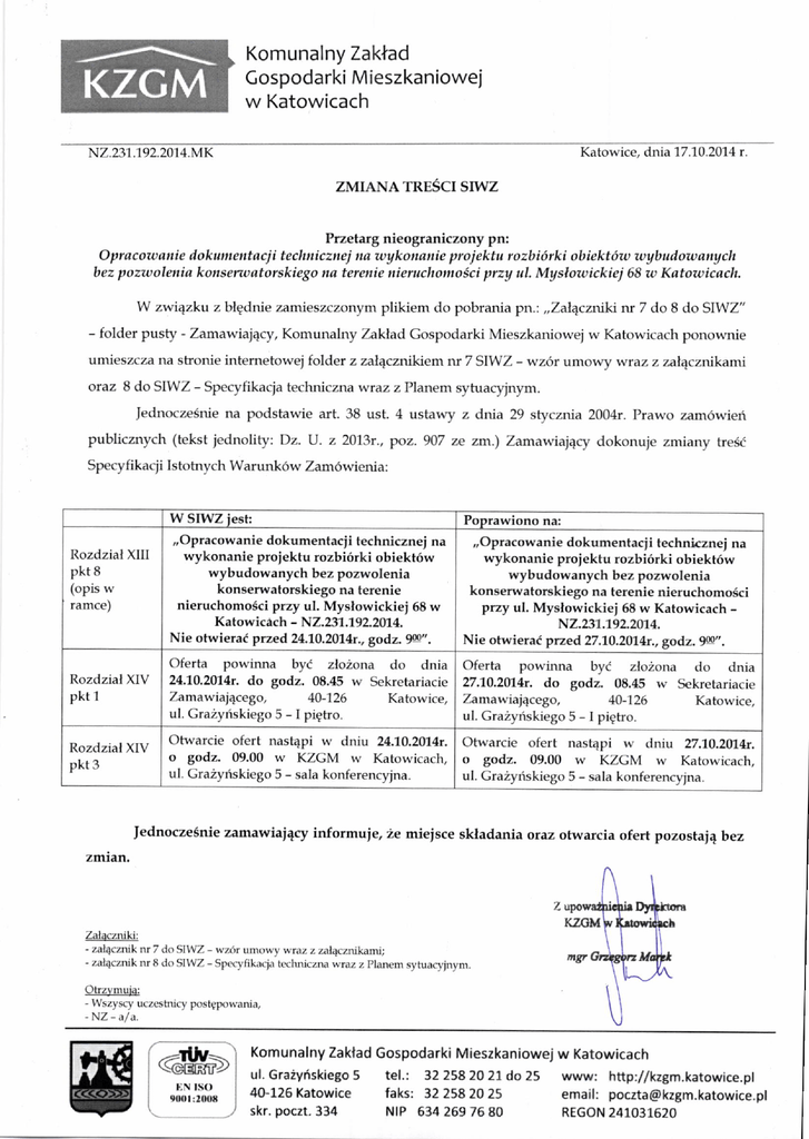 Komunalny Zaktad Gospodarki Mieszkaniowej w Katowicach Katowice, dnia 17.10.2014 r. N2.23"t."t92.20"t 4.MK ZMIANA TRESCI SIWZ Przetarg nieograniczony pn: Oprucozuanie ilokumentacji techtticznej na zuykonanie projektu rozbi6rki obiekt6w wybuilowanych bez pozzaolenia konseru;atorskiego na tererrie nienrchomo1ci przy ul. Myslozuickiej 68 zn Katouicach. W zwi4zku z blgdnie zamieszczonym plikiem do pobrania pn.: ,,ZalEcznlki nr 7 do 8 do SIWZ" - folder pusty - Zamawiajqcy, Komunalny Zaklad Gospodarki Mieszkaniowej w Katowicach ponownie umieszcza na stronie intemetowej folder z zal4cznikiem nr 7 SIWZ - wz6r um owy wraz z zal4czrikami oraz 8 do SIWZ - Specyfikacja techniczna wraz z Planem sytuacyjnym. fednocze5nie na podstawie art. 38 ust. 4 ustawy z dnta 29 stycznia 2004r. Prawo zamowieri publicznych (tekst jednolity: Dz. U. z 2013r., poz. 907 ze zm.) Zamawiai4cy dokonuje zmiany tresi Specy fikacii Istotnych Warunk6w Zam6wienia: W SIWZ jest: Rozdzial XIll pkt 8 (opls w ramce) .,Opracowanie dokumentacji technicznej na wykonanie proiektu rozbi6rki obiekt6w wybudowanych bez pozwolenia konserwatorskiego na terenie nieruchomo5ci przy ul. Myslowickiei 68 w KatowicAch - N2.237.792.2074. Nie otwierad prued U,1O,2014r., godz. W" . ,,Opracowanie dokumentacji technicznel na wykonanie proiektu rozbi6rki obiekt6w wybudowanych bez pozwolenia konserwatorskiego na terenie nieruchomoSci przy ul, Myslowickiej 58 w Katowicach N2.231.192.2074. Nie otwierad prze d 27.70.2014r., godz. W" . Oferta powinna byt zlo2ona do dnia Oferta powinna byt zloLona do dnia 24.10.2O1,4r. do godz. 08.115 w Sekretariacie 27.1O.2074t. do godz. 08.45 w Sekretariacie Zamawiai4cego, 40-726 Katowice, Zamawiai4cego, 40-126 Katowice, Rozdzial XIV pkt Poprawiono na: 1 Rozdzial XIV pkt 3 ul. Gra2yriskiego 5 - I pigtro. ul. Gra2yriskiego 5 - I pietro. Otwarcie ofert nast4pi w dniu 24.10.2014r. o godz. 09.00 w KZGM w Katowicach, ul. Gra2ynskiego 5 - sala konferencyjna. Otwarcie ofert nast4pi w dniu 27.10,2014r. o godz. 09.00 w KZGM w Katowicach, ul. Gra2yriskiego 5 - sala lonferencyina. Jednocze6nie zamawiai4cy informuje, 2e mieisce skladania oraz otwarcia ofert pozostai4 bez zmran. Zalaczniki: - zalQcznik nr 7 do SIWZ - wz6r umowy wraz z zalEcznikami; - z-alacznik nr 8 do SIWZ - Specyfikac.ja techniczna wraz z planern sytuacyinym. Otrzymuia: - Wszyry uczestnicy postgpowania, - NZ - a/a. f-,=;t1v11 \\CGlGtrl/ I I i._ rso *t'* r:N I I ,.,1 Komunalny Zaklad Gospodarki Mieszkaniowej w Katowicach uf . Graiyiskiego tel.: 32 258 20 2f do www: http://kzgm.katowice.pl 40-125 Katowice faks: 32 2582025 email: [email protected] 5 skr. poczt. 334 25 NfP 534 269 76 AO REGON 241031620