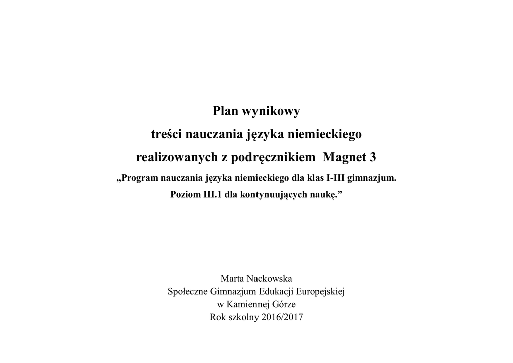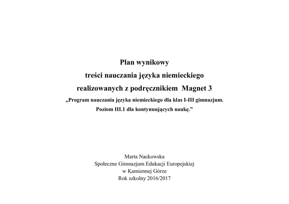 Plan wynikowy treści nauczania języka niemieckiego realizowanych z podręcznikiem Magnet 3 „Program nauczania języka niemieckiego dla klas I-III gimnazjum. Poziom III.1 dla kontynuujących naukę.” Marta Nackowska Społeczne Gimnazjum Edukacji Europejskiej w Kamiennej Górze Rok szkolny 2016/2017 Wymagania edukacyjne Treści nauczania / temat rozdziału Temat lekcji na ocenę dopuszczającą na ocenę dostateczną na ocenę dobrą na ocenę bardzo dobrą Popełniając liczne błędy (w tym zakłócające komunikację) uczeń: Popełniając liczne błędy niezakłócające komunikacji uczeń: Popełniając nieliczne błędy niezakłócające komunikacji uczeń: Nie popełniając błędów uczeń: Liczba lekcji Rozdział 1 : Meine Nachbarn, mein Stadtviertel Organisationsstunde.. Lekcja organizacyjna, zapoznanie z PSO i programem nauczania. Steffi stellt ihre Nachbarn vor – Steffi przedstawia swoich sąsiadów 1 Wo wohnen die Nachbarn von Steffi?- Gdzie mieszkają sąsiedzi Steffi 2 Hier dürfen Sie nicht parken!- Tutaj nie wolno parkować 3 3 – przedstawia i charakteryzuje inne osoby – identyfikuje pytania szczegółowe – określa przynależność – nazywa środki lokomocji – uzupełnia tabelę wyszukanymi w tekście informacjami – pisze notatkę na podstawie wzoru – selekcjonuje informacje w tekście słuchanym – identyfikuje przyimki lokalne z celownikiem – rozumie treść planu miasta – odpowiada na pytania zgodnie z informacjami na planie – nazywa środki lokomocji – przyporządkowuje zdania do podanych intencji – określa sposoby przemieszczania się – identyfikuje zwroty typowe dla wyrażania – prawidłowo stosuje zaimki dzierżawcze – pisze samodzielnie notatki na podstawie tekstów – opisuje wybrane miejsce – prawidłowo stosuje przyimki lokalne – prowadzi dialogi z użyciem poznanych struktur prośby, zakazu i przyzwolenia – pisze odpowiedzi na pytania zgodnie z podanym wzorem Wiederholung – powtórzenie wiadomości 1 Klassenarbeit - sprawdzian 1 Verbesserung der Klassenarbeit – omówienie i poprawa sprawdzianu 1 Rozdział 2 : Deutschland, Land der Superlative Wir lernen die Berühmten Persönlichkeiten kennen – Poznajemy sławne postaci 2 – zna zasady pisania dat – identyfikuje znane osoby – odpowiada na pytania na podstawie podanej biografii – przyporządkowuje usłyszane informacje do osób – charakteryzuje znane postaci – identyfikuje czasownik sein w Präteritum – pisze samodzielnie biografię znanej osoby – opracowuje wywiad ze znaną osobą Wir lernen die schönste Stadt Deutschlands kennen – Poznajemy najpiękniejsze miasto Niemiec 3 – opowiada o wybranym mieście – prawidłowo stosuje stopniowanie przymiotników – wyraża swoją opinię pozytywną lub negatywną o innych osobach Deutsche Autos sind am besten! – Niemieckie samochody są najlepsze! 2 – nazywa zabytki – porównuje osoby i rzeczy – wyraża swoją opinię na temat prezentowanych miast – czyta krótkie opisy miejsc – identyfikuje przymiotnik w stopniu wyższym i najwyższym – wyszukuje główną myśl tekstu – nazywa marki samochodów – czyta tekst selektywnie – porównuje przedmioty – rozumie teksty informacyjne – formułuje argumenty za i przeciw -– wyraża swoją opinię Rozdział 3 : Alles Gute zum Geburtstag – prawidłowo stopniuje przymiotniki – opowiada o wybranym samochodzie – udziela rad o wyborze modelu samochodu Wann hast du Geburtstag? – Kiedy masz urodziny? 2 – identyfikuje liczebniki porządkowe – rozpoznaje nazwy znaków zodiaku – zna zasady tworzenia liczebników porządkowych – wyszukuje określone informacje w tekście słuchanym – relacjonuje przebieg wydarzenia – pisze horoskop dla wybranej osoby – planuje i opisuje urodziny Wir schreiben eine Einladung – Piszemy zaproszenie 2 – uzupełnia tabelę usłyszanymi informacjami – wyraża powinność – identyfikuje czasownik sollen – identyfikuje zaimek osobowy w bierniku – stwierdza, czy tekst czytany zawiera określone informacje – tworzy dialogi według wzoru – zna zasady odmiany przymiotnika po rodzajniku nieokreślonym – pisze tekst zaproszenia według wzoru – prowadzi ankietę w klasie o sposobach obchodzenia urodzin – opowiada o swoich urodzinach Wir schreiben einen E-mail. – Piszemy E-mail. 2 – przyporządkowuje informacje do odpowiednich ilustracji – zna odmianę czasownika werden – uzupełnia tabelę wysłuchanymi informacjami – składa życzenia – rozumie treść instrukcji do gry – pisze e- maila według wzoru – uzyskuje i udziela informacji – prowadzi rozmowę według wzoru – prawidłowo stosuje czasownik werden – pisze samodzielnie e- maila – pisze instrukcje do gry towarzyskiej i przeprowadza ją w klasie Infobox Landeskunde Was feiern die Deutschen? Wiederholung – powtórzenie wiadomości 1 Uczeń systematyzuje gramatykę i słownictwo z rozdziału 3 Rozumie tekst informacyjny Klassenarbeit – sprawdzian 1 Verbesserung der Klassenarbeit – omówienie i poprawa sprawdzianu 1 1 Rozdział 4 : Wohin In Urlaub? Wohin verbringen wir den Urlaub? – Gdzie spędzamy urlop? 2 Urlaubspläne. Nicole sagt, - Plany wakacyjne. Nikola mówi, że…. dass... 3 Wie war das Wetter gestern? – Jaka była wczoraj pogoda? 3 – nazywa miejsca spędzania wakacji – nazywa czynności czasu wolnego – wyraża zdziwienie – rozumie zasadę stosowania konstrukcji zu+ bezokolicznik – identyfikuje przyimki lokalne – identyfikuje zdania przyczynowe – opisuje plany i zamierzenia wykorzystując podane słownictwo – porządkuje historyjkę obrazkową – identyfikuje zdania podrzędne a dass – nazywa kierunki świata – przytacza wypowiedzi osób trzecich – nazywa czynności czasu wolnego – selekcjonuje informacje – uzupełnia ankietę – identyfikuje przyimki lokalne – określa pogodę – zna odpowiednie strategie czytania – rozumie tekst informacyjny – uzysk