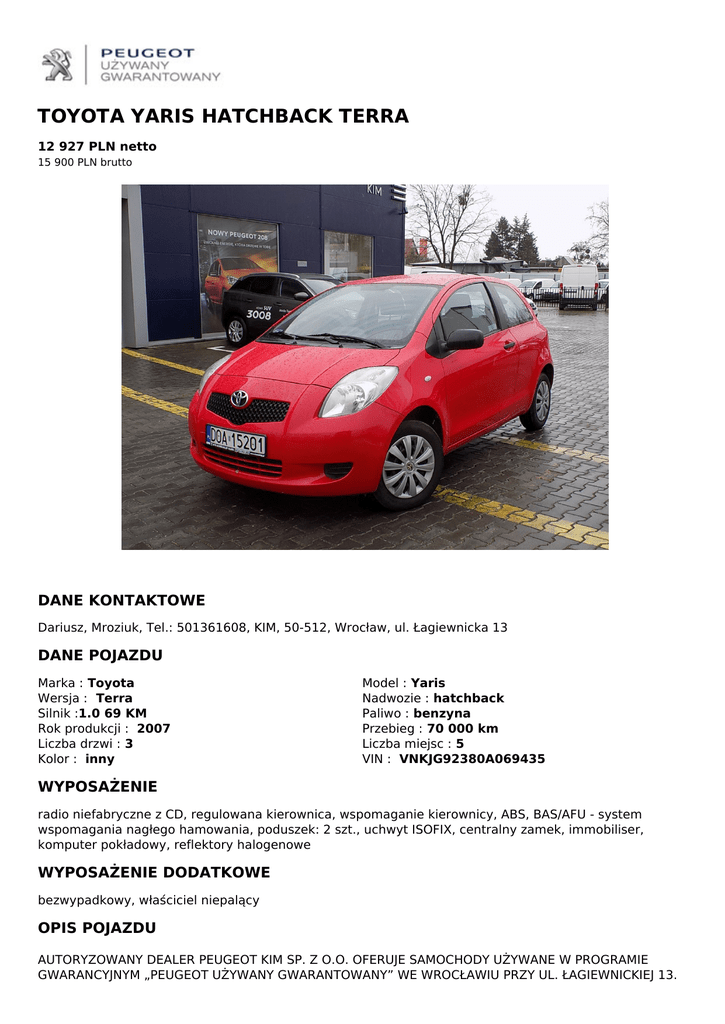 TOYOTA YARIS HATCHBACK TERRA 12 927 PLN netto 15 900 PLN brutto DANE KONTAKTOWE Dariusz, Mroziuk, Tel.: 501361608, KIM, 50-512, Wrocław, ul. Łagiewnicka 13 DANE POJAZDU Marka : Toyota Wersja : Terra Silnik :1.0 69 KM Rok produkcji : 2007 Liczba drzwi : 3 Kolor : inny Model : Yaris Nadwozie : hatchback Paliwo : benzyna Przebieg : 70 000 km Liczba miejsc : 5 VIN : VNKJG92380A069435 WYPOSAŻENIE radio niefabryczne z CD, regulowana kierownica, wspomaganie kierownicy, ABS, BAS/AFU - system wspomagania nagłego hamowania, poduszek: 2 szt., uchwyt ISOFIX, centralny zamek, immobiliser, komputer pokładowy, reflektory halogenowe WYPOSAŻENIE DODATKOWE bezwypadkowy, właściciel niepalący OPIS POJAZDU AUTORYZOWANY DEALER PEUGEOT KIM SP. Z O.O. OFERUJE SAMOCHODY UŻYWANE W PROGRAMIE GWARANCYJNYM „PEUGEOT UŻYWANY GWARANTOWANY” WE WROCŁAWIU PRZY UL. ŁAGIEWNICKIEJ 13. Opis pojazdu: -MOŻLIWOŚĆ KREDYTU BEZ WPŁATY I BEZ ZAŚWIADCZEŃ -PAKIET UBEZPIECZENIOWY AC/OC/NW NA ATRAKCYJNYCH WARUNKACH -PRZYJMUJEMY SAMOCHODY W ROZLICZENIU WSZYSTKICH MAREK -KUPUJĄCY ZWOLNIONY Z OPŁATY SKARBOWEJ 2% ZADZWOŃ I ZAPYTAJ O SZCZEGÓŁY, TEL : 501 36 16 08 WYPOSAŻENIE : ABS, ALARM centralny zamek z pilotem, el. lusterka komputer pokładowy, radio CD, wspomaganie kierownicy, ZADZWOŃ I ZAPYTAJ O SZCZEGÓŁY, TEL : 501 36 16 08 Dane zawarte w ofercie nie stanowią oferty w rozumieniu przepisów prawa polskiego. Treść ogłoszenia ma charakter wyłącznie informacyjny, w szczególności nie należy jej traktować jako wiążącego prawnie zobowiązania lub zapewnienia gwarancyjnego w rozumieniu art. 13. Ustawy z 27 lipca 2002 r. o szczególnych warunkach sprzedaży konsumenckiej – gwarancję stanowi wyłącznie dokument gwarancyjny wydany przez sprzedawcę. Zachęcamy do sprawdzenia samochodu przed zakupem i wykonania jazdy próbnej. Airbag kierowcy i pasażera, EBD - elektroniczny rozdział sił hamowania, Kolumna kierownicy regulowana w pionie, Immobilizer, Komputer pokładowy, Kontrolka zapięcia przednich pasów bezpieczeństwa, Lakier uni, Koło zapasowe dojazdowe, Tapicerka materiałowa, Radio CD, Tylne oparcie składane, dzielone, Wspomaganie układu kierowniczego, Uchwyty ISOFIX do mocowania fotelika dziecięcego, Tylna kanapa przesuwana, Lusterka boczne regulowane elektrycznie, Zderzaki w kolorze nadwozia, Wyłącznik poduszki powietrznej pasażera, ABS, BA - system wspomagania hamowania Pierwszy właściciel, Bezwypadkowy, Kupiony w ASO w Polsce, Pojazd regularnie serwisowany QR CODE DLA OGŁOSZENIA W SERWISIE UZYWANYGWARANTOWANY.PL Powered by TCPDF (www.tcpdf.org)