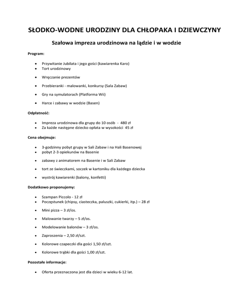 SŁODKO-WODNE URODZINY DLA CHŁOPAKA I DZIEWCZYNY Szałowa impreza urodzinowa na lądzie i w wodzie Program: Przywitanie Jubilata i jego gości (kawiarenka Karo) Tort urodzinowy Wręczanie prezentów Przebieranki - malowanki, konkursy (Sala Zabaw) Gry na symulatorach (Platforma Wii) Harce i zabawy w wodzie (Basen) Odpłatność: Impreza urodzinowa dla grupy do 10 osób - 480 zł Za każde następne dziecko opłata w wysokości 45 zł Cena obejmuje: 3-godzinny pobyt grupy w Sali Zabaw i na Hali Basenowej pobyt 2-3 opiekunów na Basenie zabawy z animatorem na Basenie i w Sali Zabaw tort ze świeczkami, soczek w kartoniku dla każdego dziecka wystrój kawiarenki (balony, konfetti) Dodatkowo proponujemy: Szampan Piccolo - 12 zł Poczęstunek (chipsy, ciasteczka, paluszki, cukierki, itp.) – 28 zł Mini pizza – 3 zł/os. Malowanie twarzy – 5 zł/os. Modelowanie balonów – 3 zł/os. Zaproszenia – 2,50 zł/szt. Kolorowe czapeczki dla gości 1,50 zł/szt. Kolorowe trąbki dla gości 1,00 zł/szt. Pozostałe informacje: Oferta przeznaczona jest dla dzieci w wieku 6-12 lat. Przyjęcie urodzinowe można zorganizować w godz.: 12.00-15.00 i 16.00-19.00. Termin należy ustalić w Sali Zabaw (tel. 68-412-15-16) co najmniej z tygodniowym wyprzedzeniem. Podczas przyjęcia należy przestrzegać Regulaminu Centrum, hali basenowej i Sali Zabaw. Przed rozpoczęciem urodzin obowiązkowo odbywa się rozmowa z ratownikiem na temat bezpieczeństwa.