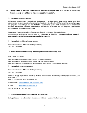 Załącznik nr 6a do SIWZ Szczegółowy przedmiot zamówienia, założenia projektowe oraz zakres oczekiwanej dokumentacji projektowej dla poszczególnych zadań. Nazwa nadana zamówieniu: Wykonanie dokumentacji budowlanej, budowlano – wykonawczej, programów konserwatorskich, dokumentacji kosztorysowej, dokumentacji aplikacyjnej w tym Studium Wykonalności oraz analizy popytu dla projektu partnerskiego pn. SKANSENOVA - systemowa opieka nad dziedzictwem w małopolskich muzeach na wolnym powietrzu planowanego do realizacji w ramach osi VIII Programu Operacyjnego Infrastruktura i Środowisko 2014 - 2020 W zakresie: Partnera Projektu – Skansenu w Sidzinie – Muzeum Kultury Ludowej, realizującego zamierzenie inwestycyjne pn. „Skansen w Sidzinie - Muzeum Kultury Ludowej poprawa wizerunku i ochrona dziedzictwa kulturowego”. Nazwa i adres obiektu budowlanego: Skansen w Sidzinie – Muzeum Kultury Ludowej 34 – 236 Sidzina bn. Kody i nazwy zamówienia wg Wspólnego Słownika Zamówień (CPV): USŁUGI PROJEKTOWE CPV: 71220000-6 – Usługi projektowania architektonicznego; CPV: 71320000-7 – Usługi inżynieryjne w zakresie projektowania, CPV: 71242000-6 - Przygotowanie przedsięwzięcia i projektu, oszacowanie kosztów. Nazwa i adres zamawiającego: Skansen w Sidzinie – Muzeum Kultury Ludowej 34 – 236 Sidzina bn. Wpis do Księgi Rejestrowej Instytucji Kultury prowadzonej przez Urząd Gminy Bystra-Sidzina, pod numerem III. NIP: 552-16-83-688, REGON: 120900357 Strona www: http://skansen.bystra-sidzina.net/ e’mail: [email protected] Tel: 18 269 90 01, 501 597 208 Imiona i nazwiska osób opracowujących wytyczne: Jadwiga Czarny – p. o. Dyrektora Skansenu w Sidzinie – Muzeum Kultury Ludowej 1 1. Opis ogólny przedmiotu zamówienia 1.1. Lokalizacja Województwo małopolskie, powiat suski, gmina Bystra-Sidzina, Sidzina. Teren zamierzenia projektowego obejmuje teren Skansenu w Sidzinie – Muzeum Kultury Ludowej, działki o numerach: 463/3, 462/7, 462/6, 463/4, 503/11, 503/12, 503/13, 503/14, 18188/3, 18188/4 oraz część działki nr ewid. 18173/11 obręb Sidzina. 1.2. Stan własności Powyższe działki stanowią własność Gminy Bystra-Sidzina, które zostały objęte przez muzeum na podstawie umowy użyczenia z Gminą Bystra-Sidzina na okres 12 lat, zawartej w dniu 21 października 2013 roku, aneksowanej w dniu 10 grudnia 2015 roku. 1.3. Ogólna charakterystyka lokalizacji Jednostka strukturalna - symbol planu 2UP/UT - teren zabudowy usług publicznych, zabudowy usług turystyki. Zapis jest zgodny z miejscowym planem zagospodarowania przestrzennego wsi Sidzina. Obszar objęty opracowaniem projektowym nie podlega ochronie Konserwatora Zabytków. 1.4. Ogólna charakterystyka obiektów - Chałupa Anny Kozioł – nr inw. MKL - 4/MN Budynek pochodzi z 1901 roku, został przeniesiony do Sidziny ze Spytkowic. Jest to typ chałupy zrębowej, w której organizowane są wystawy, spotkania, itp. Eksponat kubaturowy z wyposażeniem etnograficznym. - Chałupa Wójta Maja – nr. inw. MKL - 3/MN Chałupa pochodzi z Sidziny, z II połowy XVIII wieku. Ekspozycja ukazuje wszelkiego rodzaju przedmioty, narzędzia średniozamożnej rodziny z II połowy XVIII wieku. Eksponat kubaturowy z wyposażeniem etnograficznym - chałupa wyposażona również w warsztat tkacki oraz sprzęt pomocniczy. - Chałupa Banasika – nr. inw. MKL - 1/MN Budynek przeniesiony z przysiółka Mała Sidzina, pochodzący z 1807 roku. Jest to chałupa zrębowa z wysoką kamienną podmurówką, podpiwniczona, nakryta dachem gontowym przyczółkowonaczółkowym Eksponat kubaturowy z wyposażeniem etnograficznym - wnętrza są wyposażone w sprzęt domowy i elementy wystroju ludowego typowego dla pierwszej połowy XIX wieku m.in. garnki, miski, odcedzarki, żarna, narzędzia do obróbki lnu i wełny, meble oraz zbiór obrazów. W wozowni znajduje się pompa strażacka z XIX wieku. 1.5. Charakterystyczne parametry określające wielkość obiektów - Chałupa Anny Kozioł Powierzchnia zabudowy: Powierzchnia użytkowa: Kubatura netto V: 82,15 m2 68 m2 368 m3 2 Liczba kondygnacji (łącznie z piwnicą): 1 - Chałupa Wójta Maja Powierzchnia zabudowy: 81,2 m2 Powierzchnia użytkowa: 54,5 m2 Kubatura netto V: 297 m3 Liczba kondygnacji (łącznie z piwnicą): - Chałupa Banasika Powierzchnia zabudowy (chałupa + przyległa do niej wozownia): 67,1 m2 Powierzchnia użytkowa (chałupa + przyległa do niej wozownia): 114 m2 Kubatura netto V (chałupa + przyległa do niej wozownia): 238 m3 Liczba kondygnacji (łącznie z piwnicą): 2 Budynek jest podpiwniczony pod całą powierzchnią chałupy. 1.6. Ogólna ocena stanu technicznego obiektów 1. Chałupa Anny Kozioł Dach – stan zły (zaleca się natychmiastową wymianę połaci dachowej), Ściany – stan dobry, Podmurówka – stan dobry, 2. Chałupa Wójta Maja Dach – stan zły (zaleca się natychmiastową wymianę połaci dachowej), Ściany – stan dobry (zaleca się uszczelnienie szpar gliną i pomalowanie; zaleca się wymianę okien), Podmurówka – stan dobry, 3. Chałupa Banasika 1.7. Dach – stan dobry, Ściany – stan dobry, Podmurówka – stan dobry, Charakterystyka planowanych robót konserwatorskich, budowlanych, remontowych i instalacyjnych itp. 1. Chałupa Anny Kozioł Demontaż pokrycia dachowego z gontu drewnianego na powierzchni ok. 220m 2, wraz z uporządkowaniem materiału rozbiórkowego, sprawdzeniem elementów więźby dachowej i ewentualnym uzupełnieniem (wymianą) zniszczonych elementów. Wykonanie i montaż nowego pokrycia dachowego o powierzchni ok. 220m 2 z gontu iglastego łupanego (ok. 60cm) impregnowanego ciśnieniowo. Stworzenie muzeum multimedialnego wsi Sidzina na całej powierzchni chałupy, poprzez zakup i montaż wyposażenia w postaci: Lp. Nazwa Opis techniczny SPRZĘT 3 Liczba sztuk 1. 2. 3. 4. 5. 6. Kiosk multimedialny totem Ramki cyfrowe Ramki zwykłe, wydruk Ekrany dotykowe Tablet multimedialny Słuchawki przewodowe Aplikacja - mapa reg