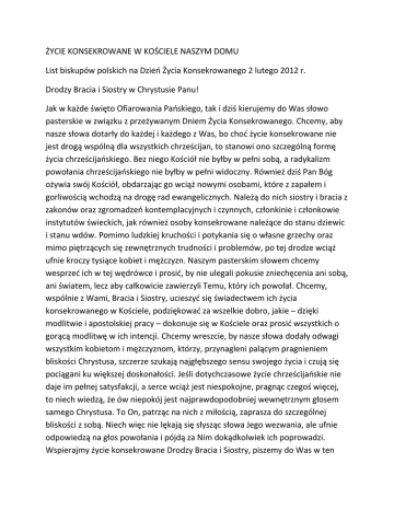 ŻYCIE KONSEKROWANE W KOŚCIELE NASZYM DOMU List biskupów polskich na Dzieo Życia Konsekrowanego 2 lutego 2012 r. Drodzy Bracia i Siostry w Chrystusie Panu! Jak w każde święto Ofiarowania Paoskiego, tak i dziś kierujemy do Was słowo pasterskie w związku z przeżywanym Dniem Życia Konsekrowanego. Chcemy, aby nasze słowa dotarły do każdej i każdego z Was, bo chod życie konsekrowane nie jest drogą wspólną dla wszystkich chrześcijan, to stanowi ono szczególną formę życia chrześcijaoskiego. Bez niego Kościół nie byłby w pełni sobą, a radykalizm powołania chrześcijaoskiego nie byłby w pełni widoczny. Również dziś Pan Bóg ożywia swój Kościół, obdarzając go wciąż nowymi osobami, które z zapałem i gorliwością wchodzą na drogę rad ewangelicznych. Należą do nich siostry i bracia z zakonów oraz zgromadzeo kontemplacyjnych i czynnych, członkinie i członkowie instytutów świeckich, jak również osoby konsekrowane należące do stanu dziewic i stanu wdów. Pomimo ludzkiej kruchości i potykania się o własne grzechy oraz mimo piętrzących się zewnętrznych trudności i problemów, po tej drodze wciąż ufnie kroczy tysiące kobiet i mężczyzn. Naszym pasterskim słowem chcemy wesprzed ich w tej wędrówce i prosid, by nie ulegali pokusie zniechęcenia ani sobą, ani światem, lecz aby całkowicie zawierzyli Temu, który ich powołał. Chcemy, wspólnie z Wami, Bracia i Siostry, ucieszyd się świadectwem ich życia konsekrowanego w Kościele, podziękowad za wszelkie dobro, jakie – dzięki modlitwie i apostolskiej pracy – dokonuje się w Kościele oraz prosid wszystkich o gorącą modlitwę w ich intencji. Chcemy wreszcie, by nasze słowa dodały odwagi wszystkim kobietom i mężczyznom, którzy, przynagleni palącym pragnieniem bliskości Chrystusa, szczerze szukają najgłębszego sensu swojego życia i czują się pociągani ku większej doskonałości. Jeśli dotychczasowe życie chrześcijaoskie nie daje im pełnej satysfakcji, a serce wciąż jest niespokojne, pragnąc czegoś więcej, to niech wiedzą, że ów niepokój jest najprawdopodobniej wewnętrznym głosem samego Chrystusa. To On, patrząc na nich z miłością, zaprasza do szczególnej bliskości z sobą. Niech więc nie lękają się słysząc słowa Jego wezwania, ale ufnie odpowiedzą na głos powołania i pójdą za Nim dokądkolwiek ich poprowadzi. Wspierajmy życie konsekrowane Drodzy Bracia i Siostry, piszemy do Was w ten szczególny dzieo również dlatego, że życie konsekrowane i troska o jego rozwój są sprawą całego Kościoła. Jeśli chcemy, by kolejne kobiety i kolejni mężczyźni wielkodusznie i całkowicie powierzali się Panu Bogu i tylko w Nim składali całą swoją ufnośd, to – jako chrześcijanie – nie możemy ani ich samych, ani ich powołania zostawid bez modlitewnego, duchowego i materialnego wsparcia. Hasło obecnego roku duszpasterskiego przypomina nam, że Kościół jest naszym wspólnym domem. Wiemy, że nie ma domu bez współodpowiedzialności, bez wzajemnego wsparcia i pomocy wszystkich członków rodziny. Jak każde powołanie, również powołanie do życia całkowicie poświęconego Bogu w zakonach i zgromadzeniach, w instytutach świeckich czy w indywidualnych formach życia konsekrowanego, wyrasta głównie z atmosfery domowego ciepła i rodzinnego wsparcia. Nikt nikogo nie może wyręczyd w przeżywaniu własnego powołania, ale pomoc i dobry przykład innych są w tym względzie nieocenione. Nie inaczej jest też z powołaniem do życia konsekrowanego. Wyrasta ono zarówno w atmosferze domu rodzinnego, jak i w domu, którym jest Kościół. Kształtuje się więc dzięki przykładowi tych, którzy ten Kościół tworzą i dojrzewa dzięki gorącej modlitwie tych, którzy nie mogąc podejmowad wielkich działao apostolskich, otulają Kościół ciepłym płaszczem modlitwy i serdeczności. Odnajdźmy siebie w scenie Ofiarowania Fragment Ewangelii według św. Łukasza, odczytany w dzisiejszej liturgii, ukazuje nam scenę ofiarowania Jezusa w jerozolimskiej świątyni. Przez pryzmat tego wydarzenia możemy spojrzed również na powołanie i życie konsekrowane. W centrum uwagi znajduje się sam Pan Jezus. Ofiarowujący się Bogu, przez ręce Maryi i Józefa, wyraża najgłębszą istotę i jest doskonałym wzorem każdego powołania do życia radami ewangelicznymi. Wszyscy wstępujący na drogę życia konsekrowanego chcą naśladowad Chrystusa i Jego całkowite oddanie się Bogu. Zachwyca ich bowiem miłośd i wolnośd do jakiej uzdalnia bezgraniczne powierzenie się Bogu. Jak bardzo potrzeba nam osób, które zafascynują się Chrystusem do tego stopnia, że wobec perspektywy bliskości z Nim wszystko inne stanie się mało ważne! W tej scenie obecni są również Rodzice. Para młodych małżonków przynosi do świątyni pierworodne Dziecko, aby ofiarowad Je Bogu. Chociaż kochają Je najgoręcej jak potrafią, wiedzą, że nie należy Ono tylko do nich, lecz jest darem Boga. Jak bardzo potrzeba nam dzisiaj takich rodziców, którzy – obdarzając swe dzieci czułą miłością – mają świadomośd, że nie są one jedynie ich własnością, ale przede wszystkim należą do Boga. Jak bardzo potrzeba takich rodziców, którzy – będąc wierni miłości rodzicielskiej i pragnąc dobra dla swoich dzieci – uczą je ofiarowad swoje życie dla Boga i dla drugich, nawet jeśli pociąga to za sobą trudności i wyrzeczenia. Chod niekiedy sami rodzice mogą doświadczad bólu rozłąki, to jednak Boża miłośd i opatrznośd może byd dla nich źródłem pokoju i radości. W scenie ofiarowania jest obecny również prorok Symeon i podeszła w latach wdowa, prorokini Anna. Chod oboje są boleśnie doświadczeni przez życie – czy to starością, czy wdowieostwem – nie zamykają się we własnym cierpieniu, nie gorzknieją w ciągłym narzekaniu, ale zadomowieni w świątyni, nie rozstają się z nią, „służąc Bogu w