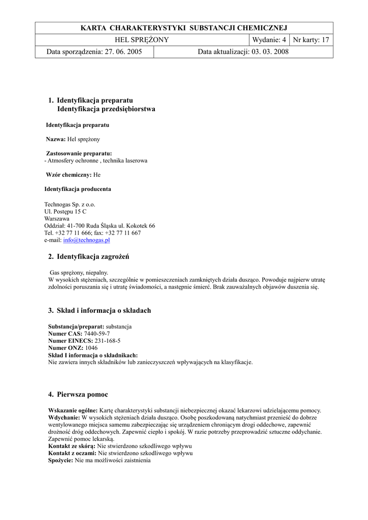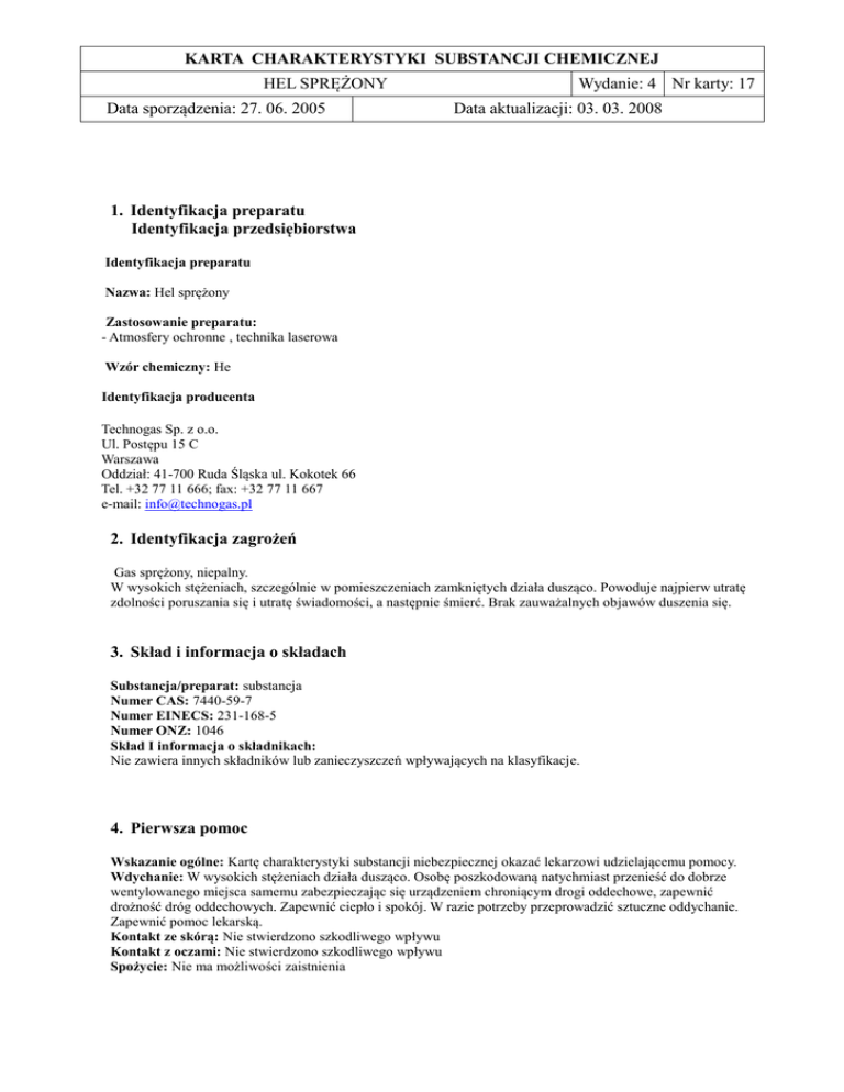 KARTA CHARAKTERYSTYKI SUBSTANCJI CHEMICZNEJ HEL