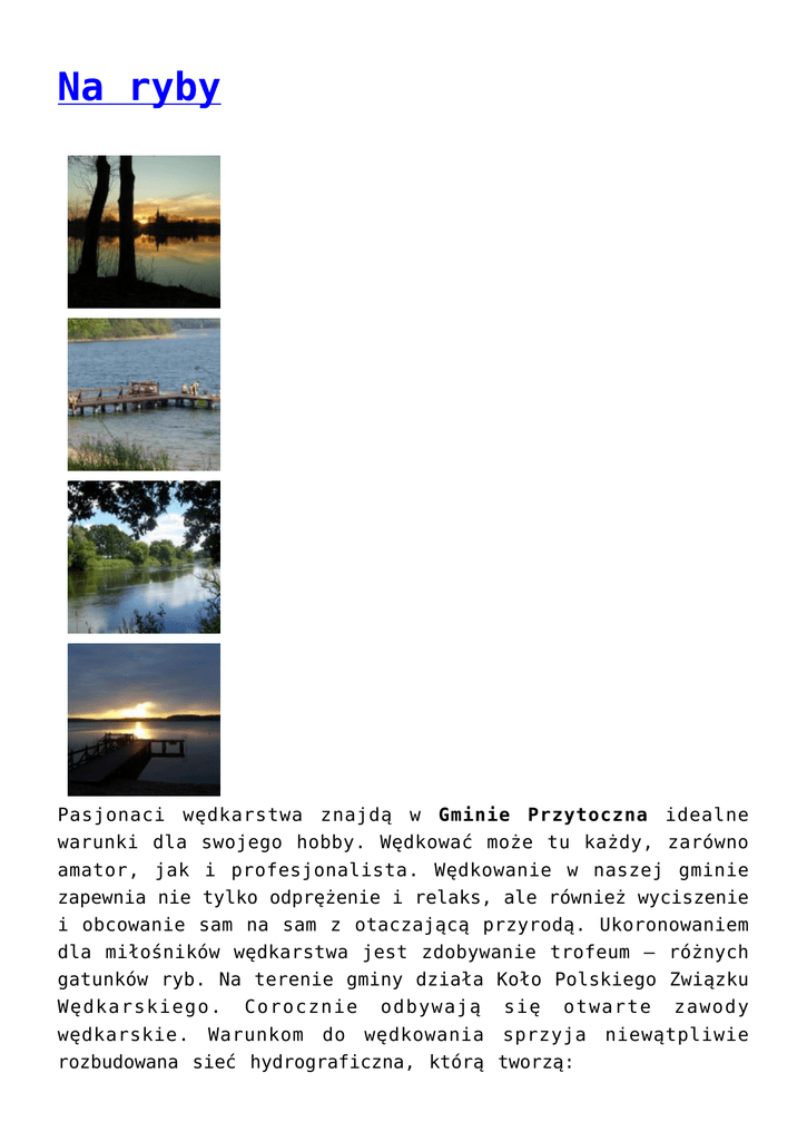 Na ryby Pasjonaci wędkarstwa znajdą w Gminie Przytoczna idealne warunki dla swojego hobby. Wędkować może tu każdy, zarówno amator, jak i profesjonalista. Wędkowanie w naszej gminie zapewnia nie tylko odprężenie i relaks, ale również wyciszenie i obcowanie sam na sam z otaczającą przyrodą. Ukoronowaniem dla miłośników wędkarstwa jest zdobywanie trofeum – różnych gatunków ryb. Na terenie gminy działa Koło Polskiego Związku Wędkarskiego. Corocznie odbywają się otwarte zawody wędkarskie. Warunkom do wędkowania sprzyja niewątpliwie rozbudowana sieć hydrograficzna, którą tworzą: a) Warta i jej dopływy: Struga Lubikowska, kanały: Dłusko, Poręba, Orłowce, b) Jeziora: Lubikowskie o pow. 308,80 ha Rokitno o pow. 61,5 ha Przytoczno o pow. 26 ha Żabno (Żabie) I i II o pow. 10,9 i 7,10 ha Wierzbno o pow. 18,16 ha Płotkowe o pow. 9,78 ha Nadolno o pow. 4,06 ha Mniszek o pow. 4,39 ha Jeziora Lubikowskie i Rokitniańskie położone są w strefie Pszczewskiego Parku Krajobrazowego dlatego ich wody podlegają szczególnej ochronie. Ponadto na terenie gminy znajdują się niewielkie stawy, starorzecza oraz zbiorniki potorfowiskowe o znaczeniu lokalnym. Jezioro Lubikowskie – jest największym i najgłębszym jeziorem na terenie gminy o powierzchni 314,7 ha i 36 m głębokości. Biorąc pod uwagę wielkość jezior Pojezierza Lubuskiego plasuje się ono na 4 miejscu. Ma urozmaiconą linię brzegową oraz wiele zatok. W jego południowo-wschodniej części znajduje się malownicza wyspa, nazywana przez miejscową ludność „Wyspą Konwaliową” (ok. 5 ha pow.). Wyspę w całości porasta gęsty las bukowy z licznymi stanowiskami starych dębów i innych drzew liściastych. Podszycie lasu stanowi masowo rosnąca konwalia i paproć orlica. Rośnie tu również lilia złotogłów. Z zachodniej strony wyspy widoczny jest wysoki, przeciwległy brzeg zwany „ Górą Czarownic”, wcinający się w jezioro długim, wąskim półwyspem. Nieco dalej wznosi się „Góra Borsucza”. Wzgórza owiane są legendami. Osobliwością jeziora jest jego przezroczysta woda o niewielkiej zlewni w okolicach sąsiednich gmin i Pszczewskiego Parku Krajobrazowego. Ta czystość wody umożliwia oglądanie dna nawet do głębokości 5-7 m, co stwarza idealne warunki do podwodnych wojaży płetwonurków. Jezioro doskonale nadaje się też do uprawiania żeglarstwa. Atrakcje te uzupełniają: sport wędkarski – szczególnie z kajaków lub łodzi oraz polowanie na ptactwo wodne. Jezioro z rybackiego punktu widzenia jest typem sielawowym, średnio żyznym, głębokim. Licznie są tu reprezentowane: okoń, szczupak, węgorz, miętus, leszcz i płoć – mniej lin i krasnopióra. Dobre warunki do wypoczynku i spacerów zapewniają pobliskie lasy obfitujące w poziomki, jagody, jeżyny, orzechy laskowe i grzyby. Wschodnie brzegi jeziora zaroiły się od domków turystycznych. Wyjątkowo twarde i piaszczyste dno oraz łagodnie nachylone stoki tej części jeziora stwarzają wymarzone miejsce do plażowania i odbywania kąpieli. Drugim pod względem wielkości i atrakcyjności turystycznej w gminie jest jezioro Rokitno, leżące w południowej części gminy. Jego powierzchnia wynosi 61 ha, a głębokość 13 m. Jest to jezioro bezodpływowe o zaawansowanej eurofizacji, o zlewni cząstkowej w obszarze gminy Przytoczna i Pszczewskiego Parku Krajobrazowego. Przeźroczystość wody w okresie wiosny wynosi 3 m ze względu na występowania charakterystycznych gatunków ryb zaliczane jest do typu jeziora sielawego. Jezioro to niegdyś było połączone z jez. Lubikowskim. Położone jest ono malowniczo pośród lasów. Jezioro Przytoczno – o znacznie mniejszej powierzchni wynoszącej 26 ha to przepływowym zbiornik wodny, położonym w środkowej części gminy. Niewielkimi jeziorami są Żabno I (powierzchnia 10,9 ha) oraz Żabno II (powierzchnia 7,10 ha). Znajdują się one w południowo-zachodniej stronie gminy Przytoczna. Te dwa jeziora mają charakter jezior rynnowych. Są wydłużone, przypominając niekiedy doliny rzeczne. Wyróżniają się charakterystyczną, prawie równoległą linią brzegową. Występują razem, układając się w charakterystyczne ciągi. Dna tych jezior są bardzo urozmaicone. Wyżej wymienione akweny mają III klasę czystości, ale są ku temu starania by zapewnić II klasę czystości w parametrach biologicznych i fizycznochemicznych. Ponadto znajdują się niewielkie jeziora, stawy i starorzecza oraz zbiorniki potorfowiskowe. Woda naszych jezior charakteryzuje się dużą przezroczystością, co sprowadza w te strony płetwonurków z całej Polski. To również raj dla wędkarzy, którzy mogą złowić sandacza, szczupaka lub suma, a nawet sielawę czy liczne ryby planktonowe bądź roślinożerne. Północną granicę gminy Przytoczna stanowi rzeka Warta rozlewiskami i starorzeczami, z urokliwymi łąkami, szczególnie pięknie wyglądającymi wiosną. Prawie cały obszar gminy należy do zlewni rzeki Warty, jedynie południowa jego część leży w zlewni pośredniej Obry.