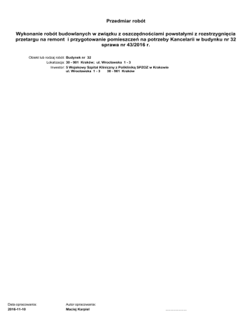 Przedmiar robót Wykonanie robót budowlanych w związku z oszczędnościami powstałymi z rozstrzygnięcia przetargu na remont i przygotowanie pomieszczeń na potrzeby Kancelarii w budynku nr 32 sprawa nr 43/2016 r. Obiekt lub rodzaj robót: Budynek nr 32 Lokalizacja: 30 - 901 Kraków; ul. Wrocławska 1 - 3 Inwestor: 5 Wojskowy Szpital Kliniczny z Polikliniką SPZOZ w Krakowie ul. Wrocławska 1 - 3 30 - 901 Kraków Data opracowania: 2016-11-10 Autor opracowania: Maciej Karpiel ...................... ZUZIA11 (C) Datacomp 1994-2014 (lic. 00052E8B) Uzasadnienie Zakres robót: I. Dostawa i montaż rolet zewnętrznych do okien w pomieszczeniach Kancelarii. Wymiar okien ok. 95x230 cm – 6 szt. Specyfikacja rolety: • Rolety zewnętrzne aluminiowe, • Doprowadzenie zasilania do rolet z wewnętrznego korytarza pom. nr 22, • Sterowanie rolet pilotem, • Silnik typu INEL 8/10R lub równoważny, • Roleta wykonana z profili V42, • Zastosowanie blokady kątowej wewnątrz skrzynki przeciwyważeniowej. II. Montaż klimatyzatorów w pomieszczeniu nr 6 oraz nr 21. Specyfikacja wykonania: • 1x jednostka zewnętrzna multisplit zamontowana na zewnętrznej ścianie budynku przystosowana do pracy całorocznej, • 2x jednostka wewnętrzna split ścienny • 2x odpływ skroplin grawitacyjnie na zewnątrz budynku do rynny • 1 x zasilanie do jednostki zewnętrznej • 2x zasilanie i sterowanie do jednostki wewnętrznej • 2 x układ zasilający gazowy R410 A pomiędzy jednostkami • długość linii freonowej do 15mb • 1 x konsola montażowa pod jednostkę zewnętrzną • sterowanie poprzez pilot sterujący przyporządkowany do każdej jednostki wewnętrznej. • okres gwarancji min. 5 lat obejmujący usługę serwisową w tym okresie Wymiary pomieszczenia nr 6 – 4,10 x 7,00 x 2,90 m Wymiary pomieszczenia nr 21 – 2,70 x 5,00 x 3,00 m III. Dostawa i montaż pólek wiszących Specyfikacja pólek • wymiary 140x40x36 cm (szer. x wys. x głęb.) • pólka wisząca – dwie płyty meblowe laminowane 18 mm równoległe do siebie połączone prostopadle w trzech miejscach, obrzeza okleina meblowa 2 mmm. Wymagana odporność na środki dezynfekujące. Kolor dąb Amerykański nr 3101 z palety PFLEIDERER. • Wymiary półki dostosowane do przechowywania segregatorów. 1.3. Dostęp do wody i energii elektrycznej możliwy jest na remontowanym obiekcie. Plac budowy zostanie protokolarnie przekazany po uprawomocnieniu się procedur przetargowych i podpisaniu umowy. 1.4.Roboty prowadzone będą w czynnym obiekcie, dlatego prace należy zorganizować w taki sposób, aby umożliwić pracującym tam osobom wykonywanie obowiązków służbowych. 1.5.Na terenie 5 Wojskowego Szpitala Klinicznego obowiązuje zakaz palenia tytoniu. 1.6.Ostateczny wybór kolorystki rolet należy ustalić z Użytkownikiem. 1.7.Teren wokół wykonywanych robót należy zabezpieczyć przed dostępem osób trzecich. W trakcie prowadzenia w/w robót należy utrzymać w czystości drogi, po których będzie odbywała sie komunikacja. 1.8. Materiały z demontażu Wykonawca usunie na własny koszt . Przedmiar robót <-NR-> <-PODST-> Nr 1 1.1 1.2 1.3 Podstawa Kosztorys Element Kalkulacja indywidualna Kalkulacja indywidualna Kalkulacja indywidualna <-OPIS-> <-JEDN-> Opis robót <-ILOSC-> Jm Ilo¶ć Wykonanie robót budowlanych w związku z oszczędnościami powstałymi z rozstrzygnięcia przetargu na remont i przygotowanie pomieszczeń na potrzeby Kancelarii w budynku nr 32 sprawa nr 43/2016 r. Rolety zewnętrzne Roleta zewnętrzna 0,95*2,3 - 6 szt. m2 13,1 szt. 6 szt. 4 Siłowniki Pilot do sterowania roletami strona nr: 2 ZUZIA11 (C) Datacomp 1994-2014 (lic. 00052E8B) <-NR-> <-PODST-> Nr Podstawa 1.4 Kalkulacja indywidualna 2 Element 2.1 Kalkulacja indywidualna 2.2 Kalkulacja indywidualna 2.3 Kalkulacja indywidualna 2.4 Kalkulacja indywidualna 2.5 Kalkulacja indywidualna 2.6 Kalkulacja indywidualna 2.7 Kalkulacja indywidualna 2.8 Kalkulacja własna 3 Element 3.1 Kalkulacja indywidualna <-OPIS-> <-JEDN-> Opis robót <-ILOSC-> Jm Ilo¶ć Instalacja zasilająca do rolet kpl. 6 szt. 1 szt. 1 szt. 1 kpl. 2 kpl. 1 kpl. 2 kpl. 1 kpl. 1 kpl. 3 Klimatyzacja Agregat zewnętrzny multisplit o mocy chłodniczej 6,0 kW i mocy grzewczej 5,5 kW - system pracy całorocznej Jednostka wewnętrzna typu split ścienny o mocy chłodniczej 2,1 kW i mocy grzewczej 2,6 kW Jednostka wewnętrzna typu split ścienny o mocy chłodniczej 2,1 kW i mocy grzewczej 2,6 kW Układ odprowadenia skroplin Układ doprowadzenia zasilania 230V do agregatu zewnętrznego Układ sterujący i gazowy pomiędzy jednostkami klimatyzacyjnymi Montaż Usługa serwisowa w okresie gwarancji Element Dostawa i montaż półki wiszącej o wymiarach ( szer.x wysokośc x głębokość) 140x40x36 cm w kolorze strona nr: 3 ZUZIA11 (C) Datacomp 1994-2014 (lic. 00052E8B) Spis treści A. Uzasadnienie. . . . . . . . . . . . . . . . . . . . . . . . . . . . . . . . . . . . . . . . . . . . . . . . . . . . . . . . . . . . . . . . . . . . . . . . . . . . . . . . . . . . . . . . . . . . . . . . . . . . . . . . . . . .2. . . . B. Przedmiar robót. . . . . . . . . . . . . . . . . . . . . . . . . . . . . . . . . . . . . . . . . . . . . . . . . . . . . . . . . . . . . . . . . . . . . . . . . . . . . . . . . . . . . . . . . . . . . . . . . . . . . . . . . 2. . . . . 1. Rolety zewnętrzne. . . . . . . . . . . . . . . . . . . . . . . . . . . . . . . . . . . . . . . . . . . . . . . . . . . . . . . . . . . . . . . . . . . . . . . . . . . . . . . . . . . . . . . . . . . . . . . . . . . . . . . .2. . . . 2. Klimatyzacja. . . . . . . . . . . . . . . . . . . . . . . . . . . . . . . . . . . . . . . . . . . . . . . . . . . . . . . . . . . . . . . . . . . . . . . . . . . . . . . . . . . . . . . . . . . . . . . . . . . . . . . . . . . . 3. . . . . 3. Element. . . . . . . . . . . . . . . . . . . . . . . . . . . . . . . . . . . . . . . . . . . . . . . . . . . . . . . . . . . . . . . . . . . . . . . . . . . . . . . . . . . 