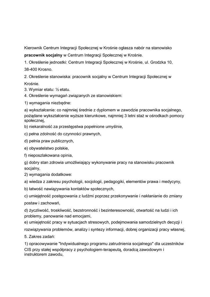 Kierownik Centrum Integracji Społecznej w Krośnie ogłasza nabór na stanowisko pracownik socjalny w Centrum Integracji Społecznej w Krośnie. 1. Określenie jednostki: Centrum Integracji Społecznej w Krośnie, ul. Grodzka 10, 38-400 Krosno. 2. Określenie stanowiska: pracownik socjalny w Centrum Integracji Społecznej w Krośnie. 3. Wymiar etatu: ½ etatu. 4. Określenie wymagań związanych ze stanowiskiem: 1) wymagania niezbędne: a) wykształcenie: co najmniej średnie z dyplomem w zawodzie pracownika socjalnego, poŜądane wykształcenie wyŜsze kierunkowe, najmniej 3 letni staŜ w ośrodkach pomocy społecznej, b) niekaralność za przestępstwa popełnione umyślnie, c) pełna zdolność do czynności prawnych, d) pełnia praw publicznych, e) obywatelstwo polskie, f) nieposzlakowana opinia, g) dobry stan zdrowia umoŜliwiający wykonywanie pracy na stanowisku pracownik socjalny, 2) wymagania dodatkowe: a) wiedza z zakresu psychologii, socjologii, pedagogiki, elementów prawa i medycyny, b) łatwość nawiązywania kontaktów społecznych, c) umiejętność postępowania z ludźmi poprzez przekonywanie i nakłanianie do zmiany postaw i zachowań, d) Ŝyczliwość, troskliwość, bezstronność i bezinteresowność, otwartość na ludzi i ich problemy, panowanie nad emocjami, e) umiejętność pracy w sytuacjach stresowych, podejmowania samodzielnych decyzji i rozwiązywania problemów, analizy i syntezy informacji, dobrej organizacji pracy własnej, 5. Zakres zadań: 1) opracowywanie "Indywidualnego programu zatrudnienia socjalnego" dla uczestników CIS przy stałej współpracy z psychologiem-terapeutą, doradcą zawodowym i instruktorem zawodu, 2) nadzór nad realizacją zadań zawartych w "Indywidualnym programie zatrudnienia socjalnego" uczestników przez cały okres jego trwania, 3) opiniowanie wniosków w sprawie przedłuŜenia, zakończenia okresu uczestnictwa w zajęciach lub skierowania do zatrudnienia wspieranego, 4) stała współpraca z pracownikami socjalnymi MOPR w Krośnie oraz pracownikami innych instytucji, 5) nadzorowanie działania grup wsparcia i grup samopomocowych, 6) współuczestnictwo w prowadzeniu zajęć i warsztatów terapeutycznych, 7) ewaluacja przebiegu realizacji programu CIS, 8) zbieranie i realizacja zamówień dotyczących zapotrzebowania na zakup materiałów związanych z działalnością CIS, 6. Wymagane dokumenty: 1) list motywacyjny z uzasadnieniem przystąpienia do naboru, 2) Ŝyciorys z opisem przebiegu pracy zawodowej, 3) poświadczona przez kandydata za zgodność z oryginałem ,kopia dowodu osobistego lub innego dokumentu potwierdzającego toŜsamość oraz poświadczającego obywatelstwo kandydata, 4) oryginały lub poświadczone przez kandydata za zgodność z oryginałem kopie dokumentów potwierdzających posiadanie wymaganego staŜu pracy na stanowisku pracownik socjalny, 5) poświadczone przez kandydata za zgodność z oryginałem kopie dokumentów potwierdzających posiadanie wymaganego wykształcenia, 6) oświadczenie pod rygorem odpowiedzialności karnej, Ŝe kandydat ma pełną zdolność do czynności prawnych i korzysta z praw publicznych, 7) oświadczenie, Ŝe kandydat wyraŜa zgodę na przetwarzanie danych osobowych zgodnie z ustawą z dnia 29 sierpnia 1997 r. o ochronie danych osobowych (Dz. U. z 2002r nr.101, poz. 926 z późn. zm.) w celu przeprowadzenia naboru na stanowisko pracownik socjalny, 7. Informacja o warunkach pracy na stanowisku: 1) stanowisko pracy zlokalizowane na parterze budynku, przy ul. Grodzkiej 10 w Kroś nie 2) praca siedząco-chodząca z przewagą wysiłku umysłowego, 3) praca przy komputerze wyposaŜonym w monitor ekranowy, wymagająca sprawności obu rąk, 4) praca wymagająca duŜej koncentracji z naraŜeniem na obciąŜenie psychiczne, 5) praca wymagająca dobrej ostrości wzroku, dobrego słuchu i wysiłku głosowego, Postępowanie kwalifikacyjne przeprowadzone zostanie w oparciu o przepisy ustawy z dnia 21 listopada 2008 r. o pracownikach samorządowych (Dz. U. z 2008 r., Nr 223, poz. 1458 z późn. zm.). Wymagane dokumenty naleŜy składać w siedzibie Centrum Integracji Społecznej w Krośnie ul. Grodzka 10, 38-400 Krosno w terminie do dnia 11 grudnia 2013 roku włącznie – decyduje data wpływu, w zamkniętej kopercie z napisem „ Nabór na stanowisko pracownika socjalnego w Centrum Integracji Społecznej w Krośnie” . Kandydaci zostaną telefonicznie powiadomieni o terminie rozmowy kwalifikacyjnej. Osoba do kontaktu; Roman Petta Tel.134743904