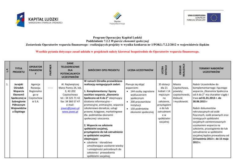 Program Operacyjny Kapitał Ludzki Poddziałanie 7.2.2 Wsparcie ekonomii społecznej Zestawienie Operatorów wsparcia finansowego - realizujących projekty w wyniku konkursu nr 1/POKL/7.2.2/2012 w województwie śląskim Jurajski Agencja Ośrodek Rozwoju Wsparcia Regionalne Ekonomii go w Społecznej w Częstochow Subregionie ie S.A. Północnym Województw a Śląskiego ------ Al. Najświętszej Maryi Panny 24, lok. 3, 42-202 Częstochowa tel.: 34 325 71 42 fax: 34 360 57 47 e-mail: [email protected] www.jowes.pl SKRÓCONY OPIS PROJEKTU W ramach Ośrodka przewidziano realizację następujących zadao: LICZBA UCZESTNIKÓW Planuje się objąd wsparciem: 1. Komplementarny i łączny 144 osoby zagrożone wachlarz wsparcia „Ekonomia wykluczeniem Społeczna od A do Z” obejmujący społecznym działania informacyjno – 200 pracowników promocyjne, animacyjne, wsparcie instytucji szkoleniowo-doradcze, usługi 150 podmiotów prawne, księgowe, marketingowe ekonomii społecznej dla podmiotów ekonomii społecznej i otoczenia. 2. Wsparcie na założenie spółdzielni socjalnej, przystąpienie do lub zatrudnienie w spółdzielni socjalnej obejmujące: szkolenie i doradztwo umożliwiające uzyskanie wiedzy i umiejętności potrzebnych do założenia i prowadzenia spółdzielni socjalnej; LICZBA DOTACJI DANE TELEADRESOWE DLA POTENCJALNYCH UCZESTNIKÓW 35 dotacji dla 21 kobiet i 14 mężczyzn na założenie, przystąpieni e do lub zatrudnieni ew spółdzielni socjalnej OBSZAR REALIZACJI 1. TYTUŁ PROJEKTU OPERATOR FINANSOW Y PARTNER L.P. Wszelkie pytania dotyczące zasad udziału w projektach należy kierować bezpośrednio do Operatorów wsparcia finansowego. TERMINY NABORÓW UCZESTNIKÓW Miasto Częstochowa, powiaty: częstochowski, kłobucki i myszkowski. Nabór Uczestników do komplementarnego i łącznego wsparcia „Ekonomia Społeczna od A do Z” ma charakter ciągły i trwa od 01.01.2013 r. do 30.06.2015 r Nabór dokumentów rekrutacyjnych od osób fizycznych, osób prawnych oraz istniejących spółdzielni socjalnych zainteresowanych uzyskaniem wsparcia na założenie, przystąpienie do lub zatrudnienie w spółdzielni socjalnej będzie prowadzony od 23 kwietnia 2013 r. do 15 maja 2013 r. przyznanie środków finansowych na założenie spółdzielni socjalnej, przystąpienie do lub zatrudnienie w spółdzielni socjalnej – do wysokości 20 000 zł na założyciela maksymalnie 200 000 zł na spółdzielnie.; wsparcie pomostowe, obejmujące finansowe wsparcie pomostowe połączone z doradztwem oraz pomocą w efektywnym wykorzystaniu przyznanych środków. 3. Poszukiwanie długookresowych źródeł finansowania dla spółdzielni socjalnych. Wsparcie kierowane jest do: podmiotów ekonomii społecznej tj: spółdzielnie socjalne, pracy, inwalidów, niewidomych, Warsztaty Terapii Zajęciowych, Zakłady Aktywności Zawodowej, Centra Integracji Społecznej, Kluby Integracji Społecznej, organizacje pozarządowe i inne; instytucji rynku pracy, pomocy i integracji społecznej, jednostek samorządu terytorialnego, przedstawicieli lokalnych przedsiębiorstw i mediów w zakresie promocji ekonomii społecznej i zatrudnienia w sektorze ekonomii społecznej oraz rozwoju partnerstwa osób fizycznych oraz osób prawnych zainteresowanych zakładaniem lub prowadzeniem działalności w sektorze ekonomii społecznej, w tym głównie zainteresowanych utworzeniem spółdzielni socjalnej 2 Ośrodek Wsparcia Ekonomii Społecznej Subregionu Centralnego Rudzka Agencja Rozwoju „INWESTOR ” sp. z o.o. 1. Fundacja Regionaln ej Agencji Promocji Zatrudnie nia 2. Ośrodek Wspierani a Inicjatyw Społeczny ch w Jaworznie 3. Górnośląs ka Agencja Rozwoju Rudzka Agencja Rozwoju „INWESTOR” sp. z o.o. ul. Wolności 6; 41700 Ruda Śląska Tel., fax (32) 24877-86 Fundacja Regionalnej Agencji Promocji Zatrudnienia ul. Sienkiewicza 6a; 41-300 Dąbrowa Górnicza Tel., fax (32) 764-2298 Ośrodek Wspierania Inicjatyw Społecznych (w skrócie OWIS) ul. Grunwaldzka Projekt przewiduje trzy typy 3000 działao skierowanych do sektora ekonomii społecznej: 1.Wsparcie dla podmiotów ekonomii społecznej w postaci szkoleo, doradztwa i usług informacyjnych w następujących zakresach: działania informacyjne, promocyjne, animacyjne, wsparcie szkoleniowo-doradcze, usługi prawne, księgowe, marketingowe dla podmiotów ekonomii społecznej i otoczenia. 2. Wsparcie szkoleniowodoradcze i finansowe na założenie spółdzielni socjalnych Oferowane wsparcie obejmuje: - Rozmowę z doradcą zawodowym i utworzenie Indywidualnego Planu 48 Subregion centralny województwa śląskiego, tj. powiaty: 1. M. Bytom, M. Gliwice, M. Świętochłowice , M. Zabrze, M. Ruda Śląska, powiat gliwicki 2. powiat M. Dąbrowa Górnicza, M. Sosnowiec, powiat zawierciaoski 3. powiat M. Jaworzno, M. Mysłowice, powiat będzioski Nabór do wsparcia dla podmiotów ekonomii społecznej w postaci szkoleo, doradztwa i usług informacyjnych ma charakter ciągły i trwa od 01.01.2013 r. do 30.06.2015 r Nabór dokumentów rekrutacyjnych związanych z uzyskaniem wsparcia na założenie, przystąpienie do lub zatrudnienie w spółdzielni socjalnej będzie prowadzony w III kwartale 2013r. Regionaln 235; 43-600 Działania (tzw. IPD) ego S.A. Jaworzno - Szkolenia Tel. (32) 615-09-78 - Doradztwo biznesowe i 4. Fax. (32) 615-09-83 psychologiczne Fundacja Górnośląska Agencja - Wsparcie opiekuna na Internatio Rozwoju etapie zakładania naler Regionalnego S.A. spółdzielni i w pierwszym Bund, ul. Powstaoców 17, roku jej funkcjonowania prowadzą 40-039 Katowice - Środki finansowe na ca Tel. (32) 728-59-58 założenie spółdzielni Centrum Fax. (32) 728-58-03 socjalnej w maksymalnej Integracji Fundacja wysokości 20.000,00 zł na Społeczne Internationaler Bund 1 osobę. jw Polska prowadząca - Wsparcie pomostowe Tychach CIS w Tychach podstawowe i ul. Edukacji 11; 43przedłużone dla 5. Izba 100 Tychy utworzonych w ramach Przemysło Tel., fax. (32) 219projektu spółdzielni 