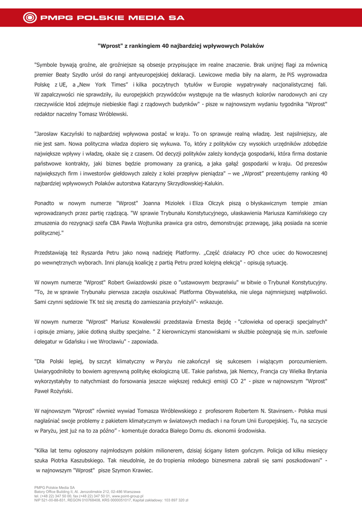 "Wprost" z rankingiem 40 najbardziej wpływowych Polaków "Symbole bywają groźne, ale groźniejsze są obsesje przypisujące im realne znaczenie. Brak unijnej flagi za mównicą premier Beaty Szydło urósł do rangi antyeuropejskiej deklaracji. Lewicowe media biły na alarm, że PiS wyprowadza Polskę z UE, a „New York Times” i kilka poczytnych tytułów w Europie wypatrywały nacjonalistycznej fali. W zapalczywości nie sprawdziły, ilu europejskich przywódców występuje na tle własnych kolorów narodowych ani czy rzeczywiście ktoś zdejmuje niebieskie flagi z rządowych budynków" - pisze w najnowszym wydaniu tygodnika "Wprost" redaktor naczelny Tomasz Wróblewski. "Jarosław Kaczyński to najbardziej wpływowa postać w kraju. To on sprawuje realną władzę. Jest najsilniejszy, ale nie jest sam. Nowa polityczna władza dopiero się wykuwa. To, który z polityków czy wysokich urzędników zdobędzie największe wpływy i władzę, okaże się z czasem. Od decyzji polityków zależy kondycja gospodarki, która firma dostanie państwowe kontrakty, jaki biznes będzie promowany za granicą, a jaka gałąź gospodarki w kraju. Od prezesów największych firm i inwestorów giełdowych zależy z kolei przepływ pieniądza" – we „Wprost” prezentujemy ranking 40 najbardziej wpływowych Polaków autorstwa Katarzyny Skrzydłowskiej-Kalukin. Ponadto w nowym numerze "Wprost" Joanna Miziołek i Eliza Olczyk piszą o błyskawicznym tempie zmian wprowadzanych przez partię rządzącą. "W sprawie Trybunału Konstytucyjnego, ułaskawienia Mariusza Kamińskiego czy zmuszenia do rezygnacji szefa CBA Pawła Wojtunika prawica gra ostro, demonstrując przewagę, jaką posiada na scenie politycznej." Przedstawiają też Ryszarda Petru jako nową nadzieję Platformy. „Część działaczy PO chce uciec do Nowoczesnej po wewnętrznych wyborach. Inni planują koalicję z partią Petru przed kolejną elekcją" - opisują sytuację. W nowym numerze "Wprost" Robert Gwiazdowski pisze o "ustawowym bezprawiu" w bitwie o Trybunał Konstytucyjny. "To, że w sprawie Trybunału pierwsza zaczęła oszukiwać Platforma Obywatelska, nie ulega najmniejszej wątpliwości. Sami czynni sędziowie TK też się zresztą do zamieszania przyłożyli"- wskazuje. W nowym numerze "Wprost" Mariusz Kowalewski przedstawia Ernesta Bejdę - "człowieka od operacji specjalnych" i opisuje zmiany, jakie dotkną służby specjalne. " Z kierowniczymi stanowiskami w służbie pożegnają się m.in. szefowie delegatur w Gdańsku i we Wrocławiu" - zapowiada. "Dla Polski lepiej, by szczyt klimatyczny w Paryżu nie zakończył się sukcesem i wiążącym porozumieniem. Uwiarygodniłoby to bowiem agresywną politykę ekologiczną UE. Takie państwa, jak Niemcy, Francja czy Wielka Brytania wykorzystałyby to natychmiast do forsowania jeszcze większej redukcji emisji CO 2" - pisze w najnowszym "Wprost" Paweł Rożyński. W najnowszym "Wprost" również wywiad Tomasza Wróblewskiego z profesorem Robertem N. Stavinsem.- Polska musi nagłaśniać swoje problemy z pakietem klimatycznym w światowych mediach i na forum Unii Europejskiej. Tu, na szczycie w Paryżu, jest już na to za późno” - komentuje doradca Białego Domu ds. ekonomii środowiska. "Kilka lat temu ogłoszony najmłodszym polskim milionerem, dzisiaj ścigany listem gończym. Policja od kilku miesięcy szuka Piotrka Kaszubskiego. Tak nieudolnie, że do tropienia młodego biznesmena zabrali się sami poszkodowani" w najnowszym "Wprost" pisze Szymon Krawiec. PMPG Polskie Media SA Batory Office Building II, Al. Jerozolimskie 212, 02-486 Warszawa tel. (+48 22) 347 50 00, fax (+48 22) 347 50 01, www.point-group.pl NIP 521-00-88-831, REGON 010768408, KRS 0000051017, Kapitał zakładowy: 103 897 320 zł W nowym numerze "Wprost" Jarosław Giziński pyta, czy to już trzecia wojna światowa. "Zestrzelenie samolotu wywołało antynatowską histerię w rosyjskich mediach. Zgodnie z sowiecką i rosyjską tradycją to „wrogi zachodni pakt” stoi za każdą akcją wymierzoną w interesy Moskwy. Tabloidowa prasa zaczęła kreślić czarny scenariusz wojny Rosji z Zachodem. Powiało grozą" - opisuje nastroje w Rosji. O cyberfroncie wojny o prawdziwe dusze pisze w najnowszym "Wprost" Anna Gwozdowska. "Polem bitwy, na którym bojownicy Państwa Islamskiego odnoszą największe sukcesy, jest dziś internet. Tam ISIS pozyskuje chętnych do walki w Syrii. Aby zablokować rekrutację, Zachód musi stanąć do boju." Nowy numer "Wprost” trafi do kiosków w poniedziałek, 30 listopada 2015 r. E-wydanie tygodnika będzie dostępne w niedzielę o godz. 20:00. "Wprost" można zakupić także w wersji do słuchania oraz na AppleStore i GooglePlay. Zapowiedzi najciekawszych materiałów z najnowszego wydania tygodnika: - na Facebooku (https://www.facebook.com/tygodnikwprost) - oraz na Twitterze (https://twitter.com/TygodnikWPROST). Wydawcą tygodnika „Wprost” jest AWR „Wprost”, spółka zależna giełdowej spółki PMPG Polskie Media SA (GPW: PMPG). Bieżące informacje ze spółki na www.pmpg.pl oraz na profilach w serwisach Twitter: https://twitter.com/PMPG_PL i Facebook: https://www.facebook.com/PMPG.SA. PMPG Polskie Media SA Batory Office Building II, Al. Jerozolimskie 212, 02-486 Warszawa tel. (+48 22) 347 50 00, fax (+48 22) 347 50 01, www.point-group.pl NIP 521-00-88-831, REGON 010768408, KRS 0000051017, Kapitał zakładowy: 103 897 320 zł