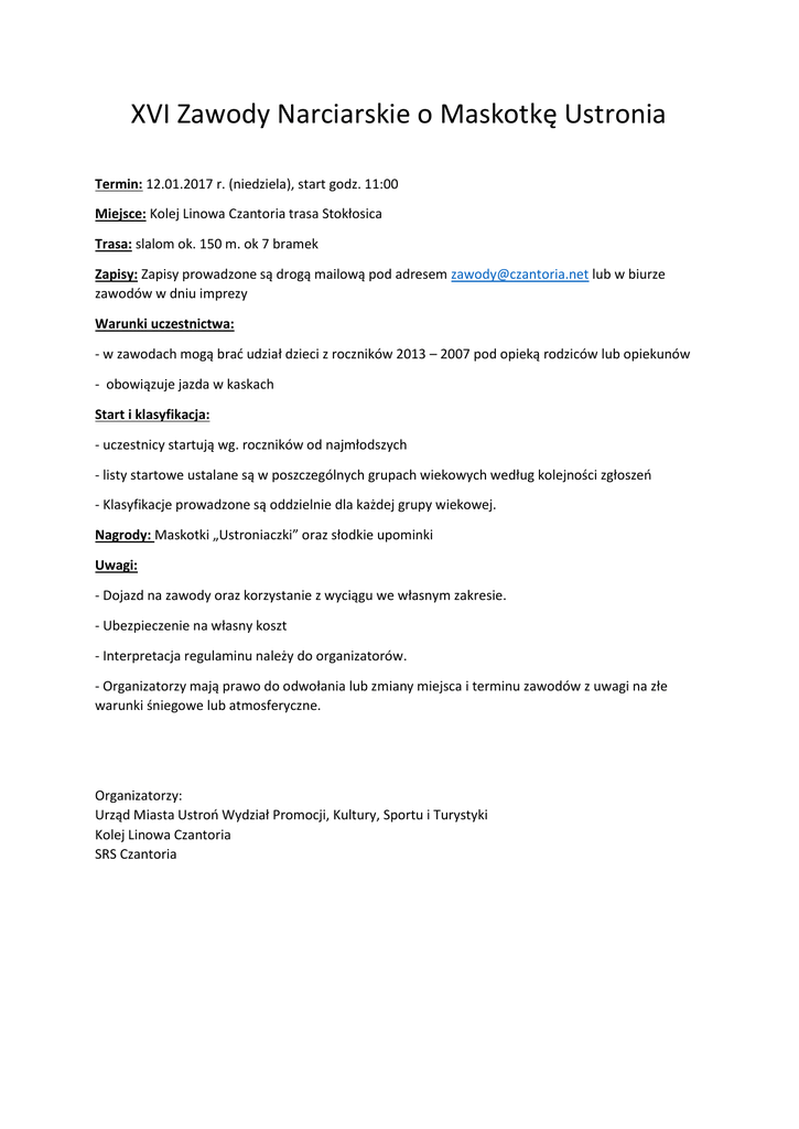 XVI Zawody Narciarskie o Maskotkę Ustronia Termin: 12.01.2017 r. (niedziela), start godz. 11:00 Miejsce: Kolej Linowa Czantoria trasa Stokłosica Trasa: slalom ok. 150 m. ok 7 bramek Zapisy: Zapisy prowadzone są drogą mailową pod adresem [email protected] lub w biurze zawodów w dniu imprezy Warunki uczestnictwa: - w zawodach mogą brać udział dzieci z roczników 2013 – 2007 pod opieką rodziców lub opiekunów - obowiązuje jazda w kaskach Start i klasyfikacja: - uczestnicy startują wg. roczników od najmłodszych - listy startowe ustalane są w poszczególnych grupach wiekowych według kolejności zgłoszeń - Klasyfikacje prowadzone są oddzielnie dla każdej grupy wiekowej. Nagrody: Maskotki „Ustroniaczki” oraz słodkie upominki Uwagi: - Dojazd na zawody oraz korzystanie z wyciągu we własnym zakresie. - Ubezpieczenie na własny koszt - Interpretacja regulaminu należy do organizatorów. - Organizatorzy mają prawo do odwołania lub zmiany miejsca i terminu zawodów z uwagi na złe warunki śniegowe lub atmosferyczne. Organizatorzy: Urząd Miasta Ustroń Wydział Promocji, Kultury, Sportu i Turystyki Kolej Linowa Czantoria SRS Czantoria