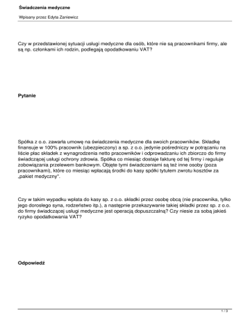 Świadczenia medyczne Wpisany przez Edyta Zaniewicz Czy w przedstawionej sytuacji usługi medyczne dla osób, które nie są pracownikami firmy, ale są np. członkami ich rodzin, podlegają opodatkowaniu VAT? Pytanie Spółka z o.o. zawarła umowę na świadczenia medyczne dla swoich pracowników. Składkę finansuje w 100% pracownik (ubezpieczony) a sp. z o.o. jedynie pośredniczy w potrącaniu na liście płac składek z wynagrodzenia netto pracowników i odprowadzaniu ich zbiorczo do firmy świadczącej usługi ochrony zdrowia. Spółka co miesiąc dostaje fakturę od tej firmy i reguluje zobowiązania przelewem bankowym. Objęte tymi świadczeniami są też inne osoby (poza pracownikami), które co miesiąc wpłacają środki do kasy spółki tytułem zwrotu kosztów za „pakiet medyczny". Czy w takim wypadku wpłata do kasy sp. z o.o. składki przez osobę obcą (nie pracownika, tylko jego dorosłego syna, rodzeństwo itp.), a następnie przekazywanie takiej składki przez sp. z o.o. do firmy świadczącej usługi medyczne jest operacją dopuszczalną? Czy niesie za sobą jakieś ryzyko opodatkowania VAT? Odpowiedź 1/3 Świadczenia medyczne Wpisany przez Edyta Zaniewicz Jeżeli zakład pracy - Państwa firma - działając we własnym imieniu, ale na rzecz pracowników i członków ich rodzin nabywa usługę medyczną, wówczas należy przyjąć, że na rzecz tych osób Państwo sami świadczą usługę medyczną opodatkowaną podatkiem VAT zgodnie z regulacjami ustawy z 11 marca 2004 r. o podatku od towarów i usług (Dz. U. Nr 54, poz. 535 z późn. zm.) - dalej u.p.t.u. Uzasadnienie Z opisu sytuacji wynika, że otrzymują Państwo fakturę dokumentującą nabycie usług medycznych i najprawdopodobniej w jej treści wskazane jest, że nabywcą usługi jest Państwa firma - spółka z o.o. Jeżeli taki jest stan faktyczny, to zastosowanie znajdą regulacje art. 8 ust. 2a u.p.t.u. Powołana regulacja stanowi, że w przypadku, gdy podatnik, działając we własnym imieniu, ale na rzecz osoby trzeciej, bierze udział w świadczeniu usług, przyjmuje się, że ten podatnik sam otrzymał i wyświadczył te usługi. Oznacza to, że jeżeli Państwa firma nabywa we własnym imieniu, ale na rzecz swoich pracowników i członków ich rodzin, usługi medyczne wówczas przyjmuje się dla celów opodatkowania podatkiem VAT pewną fikcję prawną - która zakłada, że Państwo sami świadczą omawiane usługi medyczne. Stosownie do regulacji art. 30 ust. 3 u.p.t.u. w przypadku, gdy podatnik, działając we własnym imieniu, ale na rzecz osoby trzeciej, bierze udział w świadczeniu usług, podstawą opodatkowania jest kwota należna z tytułu świadczenia usług, pomniejszona o kwotę podatku. 2/3 Świadczenia medyczne Wpisany przez Edyta Zaniewicz Zastosowanie powyższych regulacji w praktyce oznacza, że na rzecz swoich pracowników i ich członków rodzin świadczą Państwo usługi medyczne; przy czym usługi te są świadczone na rzecz osób fizycznych nieprowadzących pozarolniczej działalności gospodarczej. Oznacza to, że nie są Państwo obowiązani do dokumentowania sprzedaży fakturą, z wyjątkiem, gdy nabywca (pracownik lub członek jego rodziny) zażąda faktury. Powyższe potwierdzają regulacje art. 106 ust. 4 u.p.t.u., który reguluje, że podatnicy nie mają obowiązku wystawiania faktur osobom fizycznym nieprowadzącym działalności gospodarczej; jednakże na żądanie tych osób podatnicy są obowiązani do wystawienia faktury. Jeżeli przedmiotem świadczenia są usługi w zakresie opieki medycznej, które służą profilaktyce, zachowaniu, ratowaniu, przywracaniu i poprawie zdrowia, wówczas będą objęte zwolnieniem od opodatkowania. Podstawę prawną do zastosowania zwolnienia stanowią regulacje art. 43 ust. 1 pkt 19a u.p.t.u., zgodnie z którymi zwolnieniem objęte są usługi w zakresie opieki medycznej, które służą profilaktyce, zachowaniu, ratowaniu, przywracaniu i poprawie zdrowia, jeżeli usługi te zostały nabyte przez podatnika we własnym imieniu, ale na rzecz osoby trzeciej, od podmiotów posiadających status zakładu opieki zdrowotnej lub od podmiotów wykonujących zawody lekarza i lekarza dentysty, pielęgniarki, położnej, psychologa lub wykonujących inne zawody medyczne, o których mowa w art. 18d ust. 1 pkt 1 ustawy z 30 sierpnia 1991 r. o zakładach opieki zdrowotnej (tekst jedn.: Dz. U. z 2007 r. Nr 14, poz. 89 z późn. zm.). 3/3