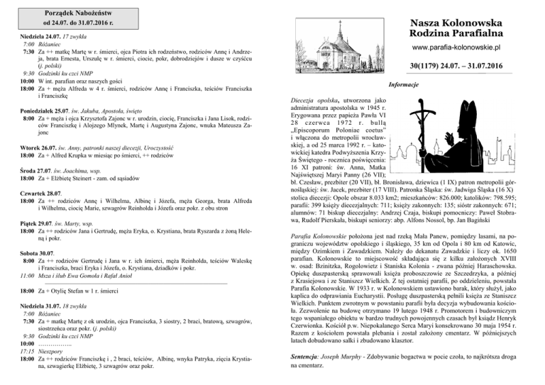 Porządek Nabożeństw od 24.07. do 31.07.2016 r. Niedziela 24.07. 17 zwykła 7:00 Różaniec 7:30 Za ++ matkę Martę w r. śmierci, ojca Piotra ich rodzeństwo, rodziców Annę i Andrzeja, brata Ernesta, Urszulę w r. śmierci, ciocie, pokr, dobrodziejów i dusze w czyśćcu (j. polski) 9:30 Godzinki ku czci NMP 10:00 W int. parafian oraz naszych gości 18:00 Za + męża Alfreda w 4 r. śmierci, rodziców Annę i Franciszka, teściów Franciszka i Franciszkę Poniedziałek 25.07. św. Jakuba, Apostoła, święto 8:00 Za + męża i ojca Krzysztofa Zajonc w r. urodzin, ciocię, Franciszka i Jana Lisok, rodziców Franciszkę i Alojzego Mlynek, Martę i Augustyna Zajonc, wnuka Mateusza Zajonc Wtorek 26.07. św. Anny, patronki naszej diecezji, Uroczystość 18:00 Za + Alfred Krupka w miesiąc po śmierci, ++ rodziców Środa 27.07. św. Joachima, wsp. 18:00 Za + Elżbietę Steinert - zam. od sąsiadów Czwartek 28.07. 18:00 Za ++ rodziców Annę i Wilhelma, Albinę i Józefa, męża Georga, brata Alfreda i Wilhelma, ciocię Marie, szwagrów Reinholda i Józefa oraz pokr. z obu stron Piątek 29.07. św. Marty, wsp. 18:00 Za ++ rodziców Jana i Gertrudę, męża Eryka, o. Krystiana, brata Ryszarda z żoną Heleną i pokr. Sobota 30.07. 8:00 Za ++ rodziców Gertrudę i Jana w r. ich śmierci, męża Reinholda, teściów Waleskę i Franciszka, braci Eryka i Józefa, o. Krystiana, dziadków i pokr. 11:00 Msza i ślub Ewa Gomoła i Rafał Anioł ——–—–——–—–—————————–—————–——————— 18:00 Za + Otylię Stefan w 1 r. śmierci Niedziela 31.07. 18 zwykła 7:00 Różaniec 7:30 Za + matkę Martę z ok urodzin, ojca Franciszka, 3 siostry, 2 braci, bratową, szwagrów, siostrzeńca oraz pokr. (j. polski) 9:30 Godzinki ku czci NMP 10:00 …………….. 17:15 Nieszpory 18:00 Za ++ rodziców Franciszkę i , 2 braci, teściów, Albinę, wnyka Patryka, zięcia Krystiana, szwagierkę Elżbietę, 3 szwagrów oraz pokr. Nasza Kolonowska Rodzina Parafialna www.parafia-kolonowskie.pl 30(1179) 24.07. – 31.07.2016 Informacje Diecezja opolska, utworzona jako administratura apostolska w 1945 r. Erygowana przez papieża Pawła VI 2 8 czerwca 19 72 r. b ullą „Episcoporum Poloniae coetus” i włączona do metropolii wrocławskiej, a od 25 marca 1992 r. – katowickiej katedra Podwyższenia Krzyża Świętego - rocznica poświęcenia: 16 XI patroni: św. Anna, Matka Najświętszej Maryi Panny (26 VII); bł. Czesław, prezbiter (20 VII), bł. Bronisława, dziewica (1 IX) patron metropolii górnośląskiej: św. Jacek, prezbiter (17 VIII). Patronka Śląska: św. Jadwiga Śląska (16 X) stolica diecezji: Opole obszar 8.033 km2; mieszkańców: 826.000; katolików: 798.595; parafii: 399 księży diecezjalnych: 711; księży zakonnych: 135; sióstr zakonnych: 671; alumnów: 71 biskup diecezjalny: Andrzej Czaja, biskupi pomocniczy: Paweł Stobrawa, Rudolf Pierskała, biskupi seniorzy: abp. Alfons Nossol, bp. Jan Bagiński Parafia Kolonowskie położona jest nad rzeką Mała Panew, pomiędzy lasami, na pograniczu województw opolskiego i śląskiego, 35 km od Opola i 80 km od Katowic, między Ozimkiem i Zawadzkiem. Należy do dekanatu Zawadzkie i liczy ok. 1650 parafian. Kolonowskie to miejscowość składająca się z kilku założonych XVIII w. osad: Bzinitzka, Rogolowietz i Staniska Kolonia - zwana później Haraschowska. Opiekę duszpasterską sprawowali księża proboszczowie ze Szczedrzyka, a później z Krasiejowa i ze Staniszcz Wielkich. Z tej ostatniej parafii, po oddzieleniu, powstała Parafia Kolonowskie. W 1933 r. w Kolonowskiem ustawiono barak, który służył, jako kaplica do odprawiania Eucharystii. Posługę duszpasterską pełnili księża ze Staniszcz Wielkich. Punktem zwrotnym w powstaniu parafii była decyzja wybudowania kościoła. Zezwolenie na budowę otrzymano 19 lutego 1948 r. Promotorem i budowniczym tego wspaniałego obiektu w bardzo trudnych powojennych czasach był ksiądz Henryk Czerwionka. Kościół p.w. Niepokalanego Serca Maryi konsekrowano 30 maja 1954 r. Razem z kościołem powstała plebania i został założony cmentarz. W późniejszych latach dobudowano salki i zbudowano klasztor. Sentencja: Joseph Murphy - Zdobywanie bogactwa w pocie czoła, to najkrótsza droga na cmentarz. 30/2016 ŚDM Dzisiaj Msza św. o 10:00 z udziałem naszych gości, z wspólną modlitwą młodych. Po Mszy grupa z Hochdal ma spotkanie w klasztorze u sióstr, natomiast grupa Nasza wyjeżdżająca do Krakowa ma spotkanie w salce. Od godziny 15:00 Festyn Rodzinny na Granicy. Zapraszamy wszystkich. W poniedziałek o 9:00 wyjazd naszych gości, grupy 17 osób z Hochdal. Jadą Busem JEKA do Trzebnicy, stamtąd udadzą się do Krakowa. O 12:00 Msza św. w int. Naszej 27 osobowej Grupy ŚDM, o 13:00 wyjazd autokarem Smykała na ŚDM. Baza nasza mieści się (nie skromnie powiem w najpiękniejszym miejscu na świecie), w miejscowości Barwałd Górny. 10 km. od Kalwarii Zebrzydowskiej. Połączenie do Krakowa jest pociągiem, co godzinę. W miejscowości tej będziemy jedyną grupą z Polski, pozostałe będą z całego świata (razem 150 osób). Warunki do spania doskonałe. Spotkania będą w Krakowie i w Kalwarii, czeka nas piesza pielgrzymka na Kalwarię szlakiem, którym wędrował św. Jan Paweł II. No, reszta na miejscu. Różaniec w naszym kościele w int. ŚDM: wtorek, środa, piątek o 17:30; niedziela o 7:00; czwartek o 17:45 Koronka. My jadący do Krakowa obiecujemy modlitwę razem z papieżem i młodzieżą z całego świata w int. Naszych parafii, w WASZYCH i NASZYCH INTENCJACH. Szczęść Boże - ks.Piotr i 26 pięknych młodych ludzi! ——–—–———————–———–————————–———–————— Opowiadanie Na licytacji licytator uniósł w górę skrzypce. Były porysowane i zniszczone. Struny wisiały rozluźnione i licytator sądził, że nie warto tracić czasu na stare skrzypce, ale jednak