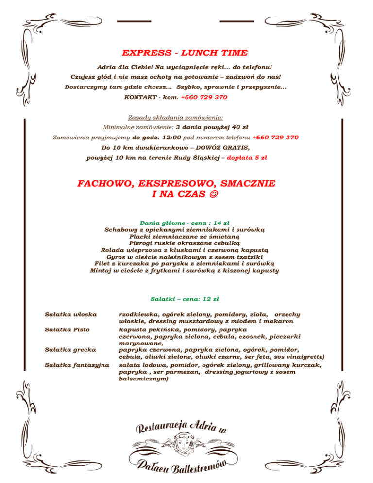 EXPRESS - LUNCH TIME Adria dla Ciebie! Na wyciągnięcie ręki… do telefonu! Czujesz głód i nie masz ochoty na gotowanie – zadzwoń do nas! Dostarczymy tam gdzie chcesz… Szybko, sprawnie i przepysznie… KONTAKT - kom. +660 729 370 Zasady składania zamówienia: Minimalne zamówienie: 3 dania powyżej 40 zł Zamówienia przyjmujemy do godz. 12:00 pod numerem telefonu +660 729 370 Do 10 km dwukierunkowo – DOWÓZ GRATIS, powyżej 10 km na terenie Rudy Śląskiej – dopłata 5 zł FACHOWO, EKSPRESOWO, SMACZNIE I NA CZAS Dania główne - cena : 14 zł Schabowy z opiekanymi ziemniakami i surówką Placki ziemniaczane ze śmietaną Pierogi ruskie okraszane cebulką Rolada wieprzowa z kluskami i czerwoną kapustą Gyros w cieście naleśnikowym z sosem tzatziki Filet z kurczaka po parysku z ziemniakami i surówką Mintaj w cieście z frytkami i surówką z kiszonej kapusty Sałatki – cena: 12 zł Sałatka włoska Sałatka Pisto Sałatka grecka Sałatka fantazyjna rzodkiewka, ogórek zielony, pomidory, zioła, orzechy włoskie, dressing musztardowy z miodem i makaron kapusta pekińska, pomidory, papryka czerwona, papryka zielona, cebula, czosnek, pieczarki marynowane, papryka czerwona, papryka zielona, ogórek, pomidor, cebula, oliwki zielone, oliwki czarne, ser feta, sos vinaigrette) sałata lodowa, pomidor, ogórek zielony, grillowany kurczak, papryka , ser parmezan, dressing jogurtowy z sosem balsamicznym)