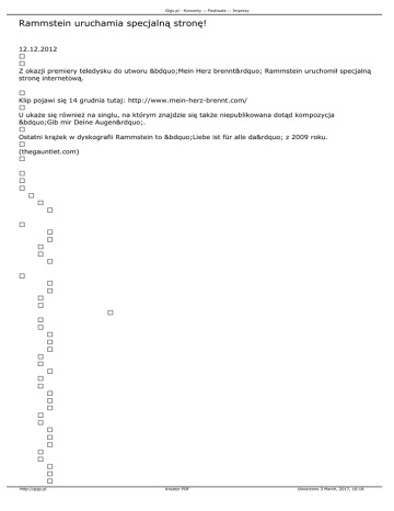 Gigs.pl - Koncerty :: Festiwale :: Imprezy Rammstein uruchamia specjalną stronę! 12.12.2012 Z okazji premiery teledysku do utworu „Mein Herz brennt” Rammstein uruchomił specjalną stronę internetową. Klip pojawi się 14 grudnia tutaj: http://www.mein-herz-brennt.com/ U ukaże się również na singlu, na którym znajdzie się także niepublikowana dotąd kompozycja „Gib mir Deine Augen”. Ostatni krążek w dyskografii Rammstein to „Liebe ist für alle da” z 2009 roku. (thegauntlet.com) http://gigs.pl Kreator PDF Utworzono 3 March, 2017, 16:18 Gigs.pl - Koncerty :: Festiwale :: Imprezy http://gigs.pl Kreator PDF Utworzono 3 March, 2017, 16:18