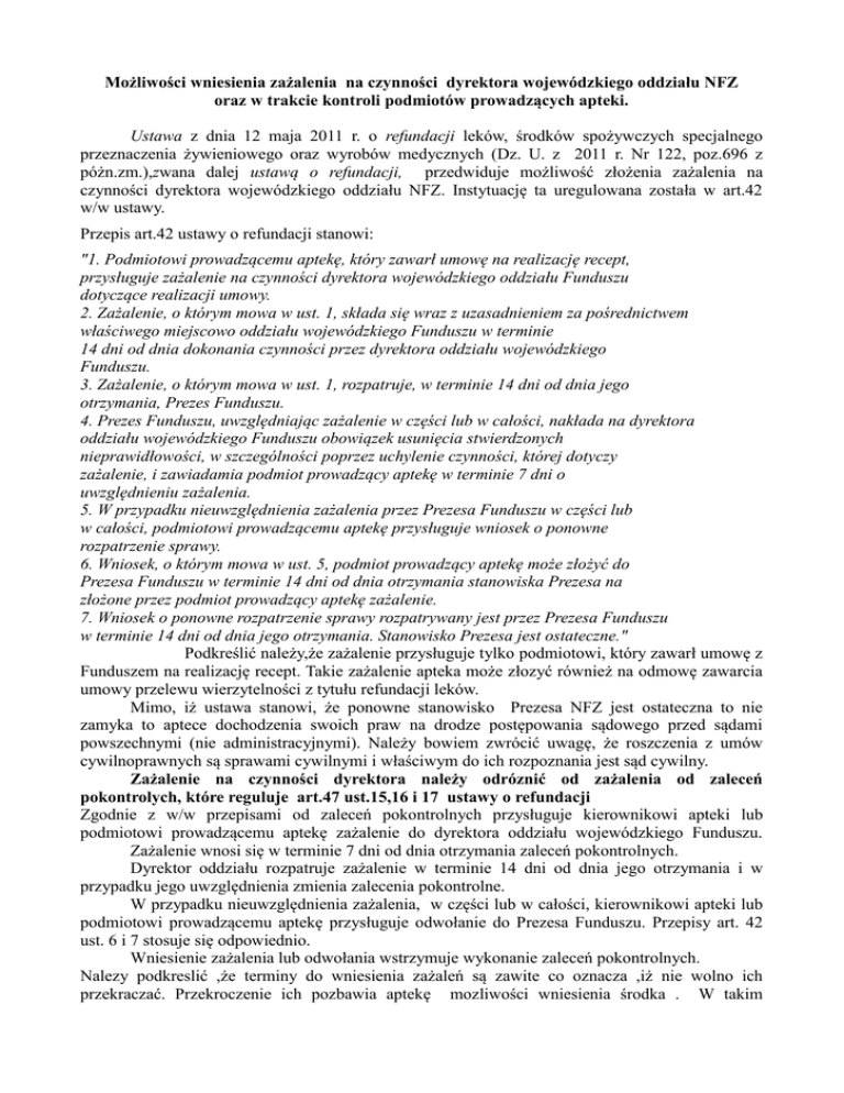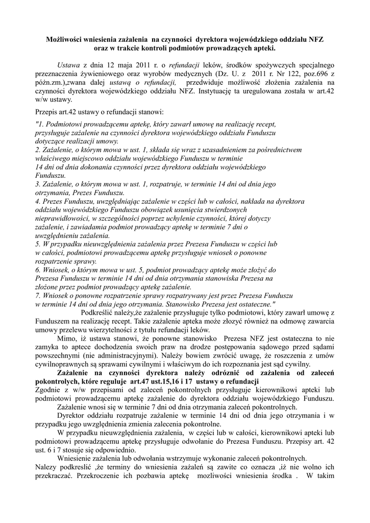 Możliwości wniesienia zażalenia na czynności dyrektora wojewódzkiego oddziału NFZ oraz w trakcie kontroli podmiotów prowadzących apteki. Ustawa z dnia 12 maja 2011 r. o refundacji leków, środków spożywczych specjalnego przeznaczenia żywieniowego oraz wyrobów medycznych (Dz. U. z 2011 r. Nr 122, poz.696 z póżn.zm.),zwana dalej ustawą o refundacji, przedwiduje możliwość złożenia zażalenia na czynności dyrektora wojewódzkiego oddziału NFZ. Instytuację ta uregulowana została w art.42 w/w ustawy. Przepis art.42 ustawy o refundacji stanowi: "1. Podmiotowi prowadzącemu aptekę, który zawarł umowę na realizację recept, przysługuje zażalenie na czynności dyrektora wojewódzkiego oddziału Funduszu dotyczące realizacji umowy. 2. Zażalenie, o którym mowa w ust. 1, składa się wraz z uzasadnieniem za pośrednictwem właściwego miejscowo oddziału wojewódzkiego Funduszu w terminie 14 dni od dnia dokonania czynności przez dyrektora oddziału wojewódzkiego Funduszu. 3. Zażalenie, o którym mowa w ust. 1, rozpatruje, w terminie 14 dni od dnia jego otrzymania, Prezes Funduszu. 4. Prezes Funduszu, uwzględniając zażalenie w części lub w całości, nakłada na dyrektora oddziału wojewódzkiego Funduszu obowiązek usunięcia stwierdzonych nieprawidłowości, w szczególności poprzez uchylenie czynności, której dotyczy zażalenie, i zawiadamia podmiot prowadzący aptekę w terminie 7 dni o uwzględnieniu zażalenia. 5. W przypadku nieuwzględnienia zażalenia przez Prezesa Funduszu w części lub w całości, podmiotowi prowadzącemu aptekę przysługuje wniosek o ponowne rozpatrzenie sprawy. 6. Wniosek, o którym mowa w ust. 5, podmiot prowadzący aptekę może złożyć do Prezesa Funduszu w terminie 14 dni od dnia otrzymania stanowiska Prezesa na złożone przez podmiot prowadzący aptekę zażalenie. 7. Wniosek o ponowne rozpatrzenie sprawy rozpatrywany jest przez Prezesa Funduszu w terminie 14 dni od dnia jego otrzymania. Stanowisko Prezesa jest ostateczne." Podkreślić należy,że zażalenie przysługuje tylko podmiotowi, który zawarł umowę z Funduszem na realizację recept. Takie zażalenie apteka może złozyć również na odmowę zawarcia umowy przelewu wierzytelności z tytułu refundacji leków. Mimo, iż ustawa stanowi, że ponowne stanowisko Prezesa NFZ jest ostateczna to nie zamyka to aptece dochodzenia swoich praw na drodze postępowania sądowego przed sądami powszechnymi (nie administracyjnymi). Należy bowiem zwrócić uwagę, że roszczenia z umów cywilnoprawnych są sprawami cywilnymi i właściwym do ich rozpoznania jest sąd cywilny. Zażalenie na czynności dyrektora należy odróznić od zażalenia od zaleceń pokontrolych, które reguluje art.47 ust.15,16 i 17 ustawy o refundacji Zgodnie z w/w przepisami od zaleceń pokontrolnych przysługuje kierownikowi apteki lub podmiotowi prowadzącemu aptekę zażalenie do dyrektora oddziału wojewódzkiego Funduszu. Zażalenie wnosi się w terminie 7 dni od dnia otrzymania zaleceń pokontrolnych. Dyrektor oddziału rozpatruje zażalenie w terminie 14 dni od dnia jego otrzymania i w przypadku jego uwzględnienia zmienia zalecenia pokontrolne. W przypadku nieuwzględnienia zażalenia, w części lub w całości, kierownikowi apteki lub podmiotowi prowadzącemu aptekę przysługuje odwołanie do Prezesa Funduszu. Przepisy art. 42 ust. 6 i 7 stosuje się odpowiednio. Wniesienie zażalenia lub odwołania wstrzymuje wykonanie zaleceń pokontrolnych. Nalezy podkreslić ,że terminy do wniesienia zażaleń są zawite co oznacza ,iż nie wolno ich przekraczać. Przekroczenie ich pozbawia aptekę mozliwości wniesienia środka . W takim przypadku pozostaje już tylko droga sądowa. Decyzja Prezesa NFZ dotyczaca kontroli nie zamyka aptece dochodzenia swoich roszczeń na drodze postepowania sądowego. Z powództwem można wystąpić, aż do chwili przedawnienia roszczenia. Radca Prawny: Elżbieta Nowak