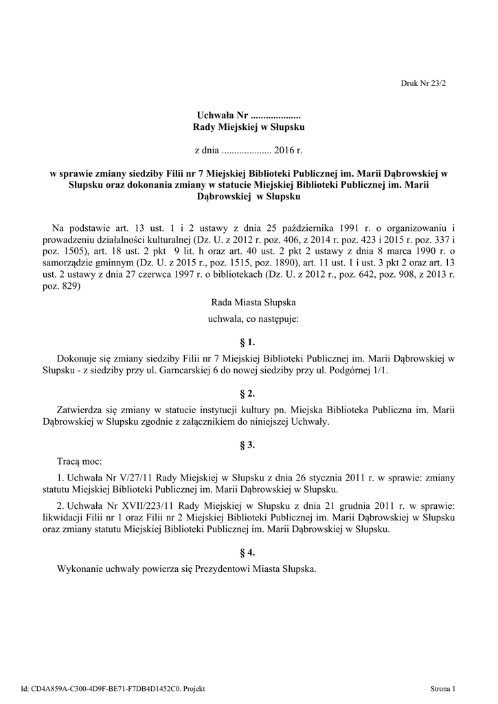 Druk Nr 23/2 Uchwała Nr .................... Rady Miejskiej w Słupsku z dnia .................... 2016 r. w sprawie zmiany siedziby Filii nr 7 Miejskiej Biblioteki Publicznej im. Marii Dąbrowskiej w Słupsku oraz dokonania zmiany w statucie Miejskiej Biblioteki Publicznej im. Marii Dąbrowskiej w Słupsku Na podstawie art. 13 ust. 1 i 2 ustawy z dnia 25 października 1991 r. o organizowaniu i prowadzeniu działalności kulturalnej (Dz. U. z 2012 r. poz. 406, z 2014 r. poz. 423 i 2015 r. poz. 337 i poz. 1505), art. 18 ust. 2 pkt 9 lit. h oraz art. 40 ust. 2 pkt 2 ustawy z dnia 8 marca 1990 r. o samorządzie gminnym (Dz. U. z 2015 r., poz. 1515, poz. 1890), art. 11 ust. 1 i ust. 3 pkt 2 oraz art. 13 ust. 2 ustawy z dnia 27 czerwca 1997 r. o bibliotekach (Dz. U. z 2012 r., poz. 642, poz. 908, z 2013 r. poz. 829) Rada Miasta Słupska uchwala, co następuje: § 1. Dokonuje się zmiany siedziby Filii nr 7 Miejskiej Biblioteki Publicznej im. Marii Dąbrowskiej w Słupsku - z siedziby przy ul. Garncarskiej 6 do nowej siedziby przy ul. Podgórnej 1/1. § 2. Zatwierdza się zmiany w statucie instytucji kultury pn. Miejska Biblioteka Publiczna im. Marii Dąbrowskiej w Słupsku zgodnie z załącznikiem do niniejszej Uchwały. § 3. Tracą moc: 1. Uchwała Nr V/27/11 Rady Miejskiej w Słupsku z dnia 26 stycznia 2011 r. w sprawie: zmiany statutu Miejskiej Biblioteki Publicznej im. Marii Dąbrowskiej w Słupsku. 2. Uchwała Nr XVII/223/11 Rady Miejskiej w Słupsku z dnia 21 grudnia 2011 r. w sprawie: likwidacji Filii nr 1 oraz Filii nr 2 Miejskiej Biblioteki Publicznej im. Marii Dąbrowskiej w Słupsku oraz zmiany statutu Miejskiej Biblioteki Publicznej im. Marii Dąbrowskiej w Słupsku. § 4. Wykonanie uchwały powierza się Prezydentowi Miasta Słupska. Id: CD4A859A-C300-4D9F-BE71-F7DB4D1452C0. Projekt Strona 1 § 5. Uchwała wchodzi w życie z dniem podjęcia. Przewodnicząca Rady Miejskiej w Słupsku Beata Chrzanowska Id: CD4A859A-C300-4D9F-BE71-F7DB4D1452C0. Projekt Strona 2 Uzasadnienie 1. Przedstawienie istniejącego stanu w dziedzinie, która ma być normowana. Lokal w którym funkcjonuje Filia nr 7 Miejskiej Biblioteki Publicznej w Słupsku zajmuje powierzchnię 225,19 m2 i jest wynajmowany od Spółdzielni Mieszkaniowej „Czyn”. Koszty utrzymania lokalu w 2015 r. wyniosły 30 312,19 zł, w tym: a) czynsz – 11 073,96 zł., b) centralne ogrzewanie – 14 564,70 zł., c) energia elektryczna – 2 877,29 zł, d) zużycie wody i odprowadzenie ścieków – 254,52 zł., e) opłata abonamentowa za Internet – 693,72 zł., f) telefony – 848,00 zł. Obecnie miesięczna opłata czynszowa wynosi 922,83 zł brutto. Filia według stanu na koniec 2015 roku posiadała księgozbiór liczący 17 400 woluminów, z którego w 2015 r. korzystało 874 czytelników. W filii zatrudnieni są dwaj pracownicy. Nie planuje się zmniejszenia zatrudnienia w filii. Prócz tego zapisy ujęte w statucie biblioteki były uchwalone w 2011 roku i jego treść jest przestarzała. Zapis dotyczący funduszu instytucji kultury uległ dezaktualizacji i wymaga zmiany. 2. Wyjaśnienie potrzeb i celu podjęcia uchwały. Lokal znajdujący się przy ul. Garncarskiej 6 nie spełnia standardów nowoczesnych placówek bibliotecznych. Pomieszczenia Filii nr 7 wymagają generalnego remontu, w tym: wymiany instalacji elektrycznej, wymiany instalacji sanitarnej, wymiany instalacji grzewczej, wygładzenia i malowania ścian, wymiany stolarki okiennej i drzwiowej itp. Obecna instalacja elektryczna jest starego typu i według obowiązujących norm powinna być ujednolicona. Witryny okienne otwierają się częściowo, co utrudnia cyrkulację powietrza. Koszt związany z opłatami za centralne ogrzewanie jest bardzo wysoki. Ponadto umiejscowienie lokalu przy ruchliwej ulicy (przelotowej do Gdańska), nie zapewnia dobrych warunków do korzystania z usług biblioteki. Przeniesienie filii bibliotecznej do lokalu znajdującego się w zasobach miejskich pozwoli na osiągnięcie oszczędności związanych z utrzymaniem lokalu. Ponadto nowy lokal jest zwolniony z opłaty czynszowej. Biblioteka w nowej lokalizacji będzie ponosić jedynie zwykłe koszty utrzymania lokalu związane z ogrzewaniem, dostawą wody, odprowadzeniem ścieków, zużyciem energii elektrycznej, dostawą internetu. Powierzchnia nowego lokalu zabezpieczy działania kulturotwórcze oferowane przez tą placówkę. Ponadto statut instytucji powinien ulec zmianie ze względu na zmianę przepisów prawnych dotyczących działalności kulturalnej. W Dz. U. z 30 września 2015 r. pod poz. 1505 opublikowano Ustawę z 5 sierpnia 2015 r. o zmianie ustaw regulujących warunki dostępu do wykonywania niektórych zawodów. Nowelizacja wprowadziła zmiany m.in. do ustawy o organizowaniu i prowadzeniu działalności kulturalnej. Art. 29 ustawy o działalności kulturalnej wprowadził podział na fundusz instytucji kultury oraz fundusz rezerwowy. W nowym brzmieniu ustawy fundusz instytucji kultury odzwierciedla wartość mienia wydzielonego dla instytucji kultury w momencie jej utworzenia i ulega zwiększeniu o wartość niepodlegających amortyzacji aktywów trwałych sfinansowanych z dotacji lub otrzymanych nieodpłatnie oraz zmniejszeniu o wartość niepokrytej straty netto. Natomiast fundusz rezerwowy tworzy się z zysku netto za poprzedni rok obrotowy i przeznacza się na pokrycie strat instytucji kultury. W przypadku gdy strata netto jest wyższa niż fundusz rezerwowy, pozostałą jej część pokrywa się z funduszu instytucji kultury. Ponadto ze względu na fakt, że nowoczesna biblioteka wciąż ewoluuje i powiększa się zakres jej zadań, można dokonać całkowitej aktualizacji statutu instytucji. Nowe brzmienie statutu instytucji kultury pn. Miejska Biblioteka Publiczna im. Marii Dąbrowskiej w Słupsku zostało przedstawione w załączniku do niniejszej Uchwały. Id: CD4A859A-C300-4D9F-BE71-F7DB4D1452C0. Projekt Strona 3 3. Wskazanie różnic między dotychczasowym a projekt
