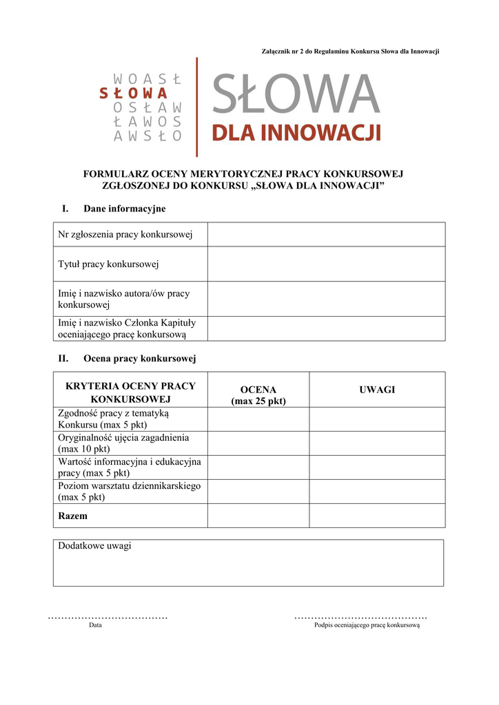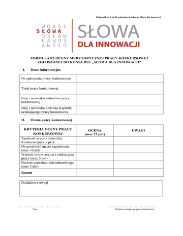 Załącznik nr 2 do Regulaminu Konkursu Słowa dla Innowacji FORMULARZ OCENY MERYTORYCZNEJ PRACY KONKURSOWEJ ZGŁOSZONEJ DO KONKURSU „SŁOWA DLA INNOWACJI” I. Dane informacyjne Nr zgłoszenia pracy konkursowej Tytuł pracy konkursowej Imię i nazwisko autora/ów pracy konkursowej Imię i nazwisko Członka Kapituły oceniającego pracę konkursową II. Ocena pracy konkursowej KRYTERIA OCENY PRACY KONKURSOWEJ Zgodność pracy z tematyką Konkursu (max 5 pkt) Oryginalność ujęcia zagadnienia (max 10 pkt) Wartość informacyjna i edukacyjna pracy (max 5 pkt) Poziom warsztatu dziennikarskiego (max 5 pkt) OCENA (max 25 pkt) UWAGI Razem Dodatkowe uwagi ……………………………… Data …………………………………. Podpis oceniającego pracę konkursową