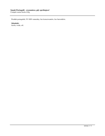 Smaki Portugalii - zrozumiesz, gdy spróbujesz! Compal czarna fasola 410g Produkt portugalski. W 100% naturalny, bez konserwantów, bez barwników. Składniki: fasola, woda, sól. strona 1 / 1