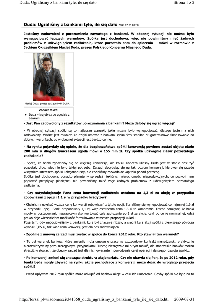 Duda: Ugraliśmy z bankami tyle, ile się dało Strona 1 z 2 Duda: Ugraliśmy z bankami tyle, ile się dało 2009-07-31 03:00 Jesteśmy zadowoleni z porozumienia zawartego z bankami. W obecnej sytuacji nie można było wynegocjować lepszych warunków. Spółka jest dochodowa, więc nie powinniśmy mieć żadnych problemów z udźwignięciem zadłużenia, które pozostało nam do spłacenia – mówi w rozmowie z Jackiem Okrzesikiem Maciej Duda, prezes Polskiego Koncernu Mięsnego Duda. Maciej Duda, prezes zarządu PKM DUDA Zobacz także: Duda – krajobraz po ugodzie z bankami - Jest Pan zadowolony z rezultatów porozumienia z bankami? Może dałoby się ugrać więcej? - W obecnej sytuacji spółki są to najlepsze warunki, jakie można było wynegocjować, dlatego jestem z nich zadowolony. Ważne jest również, że dzięki umowie z bankami zyskaliśmy stabilne długoterminowe finansowanie na dobrych warunkach, co w obecnej sytuacji jest bardzo cenne. - Na rynku pojawiały się opinie, że dla bezpieczeństwa spółki konwersją powinno zostać objęte około 200 mln zł długów tymczasem ugoda mówi o 155 mln zł. Czy spółka udźwignie ciężar pozostałego zadłużenia? - Sądzę, że banki zgodziłyby się na większą konwersję, ale Polski Koncern Mięsny Duda jest w stanie obsłużyć pozostały dług, więc nie było takiej potrzeby. Zarząd, decydując się na taki poziom konwersji, kierował się przede wszystkim interesem spółki i akcjonariuszy, nie chcieliśmy rozwadniać kapitału ponad potrzebę. Spółka jest dochodowa, ponadto planujemy sprzedaż niektórych nieruchomości nieprodukcyjnych, co pozwoli nam poprawić przepływy pieniężne, nie powinniśmy mieć więc żadnych problemów z udźwignięciem pozostałego zadłużenia. - Czy satysfakcjonuje Pana cena konwersji zadłużenia ustalona na 1,3 zł za akcję w przypadku zobowiązań z opcji i 1,1 zł w przypadku kredytów? - Chcieliśmy uzyskać wyższą cenę konwersji zobowiązań z tytułu opcji. Staraliśmy się wynegocjować co najmniej 1,6 zł w przypadku opcji. Banki proponowały 1,1 zł, więc ostateczna cena 1,3 zł to kompromis. Trzeba pamiętać, że banki mogły w postępowaniu naprawczym skonwertować całe zadłużenie po 1 zł za akcję, czyli po cenie nominalnej, gdyż prawo daje wierzycielom możliwość formułowania własnych propozycji układu. Poza tym, gdy negocjowaliśmy z bankami, kurs był znacznie niższy, a średni kurs akcji spółki z pierwszego półrocza wynosił 0,85 zł, tak więc cena konwersji jest dla nas zadowalająca. - Zgodnie z umową zarząd musi zostać w spółce do końca 2012 roku. Kto stawiał ten warunek? - To był warunek banków, które zmieniły moją umowę o pracę na szczegółowy kontrakt menedżerski, praktycznie nierozwiązywalny poza szczególnymi przypadkami. Trochę niezręcznie mi o tym mówić, ale stanowisko banków można streścić w słowach, że obecny zarząd jest dla nich gwarantem powodzenia całej operacji i dalszego rozwoju spółki… - Po konwersji zmieni się znacząco struktura akcjonariatu. Czy nie obawia się Pan, że po 2012 roku, gdy banki będą mogły zbywać na rynku akcje pochodzące z konwersji, może dojść do wrogiego przejęcia spółki? - Przed upływem 2012 roku spółka może odkupić od banków akcje w celu ich umorzenia. Gdyby spółki nie było na to http://forsal.pl/wiadomosci/341358_duda_ugralismy_z_bankami_tyle_ile_sie_dalo.ht... 2009-07-31 Duda: Ugraliśmy z bankami tyle, ile się dało Strona 2 z 2 stać, akcje może odkupić rodzina Duda, dlatego nie sądzę, aby istniało niebezpieczeństwo wrogiego przejęcia PKM Duda. Oczywiście teoretycznie istnieje możliwość, że jeśli do końca 2012 roku ani spółka ani moja rodzina nie odkupią akcji PKM Duda, banki będą mogły zrobić z nimi co zechcą – np. sprzedać je inwestorowi branżowemu. Ten scenariusz wydaje się jednak nieprawdopodobny i nie zakładam, aby mógł się zrealizować. Dołożymy wszelkich starań, żeby odkupić akcje spółki przed upływam 2012 roku. Planujemy przeznaczyć na ten cel część środków pochodzących z emisji akcji serii H oraz ze sprzedaży części zbędnego majątku. - Kluczowym elementem całego przedsięwzięcia jest restrukturyzacja PKM Duda. W którym kierunku będą zmierzać działania mające uzdrowić spółkę? - Naszym głównym celem będzie poprawa efektywności działania spółek z grupy kapitałowej. Będziemy konsolidować niektóre spółki i łączyć funkcje zarządcze, aby ograniczyć koszty. Drugim ważnym elementem naszej strategii restrukturyzacyjnej jest jak najszybsza sprzedaż zbędnych nieruchomości. PKM Duda ma ich sporo, gdyż wchodziliśmy w ich posiadanie wraz z przejęciami kolejnych spółek. Środki pozyskane ze sprzedaży zbędnych aktywów będziemy sukcesywnie przeznaczać na wykup własnych akcji od wierzycieli. - Czy sprzedaż obejmie również ukraińskie aktywa PKM Duda? - Nie zamierzamy pozbywać się ukraińskich spółek zajmujących się produkcją trzody chlewnej, jej ubojem i przetwórstwem mięsa. Rozważamy natomiast sprzedaż części „agro” produkującej na Ukrainie zboża i rzepak – oczywiście o ile pojawią się ciekawe oferty. - Wróćmy na chwilę do przyczyn problemów z płynnością spółki. Co spowodowało ostatnie kłopoty spółki - opcje czy inwestycje? - Główną przyczyną problemów PKM Duda były ujemne wyceny transakcji walutowych. Do czasu załamania złotego spółka zarabiała na transakcjach walutowych jednak z powodu gwałtownego osłabienia polskiej waluty ponieśliśmy na nich znaczące straty. Chciałem jednak podkreślić, że absolutnie nie spekulowaliśmy na transakcjach walutowych i mieliśmy pełne pokrycie wpływów walutowych planowanymi przychodami z eksportu. - Nie przeinwestowaliście? - Nie uważam, że przeinwestowaliśmy. Być może, z perspektywy czasu, można rozważać, czy tempo inwestycji nie było zbyt szybkie, jed