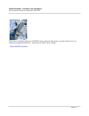 Smaki Portugalii - zrozumiesz, gdy spróbujesz! Wielki Konkurs Świąteczny Magazynu JACHTING Dzięki nam 5 czytelników Magazynu JACHTING, którzy poprawnie odpowiedzą na pytanie, będzie cieszyć się smakiem portugalskich delikatesów ! Zapraszamy do zabawy. Kosze czekają ! Zobacz plik PDF z pytaniami strona 1 / 1