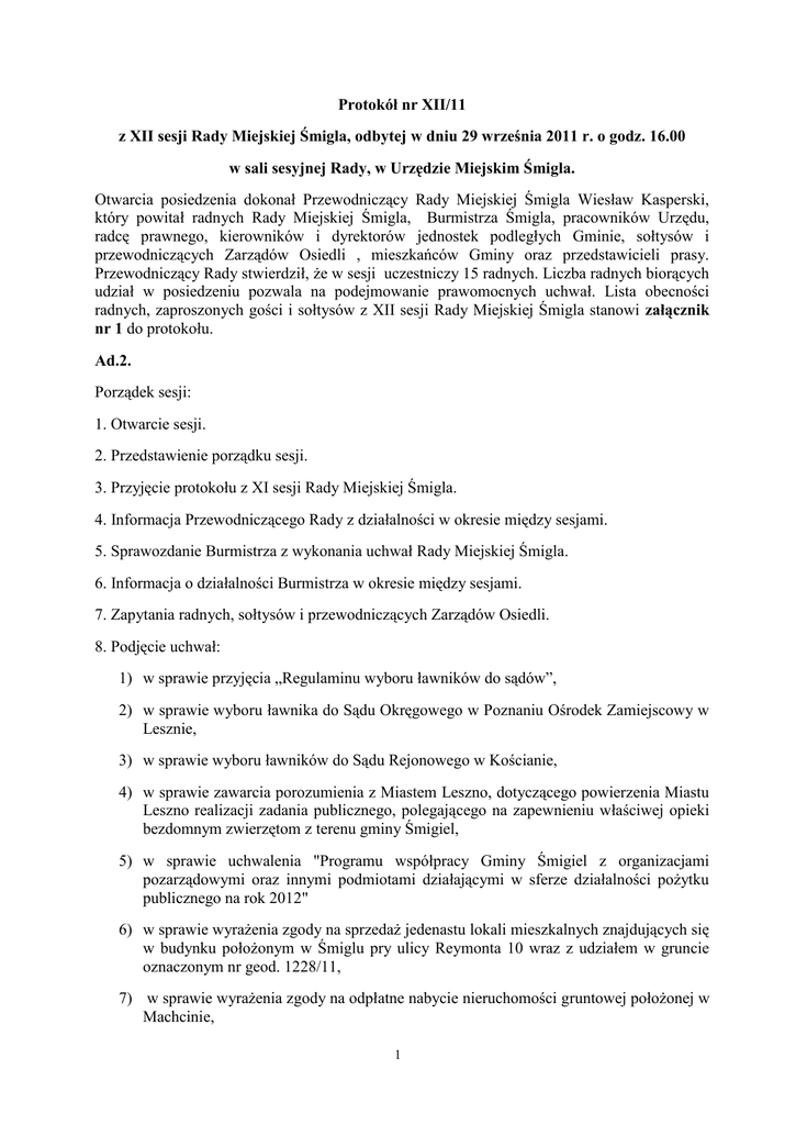 Protokół nr XII/11 z XII sesji Rady Miejskiej Śmigla, odbytej w dniu 29 września 2011 r. o godz. 16.00 w sali sesyjnej Rady, w Urzędzie Miejskim Śmigla. Otwarcia posiedzenia dokonał Przewodniczący Rady Miejskiej Śmigla Wiesław Kasperski, który powitał radnych Rady Miejskiej Śmigla, Burmistrza Śmigla, pracowników Urzędu, radcę prawnego, kierowników i dyrektorów jednostek podległych Gminie, sołtysów i przewodniczących Zarządów Osiedli , mieszkańców Gminy oraz przedstawicieli prasy. Przewodniczący Rady stwierdził, że w sesji uczestniczy 15 radnych. Liczba radnych biorących udział w posiedzeniu pozwala na podejmowanie prawomocnych uchwał. Lista obecności radnych, zaproszonych gości i sołtysów z XII sesji Rady Miejskiej Śmigla stanowi załącznik nr 1 do protokołu. Ad.2. Porządek sesji: 1. Otwarcie sesji. 2. Przedstawienie porządku sesji. 3. Przyjęcie protokołu z XI sesji Rady Miejskiej Śmigla. 4. Informacja Przewodniczącego Rady z działalności w okresie między sesjami. 5. Sprawozdanie Burmistrza z wykonania uchwał Rady Miejskiej Śmigla. 6. Informacja o działalności Burmistrza w okresie między sesjami. 7. Zapytania radnych, sołtysów i przewodniczących Zarządów Osiedli. 8. Podjęcie uchwał: 1) w sprawie przyjęcia „Regulaminu wyboru ławników do sądów”, 2) w sprawie wyboru ławnika do Sądu Okręgowego w Poznaniu Ośrodek Zamiejscowy w Lesznie, 3) w sprawie wyboru ławników do Sądu Rejonowego w Kościanie, 4) w sprawie zawarcia porozumienia z Miastem Leszno, dotyczącego powierzenia Miastu Leszno realizacji zadania publicznego, polegającego na zapewnieniu właściwej opieki bezdomnym zwierzętom z terenu gminy Śmigiel, 5) w sprawie uchwalenia "Programu współpracy Gminy Śmigiel z organizacjami pozarządowymi oraz innymi podmiotami działającymi w sferze działalności pożytku publicznego na rok 2012" 6) w sprawie wyrażenia zgody na sprzedaż jedenastu lokali mieszkalnych znajdujących się w budynku położonym w Śmiglu pry ulicy Reymonta 10 wraz z udziałem w gruncie oznaczonym nr geod. 1228/11, 7) w sprawie wyrażenia zgody na odpłatne nabycie nieruchomości gruntowej położonej w Machcinie, 1 8) w sprawie wyrażenia zgody na nabycie nieruchomości gruntowych położonych w Śmiglu, 9) w sprawie przyjęcia Gminnego Programu Profilaktyki i Rozwiązywania Problemów Alkoholowych na 2012 r., 10) w sprawie zatwierdzenia wzorów informacji o nieruchomościach i obiektach budowlanych o gruntach, o lasach oraz deklaracji na podatek od nieruchomości, podatek rolny i leśny, 11) w sprawie przyjęcia Gminnego programu przeciwdziałania przemocy w rodzinie oraz ochrony ofiar przemocy w rodzinie, 12) w sprawie zmiany Uchwały Nr XLIX/518/10 Rady Miejskiej Śmigla z dnia 24 czerwca w sprawie trybu prac nad projektem uchwały budżetowej Gminy Śmigiel, 13) w sprawie zasad udzielania spółkom wodnym dotacji celowej z budżetu Gminy Śmigiel oraz trybu postępowania w sprawie udzielenia dotacji i sposobu jej rozliczania, 14) w sprawie zaciągnięcia kredytu długoterminowego, 15) w sprawie: dokonania zmian w Wieloletniej Prognozie Finansowej Gminy Śmigiel na lata 2011 – 2023, 16) w sprawie zmian w budżecie Gminy Śmigiel na rok 2011. 9. Odpowiedzi na zapytania. 10.Wolne głosy i wnioski. 11.Zakończenie sesji. Ad.3. Przewodniczący Rady poddał pod głosowanie protokół z XI sesji Rady Miejskiej Śmigla. Poinformował, że wiernie odzwierciedla przebieg obrad. Uwag do protokołów nie wniesiono. „Za” przyjęciem protokołu z XI sesji głosowało 15 radnych. Protokół przyjęto jednogłośnie. Ad.4. Przewodniczący Rady Wiesław Kasperski przedstawił informację ze swej działalności w okresie między sesjami. Informacja stanowi załącznik nr 2 do protokołu. Radny Wojciech Adamczewski poprosił o przybliżenie punktu 10 dotyczącego wyjazdu delegacji do Francji. W jakim celu odbyła się wizyta? Przewodniczący Rady Wiesław Kasperski wyjaśnił, że wizyta odbyła się na zaproszenie partnerskiego miasta Neufchateau we Francji, podczas której nastąpiło uroczyste odsłonięcie tablicy pamiątkowej wszystkich partnerskich miast Neufchateau. Odbyło się również spotkanie w jednej ze szkół rolniczych, z którą szkoła w Nietążkowie ma podpisane porozumienie o współpracy. 2 Ad.5. Sprawozdanie Burmistrza Śmigla z wykonania uchwał Rady Miejskiej Śmigla stanowi załącznik nr 3 do protokołu. Pytań nie było. Ad.6. Informacja Burmistrza Śmigla z działalności w okresie między sesjami stanowi załącznik nr 4 do protokołu. Burmistrz nawiązał do kilku punktów z informacji: pkt 21 dotyczącego spotkania z przedstawicielami firmy „Creaton”. Przekazał, że na terenie Gminy Śmigiel ma powstać droga łącząca się z fabryką w Przysiece Polskiej, w sprawie której przygotowywane jest do podpisania porozumienie. Inwestorem formalnym będzie Gmina Śmigiel, ale środki w całości na zadanie pokrywa firma „Creaton”. Pkt 31 dotyczącego Śmigielskiej Kolei Dojazdowej. Burmistrz wyjaśnił na jakim etapie jest przygotowywanie się Gminy do przejęcia funkcji operatora i zarządzającego całą infrastrukturą Kolei. Trwa etap końcowy załatwiania wszelkich formalności w Urzędzie Transportu Kolejowego w Warszawie. Spodziewamy się w miesiącu październiku zakończenia całego procesu uzyskiwania stosownych zezwoleń. Wymagane dokumenty od Gminy zostały przygotowane i złożone w stosownej instytucji. Przewodniczący Rady Wiesław Kasperski poprosił o przybliżenie punktu 13 i 23 informacji Burmistrza. Burmistrz Śmigla Wiktor Snela odniósł się do: Pkt 13 dotyczącego spotkania z V-ce Kuratorem Oświaty Panią Dorotą Kinal w sprawie wyników sprawdzianów po VI klasie w Zespole Szkół w Starym Bojanowie. Szkoła ma opracować plan naprawczy, aby zmienić ten powtarzający się zły stan wyników w nauce. Wspólnie z kuratorem będzie prowadzony nadzór nad tym programem. Pkt 23 dotyczące