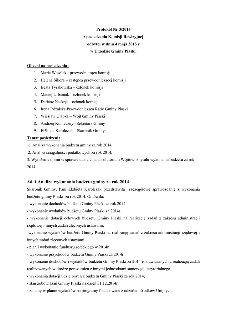 Protokół Nr 3/2015 z posiedzenia Komisji Rewizyjnej odbytej w dniu 4 maja 2015 r w Urzędzie Gminy Piaski. Obecni na posiedzeniu: 1. Maria Wesołek - przewodnicząca komisji 2. Helena Sikora – zastępca przewodniczącej komisji 3. Beata Tyrakowska – członek komisji 4. Maciej Urbaniak – członek komisji 5. Dariusz Naskręt – członek komisji 6. Irena Różalska Przewodnicząca Rady Gminy Piaski 7. Wiesław Glapka – Wójt Gminy Piaski 8. Andrzej Konieczny– Sekretarz Gminy 9. Elżbieta Karolczak – Skarbnik Gminy Temat posiedzenia: 1. Analiza wykonania budżetu gminy za rok 2014 2. Analiza ściągalności podatkowych za rok 2014, 3. Wyrażenie opinii w sprawie udzielenia absolutorium Wójtowi z tytułu wykonania budżetu za rok 2014. Ad. 1 Analiza wykonania budżetu gminy za rok 2014 Skarbnik Gminy, Pani Elżbieta Karolczak przedstawiła szczegółowe sprawozdanie z wykonania budżetu gminy Piaski za rok 2014. Omówiła: - wykonanie dochodów budżetu Gminy Piaski za rok 2014 - wykonanie wydatków budżetu Gminy Piaski za 2014r. - wykonanie dotacji celowych budżetu Gminy Piaski na realizację zadań z zakresu administracji rządowej i innych zadań zleconych ustawami, -wykonanie wydatków budżetu Gminy Piaski na realizację zadań z zakresu administracji rządowej i innych zadań zleconych ustawami, - plan i wykonanie funduszu sołeckiego w 2014r. - wykonanie przychodów budżetu Gminy Piaski za 2014r. - wykonanie dochodów i wydatków budżetu Gminy Piaski za 2014 rok związanych z realizacją zadań realizowanych w drodze porozumień z innymi jednostkami samorządu terytorialnego - wykonania dotacji udzielonych z budżetu Gminy Piaski za rok 2014, - stan zobowiązań Gminy Piaski na dzień 31.12.2014r. - zmiany w planie wydatków na programy finansowane z udziałem środków Unijnych - wykonanie wydatków majątkowych budżetu Gminy Piaski za rok 2014, - stopień realizacji programów wieloletnich na lata 2014 – 2017, - informację o stanie mienia komunalnego Gminy Piaski za rok 2014 - sprawozdania finansowe za 2014r. Gminnej Biblioteki Publicznej w Piaskach oraz Gminnego Ośrodka Kultury w piaskach. Odpowiadała na pytania radnych w tym zakresie. Pani Skarbnik zapoznała Komisję z uchwałą Nr SO-0954/28/10/Ln/2015 Składu Orzekającego Regionalnej Izby Obrachunkowej w Poznaniu, z dnia 16 kwietnia 2015 roku w sprawie wyrażenia opinii o sprawozdaniu z wykonania budżetu Gminy Piaski za rok 2014r. Uchwała RIO stanowi załącznik do protokołu. Komisja Rewizyjna nie wniosła uwag do przedstawionego sprawozdania z wykonania budżetu gminy Piaski za rok 2014. Ad. 2. Analiza ściągalności podatkowych za rok 2014 Skarbnik Gminy poinformowała, że zaległości podatkowe od osób fizycznych i osób prawnych na dzień 31. 12. 2014r. to 356 315,07 zł. W tym: - podatek od działalności gospodarczej osób fizycznych opłacany w formie karty podatkowej, - podatek od nieruchomości ( osoby fizyczne i prawne) - podatek rolny (osoby fizyczne i osoby prawne) - podatek od środków transportowych ( osoby fizyczne i prawne) - podatek od czynności cywilnoprawnych W związku z powyższymi zaległościami podjęto następujące czynności : wysłano 577 upomnień, 105 tytułów wykonawczych. Komisja Rewizyjna po przeanalizowaniu zaległości w podatkach stwierdziła, że upomnienia oraz tytuły wykonawcze są wystawiane na bieżąco. Ad. 3. Wyrażenie opinii w sprawie udzielenia absolutorium Wójtowi z tytułu wykonania budżetu za rok 2014. Komisja Rewizyjna nie wniosła uwag do przedstawionego sprawozdania z wykonania budżetu Gminy Piaski za rok 2014. Komisja Rewizyjna wyraziła pozytywną opinię o realizacji budżetu Gminy Piaski. Za udzieleniem absolutorium Wójtowi Gminy Piaski za rok 2014 wszyscy członkowie Komisji Rewizyjnej głosowali jednogłośnie. Następnie Komisja Rewizyjna sporządziła wniosek do Przewodniczącej Rady Gminy o udzielenie absolutorium dla Wójta Gminy za 2014 rok, który stanowi załącznik do protokołu. Wolne glosy i wnioski. Wójt Gminy, Pan Wiesław Glapka poruszył temat zbiórki odpadów komunalnych. Poinformował, że prawdopodobnie od przyszłego roku ceny za odpady komunalne będą wyższe. Podczas spotkania w Jarocinie podjęto dyskusję aby Porozumienie zamienić w Związek dlatego, że Związek ustala jednakową cenę za odpady komunalne dla wszystkich gmin. Zwrócił uwagę na nierzetelność firm odbierających odpady komunalne. Radny Dariusz Naskręt poprosił o posprzątanie śmieci w rowach przy trasie biegu Bojanowskiego. Radna Beata Tyrakowska poruszyła temat szamba w Szelejewie Drugim. Poinformowała, że szambo, które znajduje się przy prywatnej posesji jest wciąż jest zapełnione, nawet po opróżnieniu, po 4 godzinach już jest zapełnione i się przelewa. Właścicielka sklepu, przy której mieszczą się studzienki kilka razy pisała pisma w tej sprawie. Wójt Gminy poinformował, że wszyscy mieszkańcy, w miejscowościach w których nie ma kanalizacji powinni mieć szamba bezodpływowe. Prawdopodobnie jest tak, iż wszyscy mieszkańcy tego budynku podłączeni są pod jedno szambo. Należało by opróżnić szambo i zamurować wszystkie wloty i wtedy mieszkańcy pozostałych domów będą musieli pobudować sobie oddzielne szamba bezodpływowe. Radna Helena Sikora poinformowała, że przy ul. Chrobrego energetyka postawiła słup przy, którym nasypano stertę gliny. Zapytała czy jest możliwość sprzątnięcia gdyż podczas opadów deszczu glina będzie spadać na drogę. Wójt odpowiedział, że należy to pozostawić bo ziemia będzie upadać, w chwili obecnej należy obserwować co się będzie działo. Radna Helena Sikora zapytała o budowę drogi na Strefę Gospodarczą. Odpowiedzi udzielił Pan Wójt, informując, że Gmina otrzymała decyzję Wojewody Wielkopolskiego dotyczącą nieodpłatnego przekazania z mocy prawa części działki należącej do Nadleśnictwa Piaski będącą drogą gminną. Pan Wójt z