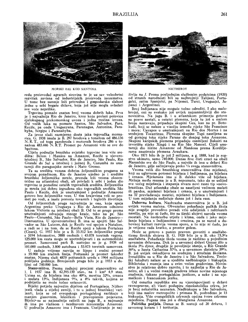 BRAZILIJA 261 MORSKI žAL KOD SANTOSA NICTHEROY redu proizvođač agrarnih sirovina te je uz sav veleobrtni razvitak zavisna od industrijskih proizvoda inozemstva. U tome bez sumnje leži privredna i gospodarska slabost jedne u sebi bogate države, koja još nije mogla svladati sve veće neprilike. Trgovinu pomaže znatan broj veoma dobrih luka. Prva je i najvažnija Rio de Janeiro, kroz koju prolazi polovica cjelokupnog prekomorskog uvoza i jedna trećina izvoza. Od većih luka su poznate Santos, Sao Salvador, Para, Recife, pa onda Uruguayana, Paranagua, Antonina, Para hyba, Sergipe i Paranahyba. Za izvoz služi razmjerno dosta jaka trgovačka morna rica. G. 1938 imala je B. 297 brodova s tonažom od 486.136 N. R. T., od toga parobroda i motornih brodova 286 s to nažom 483.446 N. R.T. Promet po Amazoni vrši se sve do Iquitosa. Cijelo područje brazilske svjetske trgovine ima više sre dišta: Belem i Manaas na Amazoni, Recife u sjevero istočnoj B., Sao Salvador, Rio de Janeiro, Sao Paulo, Rio Grande do Sul u istočnoj i južnoj B., Corumba za unu tarnji dio paraguajske zavale i Mato Grosso. Ta su središta vezana dobrim željezničkim prugama sa svojom pozadinom. Rio de Janeiro ujedno je i središte brazilske željezničke mreže, premda leži veoma ekscen trično na atlantskoj obali, ali privlači k sebi i jedan dio trgovine iz pozadine ostalih trgovačkih središta. 2eljeznička je mreža još dobro izgrađena oko trgovačkih središta Sao Paulo i Recife, dok je unutrašnjost i područje Amazone gotovo bez željezničke veze. U tim krajevima vrši se pro met po vodi, a inače pomoću tovarnih i teglećih životinja. Od željezničkih pruga najvažnija je ona, koja spaja Argentinu preko Uruguaya s Rio de Janeirom odnosno lukom Victoria na istočnoj obali B. Od te se pruge prema unutrašnjosti odvajaju mnoge kraće, tako na pr. Sao Paulo-Corumba, Sao Paulo-Bella Vista, Rio de Janeiro Diamantina. U sjeveroistočnoj B. ima se spojiti Sao Sal vador sa Sao Luizom, dok je Recife već spojen sNatalom, a radi se i na tom, da se Recife spoji s lukom Fortaleza (Ceara). G. 1937 bilo je u B. 33.512 km željezničke pruge s 5194 lokomotive, 3888 osobnih i 45.078 teretnih vagona. 125.000 km cesta mogu se upotrebljavati i za automobilski promet. Samovozni park B. sastojao se je g. 1938 od 101.000 osobnih, 3.800 autobusa i 53.875 teretnih samovoza. U zadnje vrijeme razvija se lijepo i zračni promet s 55.900 km zračnih linija. Poštanski je promet također znatan. Njemu služi 4870 poštanskih ureda s 1964 milijuna pošiljaka godišnje. Brzojavnih pruga bilo je g. 1933 u du ljini od 740.000 km. Stanovništvo. Prema zadnjoj procjeni stanovništvo od 1. L 1937 ima B. 42,395.150 stan., na 1 km 2 4,9 stan. Uzima se, da bijelaca ima oko 40%, mestica 32 % , crnaca i mulata 150/0, Indijanaca 90/0, a 40/0 takvih, kojima se podrijetlo ne može točno ustanoviti. Bijelci potječu najvećim dijelom od Portugalaca. Njihov jezik vlada u cijeloj zemlji, i to u jednoj brazilskoj vari janti, koja se od evropskoga portugalskog razlikuje u manjim glasovnim, leksičkim i pravopisnim pojavama. Bije1ci~ su se najsnažnije raširili na jugu B., a najmanje ih ima po vlažnom i nezdravom nizozemlju Amazone. U području Amazone ima i Francuza. Useljivanje je naj- življe na J. Prema posljednjim službenim podatcima (1920) od stranih narodnosti bili su najbrojniji Talijani, Portu galci, zatim Španjolci, pa Nijemci, Turci, Uruguajci, Ja panci i Argentinci. Broj Indijanaca nije moguće točno odrediti. I ako malo brojni, oni su svakako još uvijek najzanimljiviji dio sta novništva. Na jugu B. i u atlantskom primorju gotovo su posve nestali, a ostatci plemena, koja tu još u malom broju nastavaju, pripadaju skupini Ges, kao na pr. Boto kudi, koji se nalaze u visočju između rijeke Sao Francisco i mora; Cayapos u unutrašnjosti na Rio dos Mortes i na srednjem Tocantinsu. Plemena skupine Tupi naseljena su od gornjeg toka rijeke Parane do donjeg toka Amazone. Skupini karipskih plemena pripadaju osamljeni Bakairi na izvorištu rijeke Xingu i na Rio Sao Manoel. Cijeli unu tarnji dio nizine Amazone od Manaosa prema Kordilje rama zauzimaju plemena Araukara. Oko 1871 bilo ih je još 2 milijuna, a g. 1888, kad je rop stvo ukinuto, samo 740.000. Danas žive čisti crnci na obali Maranhao sve do Sao Paulo, a najviše ih ima u državi Rio de Janeiro, gdje sačinjavaju preko 1/3 svega stanovništva. yeoma velik dio brazilskog stanovništva čine mješanci, kOJi su uglavnom potomci bijelaca i Indijanaca, pa bijelaca i crnaca. Mješanaca ima u B. daleko više od bijelaca. Mržnja među rasama je u B. nepoznata, tako da se uslijed sve većeg miješanja i stapanja stvara novi rasni tip »novo brazilca«. Duž atlantske obale su naseljeni većinom mulati ili pardos, mješanci bijelaca i crnaca, a u unutrašnjosti i na SI prevladavaju mestici, mješanci bijelaca i Indijanaca. U tom miješanju sudjeluje danas još i žuta rasa. Duhovna kultura. Naobrazba stanovništva je u B. još uvijek veoma malena. Obvezatno pohađanje pučkih škola nije svagdje provediva poradi vrlo udaljenih i raštrkanih naselja, pa nije ni čudo, što su široki slojevi naroda veoma zaostali. Na naobrazbu utječe i klima, onda i jako mije šanje bijelaca s Indijancima i crncima, pa se narod u du hovnoj kulturi razvija veoma sporo, a to nije ni čudo, jer je vrijeme rada kratko, a prostor golem. Može se gotovo s punim pravom govoriti o analfabe tizrnu širokih slojeva B. G. 1920 bilo je u B. oko 75,50/0 analfabeta. Pohađanje škola veoma je različno u pojedinim saveznim državama. Dok je u saveznoj državi Goyaz išlo u školu 50/0 djece, drugdje je povoljnije stanje, u Rio Grande 560/0, u Santa Catharina 570/0, a u saveznom distriktu 590/0. B. još uvijek oskudijeva na srednjim i stručnim školama. Sveučilišta su u Rio de Janeiru i u Sao Salvadoru. Teolo ški fakulteti nalaze se u sjedištu nadbiskupije i biskupija. Biblioteka i muzeja ima u svim većim gradovim