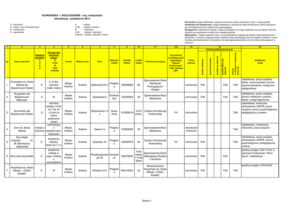 SCHRONISKA I NOCLEGOWNIE - woj. małopolskie aktualizacja - poździernik 2013 Lp. Nazwa placówki Kategoria placówki: S H N O Do kogo jest kierowana usługa: K K+Dz M K+M K+M+Dz 1 Przytulisko św. Brata Alberta dla Bezdomnych Kobiet 2 Przytulisko dla Bezdomnych Mężczyzn 3 4 5 6 7 S S 5 Powiat K, K+Dz, samotne matki i dzieci Miasto Kraków M Miasto Kraków samotne kobiety, K+Dz od 7 do 18 Schronisko dla Miasto S r.ż.(lub do Bezdomnych Kobiet Kraków końca pobierania nauki) wychodzący Dom św. Brata mieszk.c z Miasto Alberta hronione bezdomności - Kraków mężczyźni Dom Matki bezdomne i Dziecka im. Miasto S kobiety+ Bł. Bernardyny Kraków dzieci do 7 r.ż, Jabłońskiej bezdomne kobiety w Miasto Dom Samotnej Matki S ciąży i kobiety Kraków z noworodkami Wspólnota św. Brata Alberta ,, Chleb i Światło" S M Miasto Kraków 6 Miejscowość 7 Ulica 8 Dzielnica miasta 9 Kontakt telefon Malborska 64 b Podgórz 126556820 e Kraków Skawińska 6 Śródmie 124295664 ście Kraków Sołtysowska 13 c Kraków Kraków Kraków Kraków Kraków Nowa Huta 10 11 Liczba miejsc Podmiot prowadzący 60 Zgromadzenie Sióstr Albertynek Posługujących Ubogim 58 Zgromadzenie Braci Albertynów 12/3506310 53+6 Caritas Archidiecezji interw. Krakowskiej Saska 9 a Podgórz 122926065 e 50 Zgromadzenie Braci Albertynów Żywiecka 16 Podgórz 122693579 e 60 Caritas Archidiecezji Krakowskiej 9 dla Zgromadzenie Sióstr Przybyszewskie Krowodr kobiet 126378542 Najświętszej Rodziny go 39 za + 9 dla z Nazaretu dzieci Wielicka 44 b Podgórz 500316524 e 22 Stowarzyszenie Wspólnota św. Brata Alberta ,,Chleb i Światło" Strona 1 11A Czy podmiot prowadzący jest Organizacją Pożyrku Publicznego? "TAK" jeśli jest OPP Forma pomocy schronisko schronisko TAK 13 Rodzaj dodatkowej pomocy: 12 TAK TAK TAK TAK schronisko schronisko schronisko TAK TAK TAK mieszkania chronione TAK 14 pomoc w zdobyciu mieszkania, pracy itp. 4 posiłek kilka razy dziennie 3 posiłek raz dziennie 2 pomoc finansowa 1 Schronisko-usługa całodobowa; czasowe schronienie, pełne wyżywienie (w tym 1 ciepły posiłek) Hostel/dom dla bezdomnych -usługa całodobowa, czasowe lub stałe zamieszkanie, pełne wyżywienie plus kompleksowa pomoc opiekuńczo-wspomagająca Noclegownia -zapewnienie noclegu. Osoby korzystające nie mogą znajdować się pod wływem alkoholu. Sypialnie są wyposażone w łóżka oraz niezbędną pościel. Ogrzewalnia - miejsce spędzenia nocy, na jej wyposażeniu znajdują się krzesła i ławki (podobnie jak w poczekalni). Z pomocy mogą korzystać wszystkie osoby potrzebujące (też pod wpływem alkoholu i innych środków psychoaktywnych), które jednak nie zagrażają bezpieczeństwu innych osób przebywających w placówce K - kobiety K+Dz - kobiety z dziećmi M - mężczyźni K+M - kobiety i mężczyźni K+M+Dz - kobiety, mężczyźni i dzieci pomoc rzeczowa S - schronisko H - hostel - dom dla bezdomnych N - noclegownia O - ogrzewalnia TAK TAK TAK TAK dodatkowe uwagi całodobowo, praca socjalna, łaźnia, suchy prowiant, pomoc prawna (doraźnie), medyczna i pielęgniarska całodobowo, praca socjalna, pomoc medyczna i prawna, łaźnia i usługi higieniczne całodobowo, konieczne skierowanie z MOPS, praca socjalna, pomoc psychologiczna, pedagogiczna, prawna całodobowo, mieszkania chronione, praca socjalna całodobowo, praca socjalna, skierowanie z MOPS, pomoc psychologiczna, pedagogiczna, prawna godziny przyjęć: 9:00-17:00, w placówce funkcjonuje "Okno Życia": całodobowo TAK godziny przyjęći: 8:00-20:00 schronisko TAK TAK TAK Do kogo jest kierowana usługa: K K+Dz M K+M K+M+Dz 8 Noclegownia dla Bezdomnych Mężczyzn 9 Noclegownia i Schrtonisko dla Bezdomnych Mężczyzn 10 Małopolski Zespół Hosteli SocjalnoReadaptacyjnych Noclegownia 11 Chrześcijański Ośrodek Pomocy Bezdomnym "Dom Łazarza" Małopolskie Centrum 12 Integracji "Pro Domo" N M N, S M N osoby bezdomne uzależnione od narkotyków S S Powiat Miasto Kraków Miasto Kraków Miasto Kraków 6 Miejscowość Kraków Kraków 7 Ulica 8 Dzielnica miasta 9 Kontakt telefon 10 11 Liczba miejsc Podmiot prowadzący 11A Czy podmiot prowadzący jest Organizacją Pożyrku Publicznego? "TAK" jeśli jest OPP 38 ( w okresi e Śródmie Zgromadzenie Braci Skawińska 6 124295664 silnych ście Albertynów mrozó w 60 osób) Nocleg owniaMakuszyńskieg Nowa 126840373 138, Polski Komitet o 19a Huta 126840324 Schron Pomocy Społecznej isko62 13 Rodzaj dodatkowej pomocy: 12 Forma pomocy TAK TAK Krzemieniecka Podgórz 606203156 63 e 24 (max. do 28) Monar Kraków Kraków 32 (max.3 8w Podgórz Nowogródzka 8 501434109 okresi e e zimow ym) Stowarzyszenie Dobroczynne ,, Betlejem" schronisko 12 Podgórz 124235570 (max.1 e 4) Małopolskie Stowarzyszenie Probacja Dom readapracy jny TAK M Miasto Kraków M Miasto Kraków Kraków Czyżówka 50 TAK noclegowni a TAK 13 Dom Wsparcia N M wadowicki Andrychów Batorego 48 i 52 338753300 23 Ośrodek Pomocy Społecznej noclegowni a TAK 14 Noclegownia dla Bezdomnych Mężczyzn N M brzeski Brzesko Cegielniana 1/2 146863998 16 MOPS w Brzesku noclegowni a TAK 15 Noclegownia N M oświęcims ki Brzeszcze Mickiewicza 6 322111251 20 OPS w Brzeszczach noclegowni a TAK 16 Noclegownia dla Mężczyzn N M chrzanows ki Chrzanów Fabryczna 29b 40 (+ do 10 327506251 dostaw ek) MGOPS w Chrzanowie noclegowni a 17 Lokalny Dom dla Bezdomnych S wszyscy ( z terenu gminy) gorlicki Gładyszów 51 7 Gmina Ujście Gorlickie schronisko 36 Chrześcijańskie Stowarzyszenie Dobroczynne 18 Schronisko dla Bezdomnych S wszyscy olkuski Gorenice 183516491 ul. Chrzanowska 2 32 6471441 32 6456167 TAK czynna od g. 16:00 - 8:00, usługi opiekuńcze dla 50 os., praca socjalna, pomoc prawna, łaźnia czynna od 18:00- 10:00, pomoc terapeutyczna i prawna, pielęgniarsko-medyczna, łaźnia, wymiana sprzętu iniekcyjnego, zbiór zużytego sprzętu, suchy prowiant całodobowo, suchy prowiant, pomoc medyczna Kraków TAK dodatkowe uwagi czynna w okresie zimowym, od godz. 19:00 do 6:50, śniadania