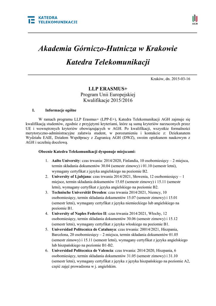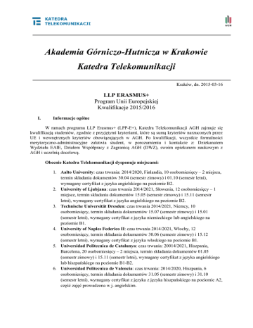 Akademia Górniczo-Hutnicza w Krakowie Katedra Telekomunikacji Kraków, dn. 2015-03-16 LLP ERASMUS+ Program Unii Europejskiej Kwalifikacje 2015/2016 I. Informacje ogólne W ramach programu LLP Erasmus+ (LPP-E+), Katedra Telekomunikacji AGH zajmuje się kwalifikacją studentów, zgodnie z przyjętymi kryteriami, które są sumą kryteriów narzuconych przez UE i wewnętrznych kryteriów obowiązujących w AGH. Po kwalifikacji, wszystkie formalności merytoryczno-administracyjne załatwia student, w porozumieniu i kontakcie z: Dziekanatem Wydziału EAIE, Działem Współpracy z Zagranicą AGH (DWZ), swoim opiekunem naukowym z AGH i uczelnią docelową. Obecnie Katedra Telekomunikacji dysponuje miejscami: 1. Aalto University: czas trwania: 2014/2020, Finlandia, 10 osobomiesięcy – 2 miejsca, termin składania dokumentów 30.04 (semestr zimowy) i 01.10 (semestr letni), wymagany certyfikat z języka angielskiego na poziomie B2. 2. University of Ljubjana: czas trwania 2014/2021, Słowenia, 12 osobomiesięcy – 1 miejsce, termin składania dokumentów 15.05 (semestr zimowy) i 15.11 (semestr letni), wymagany certyfikat z języka angielskiego na poziomie B2. 3. Technische Universität Dresden: czas trwania 2014/2021, Niemcy, 10 osobomiesięcy, termin składania dokumentów 15.07 (semestr zimowy) i 15.01 (semestr letni), wymagany certyfikat z języka niemieckiego lub angielskiego na poziomie B1. 4. University of Naples Federico II: czas trwania 2014/2021, Włochy, 12 osobomiesięcy, termin składania dokumentów 30.06 (semestr zimowy) i 15.12 (semestr letni), wymagany certyfikat z języka włoskiego na poziomie B1. 5. Universidad Politecnica de Catalunya: czas trwania: 20014/2021, Hiszpania, Barcelona, 20 osobomiesięcy – 2 miejsca, termin składania dokumentów 01.05 (semestr zimowy) i 15.11 (semestr letni), wymagany certyfikat z języka angielskiego lub hiszpańskiego na poziomie B1-B2. 6. Universidad Politecnica de Valencia: czas trwania: 2014/2020, Hiszpania, 6 osobomiesięcy, termin składania dokumentów 31.05 (semestr zimowy) i 31.10 (semestr letni), wymagany certyfikat z języka z języka hiszpańskiego na poziomie A2, część zajęć prowadzona w j. angielskim. 7. University of L’Aquila: czas trwania 2014/2021, Włochy, 12 osobomiesięcy, termin składania dokumentów 30.06 (semestr zimowy) i 31.10 (semestr letni), wymagany certyfikat z języka włoskiego i angielskiego na poziomie B1. 8. Telecom ParisTech: czas trwania: 2014/2020, Francja, 18 osobomiesięcy - 2 miejsca, termin składania dokumentów 31.05 (semestr zimowy) i 30.11 (semestr letni), wymagany certyfikat z języka z języka francuskiego na poziomie A2 dla oddziału w Paryżu, wymagany certyfikat z języka z języka angielskiego na poziomie TOEFL:550/ IELTS: 5,5/ TOEIC 750/ Cambridge CAE dla oddziału w Sophia Antipolis. II. Formalne kryteria pozwalające uzyskać status studenta programu LLP Erasmus (opracowano na podstawie informacji na stronie WWW DWZ AGH: www.dwz.agh.edu.pl ) 1. Pomyślne zaliczenie co najmniej pierwszego roku studiów; zdecydowanie preferowani są jednak studenci lat dyplomowych, doktoranci oraz studenci indywidualni. 2. Średnia ocen ze wszystkich lat co najmniej 3,80. 3. Znajomość języka obcego w stopniu umożliwiającym czynne uczestniczenie w procesie studiowania na uczelni wyższej; musi być to język narodowy kraju uczelni przyjmującej lub język w którym prowadzone są tam zajęcia. Szczegółowa hierarchia wymagań podana jest na stronie WWW DWZ AGH. 4. Ustalony z opiekunem naukowym w AGH i/lub w uczelni przyjmującej program studiów, zapewniający studentowi zaliczenie w AGH bez opóźnień okresu studiów zagranicznych. 5. Okres pobytu studenta nie powinien wykraczać poza termin przewidywanej obrony pracy dyplomowej. III. Szczegółowe zasady kwalifikacji studentów do programu LLP Erasmus w Katedrze Telekomunikacji AGH 1. Preferowani są studenci najstarszych lat studiów o specjalności Telekomunikacja 2. Udokumentowana znajomość języka wymaganego przez stronę przyjmującą. Hierarchia ważności dokumentów potwierdzających znajomość języka podana jest przez DWZ AGH (strona WWW DWZ). 3. Średnia ocen ze wszystkich lat co najmniej 3,80. 4. Specjalność zgodna ze specjalnością życzoną przez stronę przyjmującą. 5. Wypełniona ANKIETA INFORMACYJNA KANDYDATA (dla celów rekrutacji) wraz z załącznikami – formatka na stronie WWW DWZ. (PROSZĘ uważnie PRZECZYTAĆ „uwagi końcowe” pkt. 2) 6. Rozmowa kwalifikacyjna w Katedrze Telekomunikacji IV. Uwagi organizacyjne Wszelkie informacje o programie LLP Erasmus+, a w szczególności zasady organizacji wyjazdu umieszczone są na stronie WWW Działu Współpracy z Zagranicą AGH (stronę tę polecamy szczególnie!): www.dwz.agh.edu.pl oraz na stronie WWW Katedry Telekomunikacji, a informacje ogólne na stronie www.erasmus.org.pl (dawniej: www.socrates.org.pl/erasmus). Katedra Telekomunikacji oddaje do Dziekanatu proponowaną listę studentów. Dziekan i strona przyjmująca mają decydujące zdanie w akceptacji kandydata. Przed wyjazdem student wypełnia „Learning Agreement”, gdzie istotny jest program studiów utworzony wraz z opiekunem naukowym studenta. Przy tworzeniu programu studiów należy wziąć pod uwagę przedmioty wykładane na uczelni docelowej, tak aby były zgodne (na ile to możliwe) z przedmiotami obowiązującymi studenta w AGH i tematem jego pracy. Wyjazd traktowany jest m.in. jako zbieranie materiałów do pracy (zajęć) studenta, która została zdefiniowana na uczelni macierzystej. Okres studiów zagranicznych zostaje zaliczony studentowi jako okres studiów na uczelni macierzystej i dlatego Dziekan Wydziału zwraca szczególną uwagę na zgodność przedmiotów wybranych przez studenta w uczelni zagranicznej z przedmiotami obowiązującymi na kierunku w uczelni macierzystej. Nie przewiduje się pobrania tematu pracy dyplomowej przez studenta w uczelni zagranicznej i jej wykonanie w czasie w