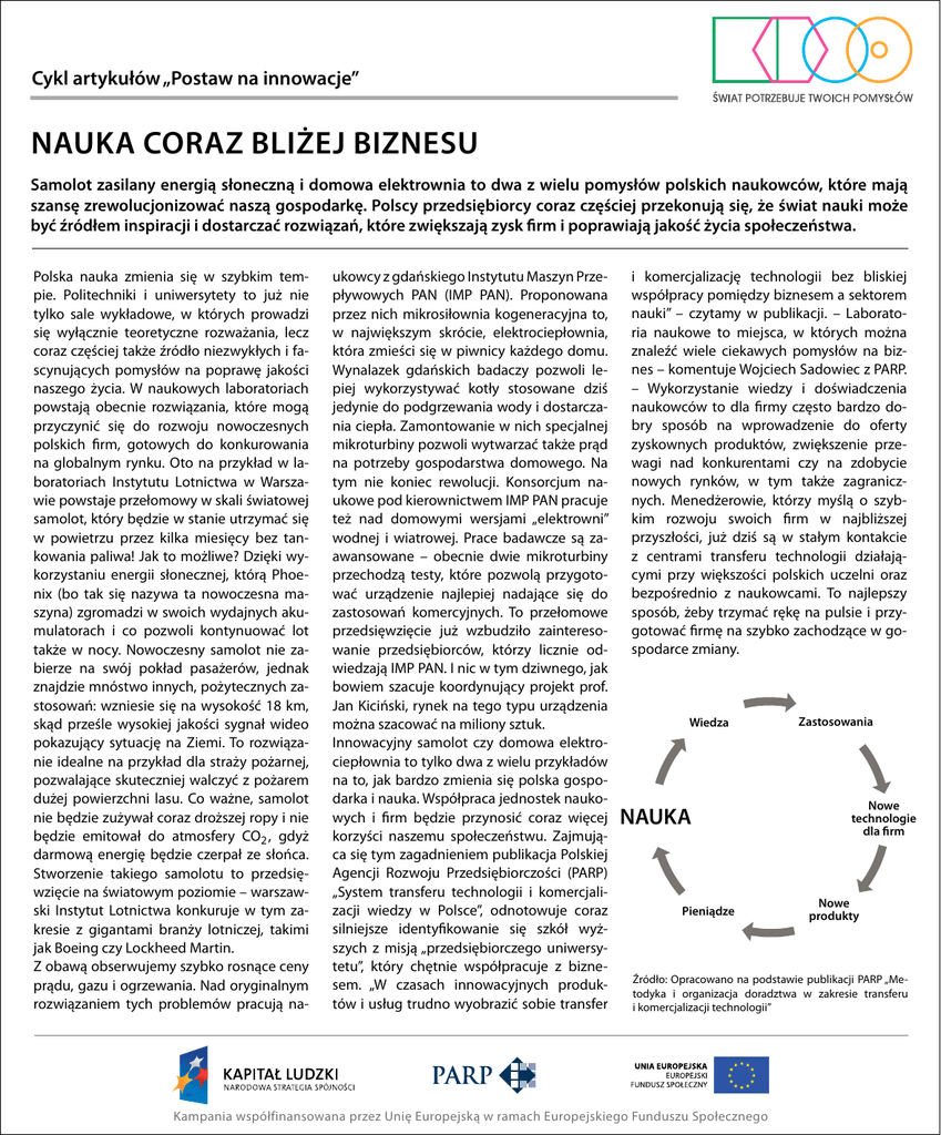 Cykl artykułów „Postaw na innowacje” Nauka coraz bliżej biznesu Samolot zasilany energią słoneczną i domowa elektrownia to dwa z wielu pomysłów polskich naukowców, które mają szansę zrewolucjonizować naszą gospodarkę. Polscy przedsiębiorcy coraz częściej przekonują się, że świat nauki może być źródłem inspiracji i dostarczać rozwiązań, które zwiększają zysk firm i poprawiają jakość życia społeczeństwa. Polska nauka zmienia się w szybkim tempie. Politechniki i uniwersytety to już nie tylko sale wykładowe, w których prowadzi się wyłącznie teoretyczne rozważania, lecz coraz częściej także źródło niezwykłych i fascynujących pomysłów na poprawę jakości naszego życia. W naukowych laboratoriach powstają obecnie rozwiązania, które mogą przyczynić się do rozwoju nowoczesnych polskich firm, gotowych do konkurowania na globalnym rynku. Oto na przykład w laboratoriach Instytutu Lotnictwa w Warszawie powstaje przełomowy w skali światowej samolot, który będzie w stanie utrzymać się w powietrzu przez kilka miesięcy bez tankowania paliwa! Jak to możliwe? Dzięki wykorzystaniu energii słonecznej, którą Phoenix (bo tak się nazywa ta nowoczesna maszyna) zgromadzi w swoich wydajnych akumulatorach i co pozwoli kontynuować lot także w nocy. Nowoczesny samolot nie zabierze na swój pokład pasażerów, jednak znajdzie mnóstwo innych, pożytecznych zastosowań: wzniesie się na wysokość 18 km, skąd prześle wysokiej jakości sygnał wideo pokazujący sytuację na Ziemi. To rozwiązanie idealne na przykład dla straży pożarnej, pozwalające skuteczniej walczyć z pożarem dużej powierzchni lasu. Co ważne, samolot nie będzie zużywał coraz droższej ropy i nie będzie emitował do atmosfery CO2 , gdyż darmową energię będzie czerpał ze słońca. Stworzenie takiego samolotu to przedsięwzięcie na światowym poziomie – warszawski Instytut Lotnictwa konkuruje w tym zakresie z gigantami branży lotniczej, takimi jak Boeing czy Lockheed Martin. Z obawą obserwujemy szybko rosnące ceny prądu, gazu i ogrzewania. Nad oryginalnym rozwiązaniem tych problemów pracują na- ukowcy z gdańskiego Instytutu Maszyn Przepływowych PAN (IMP PAN). Proponowana przez nich mikrosiłownia kogeneracyjna to, w największym skrócie, elektrociepłownia, która zmieści się w piwnicy każdego domu. Wynalazek gdańskich badaczy pozwoli lepiej wykorzystywać kotły stosowane dziś jedynie do podgrzewania wody i dostarczania ciepła. Zamontowanie w nich specjalnej mikroturbiny pozwoli wytwarzać także prąd na potrzeby gospodarstwa domowego. Na tym nie koniec rewolucji. Konsorcjum naukowe pod kierownictwem IMP PAN pracuje też nad domowymi wersjami „elektrowni” wodnej i wiatrowej. Prace badawcze są zaawansowane – obecnie dwie mikroturbiny przechodzą testy, które pozwolą przygotować urządzenie najlepiej nadające się do zastosowań komercyjnych. To przełomowe przedsięwzięcie już wzbudziło zainteresowanie przedsiębiorców, którzy licznie odwiedzają IMP PAN. I nic w tym dziwnego, jak bowiem szacuje koordynujący projekt prof. Jan Kiciński, rynek na tego typu urządzenia można szacować na miliony sztuk. Innowacyjny samolot czy domowa elektrociepłownia to tylko dwa z wielu przykładów na to, jak bardzo zmienia się polska gospodarka i nauka. Współpraca jednostek naukowych i firm będzie przynosić coraz więcej korzyści naszemu społeczeństwu. Zajmująca się tym zagadnieniem publikacja Polskiej Agencji Rozwoju Przedsiębiorczości (PARP) „System transferu technologii i komercjalizacji wiedzy w Polsce”, odnotowuje coraz silniejsze identyfikowanie się szkół wyższych z misją „przedsiębiorczego uniwersytetu”, który chętnie współpracuje z biznesem. „W czasach innowacyjnych produktów i usług trudno wyobrazić sobie transfer i komercjalizację technologii bez bliskiej współpracy pomiędzy biznesem a sektorem nauki” – czytamy w publikacji. – Laboratoria naukowe to miejsca, w których można znaleźć wiele ciekawych pomysłów na biznes – komentuje Wojciech Sadowiec z PARP. – Wykorzystanie wiedzy i doświadczenia naukowców to dla firmy często bardzo dobry sposób na wprowadzenie do oferty zyskownych produktów, zwiększenie przewagi nad konkurentami czy na zdobycie nowych rynków, w tym także zagranicznych. Menedżerowie, którzy myślą o szybkim rozwoju swoich firm w najbliższej przyszłości, już dziś są w stałym kontakcie z centrami transferu technologii działającymi przy większości polskich uczelni oraz bezpośrednio z naukowcami. To najlepszy sposób, żeby trzymać rękę na pulsie i przygotować firmę na szybko zachodzące w gospodarce zmiany. Wiedza NAUKA Pieniądze Zastosowania Nowe technologie dla firm Nowe produkty Źródło: Opracowano na podstawie publikacji PARP „Metodyka i organizacja doradztwa w zakresie transferu i komercjalizacji technologii” Kampania współfinansowana przez Unię Europejską w ramach Europejskiego Funduszu Społecznego