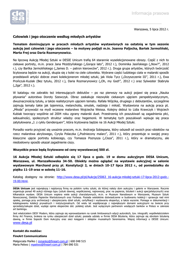 Informacja prasowa Warszawa, 5 lipca 2012 r. Człowiek i jego otoczenie według młodych artystów Tematem dominującym w pracach młodych artystów wystawionych na ostatnią w tym sezonie aukcję jest człowiek i jego otoczenie – te motywy podjęli m.in. Joanna Paljocha, Bartek Jarmoliński, Marta Frej oraz Daria Rozmarynowicz. Na lipcową Aukcję Młodej Sztuki w DESIE Unicum trafią 64 starannie wyselekcjonowane obrazy. Część z nich to ciekawe portrety, m.in. prace Jana Możdżyńskiego („Gorące lato”, 2012 r.), Dominika Jasińskiego („Now?”, 2012 r.), czy Bartka Jarmolińskiego („James D. – patron kierowców”, 2012 r.). Druga grupa artystów, których twórczość licytowana będzie na aukcji, skupia się z kolei na ciele człowieka. Wybrane części ludzkiego ciała w malarski sposób przedstawili artyści dobrze znani kolekcjonerom młodej sztuki, jak Viola Tycz („Oczyszczenie III”, 2011 r.), Ewa Prończuk-Kuziak (Bez tytułu, 2012 r.), Daria Rozmarynowicz („Oh, my God!”, 2012 r.) oraz Sylwester Stabryła („2ga”, 2012 r.). W katalogu nie zabrakło też interesujących debiutów – po raz pierwszy na aukcji pojawi się praca „Nauka pływania” autorstwa Doroty Szewczyk. Obraz zaskakuje niezwykle ciekawym ujęciem perspektywistycznym, dwuznacznością tytułu, a także realistycznym ujęciem tematu. Rafała Wójcika, drugiego z debiutantów, szczególnie zajmują tematy takie jak tajemnica, melancholia, smutek, nadzieja i miłość. Wystawiona na aukcję praca pt. „Młoda” przywodzi na myśl wczesne malarstwo Wojciecha Weissa. Kolejny debiut to Lidia Krawczyk i Wojciech Kubiak tworzący wspólnie od 2004 roku zgrany malarski duet. Przestrzenią ich poszukiwań są zagadnienia płci, seksualności, społecznych struktur władzy oraz hegemonii. W tematykę tych poszukiwań wpisuje się praca zatytułowana „J. z cyklu Genderquerr”, która licytowana będzie na 16 Aukcji Młodej Sztuki. Ponadto warto przyjrzeć się uważnie pracom, m.in. Andrzeja Sobiepana, który odszedł od swoich prac-obiektów na rzecz malarstwa akrylowego, Cyryla Polaczka („Podniecony malarz”, 2011 r.), który prezentuje w swojej pracy klasyczne ujęcie portretu kobiecego, czy Tomasza Poznysza („Cisza”, 2011 r.), który w dramatyczny, ale niedosłowny sposób ukazał zagadnienie ciszy. Wszystkie prace będą licytowane od ceny wywoławczej 500 zł. 16 Aukcja Młodej Sztuki odbędzie się 17 lipca o godz. 19 w domu aukcyjnym DESA Unicum, Warszawa, ul. Marszałkowska 34-50. Obiekty można oglądać na wystawie aukcyjnej w salonie wystawowym Marchand przy pl. Konstytucji 2, w dniach 10-17 lipca 2012 r., od poniedziałku do piątku 11-19 oraz w sobotę 11-16. Katalog dostępny na stronie: http://www.desa.pl/pl/Aukcje/25063_16-aukcja-mlodej-sztuki-17-lipca-2012-godz.19.00.html. DESA Unicum jest największą i najstarszą firmą na polskim rynku sztuki, do której należy dom aukcyjny i galerie w Warszawie. Rocznie organizuje ponad 40 aukcji różnego typu (sztuki dawnej, współczesnej, najnowszej, prac na papierze, biżuterii i aukcji specjalistycznych) oraz kilkanaście wystaw. DESA Unicum wspiera wiele aukcji charytatywnych, m.in. w Muzeum Narodowym w Warszawie, Muzeum Sztuki Nowoczesnej, Giełdzie Papierów Wartościowych oraz Forbesa. Posiada wieloletnie doświadczenie w budowaniu kolekcji i sprawuje nad nimi opiekę, pomaga przy archiwizacji i ubezpieczaniu dzieł sztuki, certyfikacji i wydawaniu ekspertyz, a także wycenie. Pomaga w dokumentacji i katalogowaniu kolekcji prywatnych i instytucjonalnych. Od wielu lat współpracuje z największymi domami aukcyjnymi na świecie przy sprzedaży/zakupie dzieł, wydaje opinie eksperckie dot. polskiej sztuki. Jest wyłącznym partnerem wiodących banków w Polsce w zakresie art bankingu. Jest właścicielem DESY Modern, która zajmuje się wprowadzaniem na rynek limitowanych edycji autorskich, tzw. inkografii; współwłaścicielem firmy Art Finance, brokera na rynku ubezpieczeń dzieł sztuki; posiada udziały w firmie DESA Biżuteria, która zajmuje się obrotem biżuterią dawną, w firmie Sopocki Dom Aukcyjny oraz sieci księgarni i sklepów muzealnych Serenissima. Więcej informacji o DESIE Unicum: www.desa.pl Kontakt dla mediów: FineArt Communications Małgorzata Mańko | [email protected] | 600 048 515 Maria Peliwo | [email protected] | 784 090 531