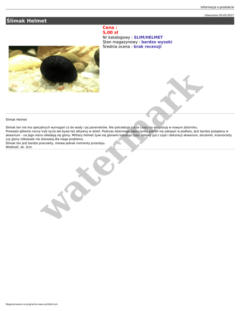 Informacje o produkcie Utworzono 03-03-2017 Ślimak Helmet Cena : 5,00 zł er m ar k Nr katalogowy : SLIM/HELMET Stan magazynowy : bardzo wysoki Średnia ocena : brak recenzji Ślimak Helmet w at Ślimak ten nie ma specjalnych wymagań co do wody i jej parametrów. Nie potrzebuje także czasu na adaptację w nowym zbiorniku. Prowadzi głównie nocny tryb życia ale bywa też aktywny w dzień. Podczas dziennego odpoczynku potrafi się zakopać w podłożu. Jest bardzo pożądany w akwarium – na jego menu składają się glony. Military helmet żywi się glonami każdego typu: zielony pył z szyb i dekoracji akwarium, okrzemki, krasnorosty czy glony nitkowate nie stanowią dla niego problemu. Ślimak ten jest bardzo pracowity, miewa jednak momenty przestoju. Wielkość: ok. 3cm Wygenerowano w programie www.oscGold.com