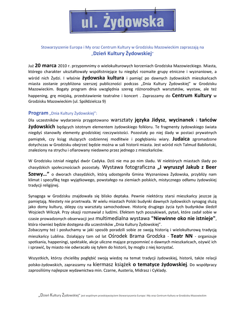 Stowarzyszenie Europa i My oraz Centrum Kultury w Grodzisku Mazowieckim zapraszają na „Dzieo Kultury Żydowskiej” Już 20 marca 2010 r. przypomnimy o wielokulturowych korzeniach Grodziska Mazowieckiego. Miasta, którego charakter ukształtowały współistniejące tu niegdyś rozmaite grupy etniczne i wyznaniowe, a wśród nich Żydzi. I właśnie żydowska kultura i pamięd po dawnych żydowskich mieszkaocach miasta zostanie przybliżona szerszej publiczności podczas „Dnia Kultury Żydowskiej” w Grodzisku Mazowieckim. Bogaty program dnia uwzględnia szereg różnorodnych warsztatów, wystaw, ale też happening, grę miejską, przedstawienie teatralne i koncert . Zapraszamy do Centrum Kultury w Grodzisku Mazowieckim (ul. Spółdzielcza 9) Program „Dnia Kultury Żydowskiej”: Dla uczestników wydarzenia przygotowano warsztaty języka Jidysz, wycinanek i taoców żydowskich będących istotnym elementem żydowskiego folkloru. Te fragmenty żydowskiego świata niegdyś stanowiły elementy grodziskiej rzeczywistości. Pozostały po niej ślady w postaci prywatnych pamiątek, czy ksiąg służących codziennej modlitwie i pogłębianiu wiary. Judaica zgromadzone dotychczas w Grodzisku obejrzed będzie można w sali historii miasta. Jest wśród nich Talmud Babilooski, znaleziony na strychu i ofiarowany niedawno przez jednego z mieszkaoców. W Grodzisku istniał niegdyś dwór Cadyka. Dziś nie ma po nim śladu. W niektórych miastach ślady po chasydzkich społecznościach pozostały. Wystawa fotograficzna „I wyruszył Jakub z Beer Szewy…” o dworach chasydzkich, którą udostępniła Gmina Wyznaniowa Żydowska, przybliży nam klimat i specyfikę tego wyjątkowego, powstałego na ziemiach polskich, mistycznego odłamu żydowskiej tradycji religijnej. Synagoga w Grodzisku znajdowała się blisko deptaka. Pewnie niektórzy starsi mieszkaocy jeszcze ją pamiętają. Niestety nie przetrwała. W wielu miastach Polski budynki dawnych żydowskich synagog służą jako domy kultury, sklepy czy warsztaty samochodowe. Historię drugiego życia tych budynków śledził Wojciech Wilczyk. Przy okazji rozmawiał z ludźmi. Efektem tych poszukiwao, pytao, które zadał sobie w czasie prowadzonych obserwacji jest multimedialna wystawa "Niewinne oko nie istnieje", która również będzie dostępna dla uczestników „Dnia Kultury Żydowskiej”. Zobaczymy też i posłuchamy w jaki sposób poradzili sobie ze swoją historią i wielokulturową tradycją mieszkaocy Lublina. Działający tam od lat Ośrodek Brama Grodzka - Teatr NN - organizuje spotkania, happeningi, spektakle, akcje uliczne mające przypomnied o dawnych mieszkaocach, ożywid ich i sprawid, by miasto nie odwracało się tyłem do historii, by mogło z niej korzystad. Wszystkich, którzy chcieliby pogłębid swoją wiedzę na temat tradycji żydowskiej, historii, także relacji polsko-żydowskich, zapraszamy na kiermasz książek o tematyce żydowskiej. Do współpracy zaprosiliśmy najlepsze wydawnictwa min. Czarne, Austeria, Midrasz i Cyklady. „Dzieo Kultury Żydowskiej” jest wspólnym przedsięwzięciem Stowarzyszenia Europa i My oraz Centrum Kultury w Grodzisku Mazowieckim Po latach znów będzie można przeczytad „Dos Grodzisker Wort” - gazetę, która wychodziła niegdyś w Grodzisku. Gazeta dostępna będzie w kilku miejscach miasta. Wędrując ulicami Grodziska krzyżujemy nasze drogi, z drogami tych, którzy wędrowali tędy przed nami, którzy tu żyli, pracowali, kochali i umierali. Nadal stoją ich domy. To architektura starych kamieniczek najlepiej pamięta dawnych mieszkaoców. Są miejsca, w których nie ma śladu wydarzeo sprzed lat, a jednak unoszą się nad nim duchy przeszłości. Terenowa gra miejska „Sztetl Grodzisk”, do której zaprosi zespół Muzeum Historii Żydów Polskich, będzie okazją do przejścia przez miasto uważniej. Osoby zainteresowane wzięciem udziału prosimy o zabranie aparatu fotograficznego. Każdy nieco inaczej zarejestruje miejsca, ślady istotne z punktu widzenia historii żydowskich mieszkaoców. (Rejestracja uczestników gry terenowej: od godz. 11:00 w Sali Historii Miasta w Centrum Kultury, I piętro). Muzeum prowadzi również portal - Wirtualny Sztetl. Gromadzi w nim informacje o miastach, w których przed wojną mieszkali Żydzi. Każdy, kto pamięta dawnych mieszkaoców może współtworzyd tą wirtualną społecznośd. Na Przystanku Sztetl w trakcie „Dnia Kultury Żydowskiej” będzie można pozostawid swoją historię, wspomnienie, pamiątkę, mile widziane będą judaika przechowywane w wielu prywatnych domach w Grodzisku. Na Przystanku Sztetl zostaną sfotografowane i opisane. Dzięki zebranej dokumentacji historia Żydów z Grodziska nie pójdzie w zapomnienie. Malowanie murów, grafitti nie musi byd brzydkie i bezsensowne. Mural - zaprojektowany, estetyczny znak w przestrzeni publicznej, może stad sie nośnikiem istotnych treści. 20 marca, od godziny 13:00, przy peronie PKP, pod okiem grafika, autora projektu, będzie można współtworzyd mural witający wszystkich przyjeżdżających do miasta. Rzecz w tym, że to przywitanie zapisane będzie w Jidysz, języku, którym posługiwali się żydowscy mieszkaocu Grodziska. Nad muralem i warsztatami Jidysz czuwad będą osoby działające w ramach projektu Jidysz Lebt. Wieczorem Teatr NN poprowadzi nas wąskimi uliczkami małego żydowskiego miasteczka. Historia, którą usłyszymy mogła także wydarzyd się tu, po sąsiedzku. Zapraszamy na przedstawienie „Opowieści z Bramy”. Imprezę zamknie elektryzujący koncert Raphaela Rogioskiego z zespołem subtelnej jazzowej aranżacji zabrzmią taoce Żydów galicyjskich. Cukunft. W Bilety na przedstawienie Teatru NN i wieczorny koncert w cenie 10 zł są do nabycia w przedsprzedaży w kasach kina w Centrum Kultury w Grodzisku Mazowieckim lub bezpośrednio przed rozpoczęciem spektaklu/koncertu. Stowarzyszenie Europa i My, współorganizator tego wydarzenia j