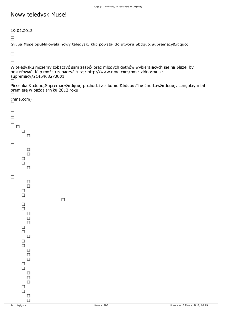 Gigs.pl - Koncerty :: Festiwale :: Imprezy Nowy teledysk Muse! 19.02.2013 Grupa Muse opublikowała nowy teledysk. Klip powstał do utworu „Supremacy”. . W teledysku możemy zobaczyć sam zespół oraz młodych gothów wybierających się na plażę, by posurfować. Klip można zobaczyć tutaj: http://www.nme.com/nme-video/muse--supremacy/2145463273001 Piosenka „Supremacy” pochodzi z albumu „The 2nd Law”. Longplay miał premierę w październiku 2012 roku. (nme.com) http://gigs.pl Kreator PDF Utworzono 3 March, 2017, 16:19 Gigs.pl - Koncerty :: Festiwale :: Imprezy http://gigs.pl Kreator PDF Utworzono 3 March, 2017, 16:19