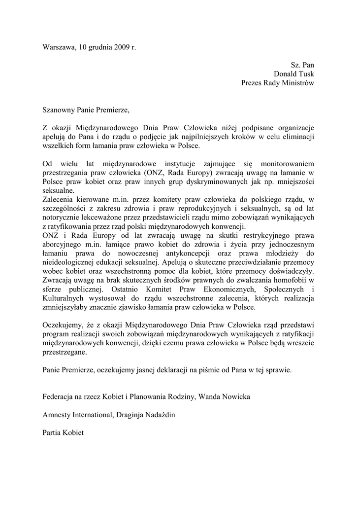 Warszawa, 10 grudnia 2009 r. Sz. Pan Donald Tusk Prezes Rady Ministrów Szanowny Panie Premierze, Z okazji Międzynarodowego Dnia Praw Człowieka niżej podpisane organizacje apelują do Pana i do rządu o podjęcie jak najpilniejszych kroków w celu eliminacji wszelkich form łamania praw człowieka w Polsce. Od wielu lat międzynarodowe instytucje zajmujące się monitorowaniem przestrzegania praw człowieka (ONZ, Rada Europy) zwracają uwagę na łamanie w Polsce praw kobiet oraz praw innych grup dyskryminowanych jak np. mniejszości seksualne. Zalecenia kierowane m.in. przez komitety praw człowieka do polskiego rządu, w szczególności z zakresu zdrowia i praw reprodukcyjnych i seksualnych, są od lat notorycznie lekceważone przez przedstawicieli rządu mimo zobowiązań wynikających z ratyfikowania przez rząd polski międzynarodowych konwencji. ONZ i Rada Europy od lat zwracają uwagę na skutki restrykcyjnego prawa aborcyjnego m.in. łamiące prawo kobiet do zdrowia i życia przy jednoczesnym łamaniu prawa do nowoczesnej antykoncepcji oraz prawa młodzieży do nieideologicznej edukacji seksualnej. Apelują o skuteczne przeciwdziałanie przemocy wobec kobiet oraz wszechstronną pomoc dla kobiet, które przemocy doświadczyły. Zwracają uwagę na brak skutecznych środków prawnych do zwalczania homofobii w sferze publicznej. Ostatnio Komitet Praw Ekonomicznych, Społecznych i Kulturalnych wystosował do rządu wszechstronne zalecenia, których realizacja zmniejszyłaby znacznie zjawisko łamania praw człowieka w Polsce. Oczekujemy, że z okazji Międzynarodowego Dnia Praw Człowieka rząd przedstawi program realizacji swoich zobowiązań międzynarodowych wynikających z ratyfikacji międzynarodowych konwencji, dzięki czemu prawa człowieka w Polsce będą wreszcie przestrzegane. Panie Premierze, oczekujemy jasnej deklaracji na piśmie od Pana w tej sprawie. Federacja na rzecz Kobiet i Planowania Rodziny, Wanda Nowicka Amnesty International, Draginja Nadażdin Partia Kobiet Towarzystwa Interwencji Kryzysowej, Anna Lipowska Teutsch LożaKobiet 2006, Anna Wiatr Koalicja Karat Zieloni 2004, Dariusz Szwed, Agnieszka Grzybek Grupa Edukatorów Seksualnych „Ponton”, Aleksandra Józefowska Polskie Towarzystwo Prawa Antydyskryminacyjnego, Krzysztof Smiszek Stowarzyszenie Aktywne Kobiety (Sosnowiec), Halina Sobańska Fundacja Autonomia, Agata Teutsch Pracownia Kultury Współczesnej, Emilia Walczak, Karol Zamojski Zielony Instytut, Karol Zamojski, Emilia Walczak Fundacja Lorga Łódź Gender, Iza Desperak Stowarzyszenia Współpracy Kobiet, NEWW Polska Kobiety dla Pomorza, Ewa Gromada Trójmiejska Akcja Kobieca Demokratyczna Unia Kobiet, Lucyna Orłowska Klub w Gdańsku Aleksandra Sołtysiak Fundacja Przestrzenie Dialogu, Beata Maciejewska Stowarzyszenie Klub Kiwanis Kobieta 2000, Choszczno