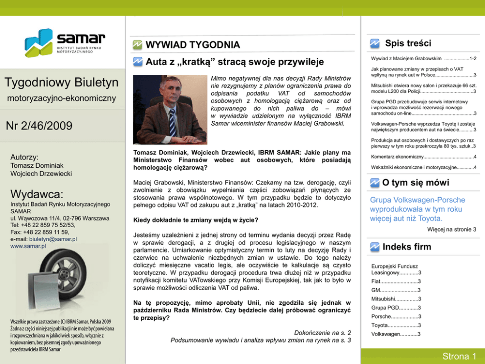 WYWIAD TYGODNIA Auta z „kratką” stracą swoje przywileje Tygodniowy Biuletyn motoryzacyjno-ekonomiczny Nr 2/46/2009 Mimo negatywnej dla nas decyzji Rady Ministrów nie rezygnujemy z planów ograniczenia prawa do odpisania podatku VAT od samochodów osobowych z homologacją ciężarową oraz od kupowanego do nich paliwa do – mówi w wywiadzie udzielonym na wyłączność IBRM Samar wiceminister finansów Maciej Grabowski. Spis treści Wywiad z Maciejem Grabowskim ...................1-2 Jak planowane zmiany w przepisach o VAT wpłłyną na rynek aut w Polsce.............................3 Mitsubishi otwiera nowy salon i przekazuje 66 szt. modelu L200 dla Policji........................................3 Grupa PGD przebudowuje serwis internetowy i wprowadza możliwość rezerwacji nowego samochodu on-line...............................................3 Volkswagen-Porsche wyprzedza Toyotę i zostaje największym producentem aut na świecie...........3 Produkcja aut osobowych i dostawyczych po raz pierwszy w tym roku przekroczyła 80 tys. sztuk..3 Autorzy: Tomasz Dominiak Wojciech Drzewiecki Wydawca: Instytut Badań Rynku Motoryzacyjnego SAMAR ul. Wąwozowa 11/4, 02-796 Warszawa Tel: +48 22 859 75 52/53, Fax: +48 22 859 11 59, e-mail: [email protected] www.samar.pl Tomasz Dominiak, Wojciech Drzewiecki, IBRM SAMAR: Jakie plany ma Ministerstwo Finansów wobec aut osobowych, które posiadają homologację ciężarową? Maciej Grabowski, Ministerstwo Finansów: Czekamy na tzw. derogację, czyli zwolnienie z obowiązku wypełniania części zobowiązań płynących ze stosowania prawa wspólnotowego. W tym przypadku będzie to dotyczyło pełnego odpisu VAT od zakupu aut z „kratką” na latach 2010-2012. Kiedy dokładnie te zmiany wejdą w życie? Jesteśmy uzależnieni z jednej strony od terminu wydania decyzji przez Radę w sprawie derogacji, a z drugiej od procesu legislacyjnego w naszym parlamencie. Umiarkowanie optymistyczny termin to luty na decyzję Rady i czerwiec na uchwalenie niezbędnych zmian w ustawie. Do tego należy doliczyć miesięczne vacatio legis, ale oczywiście te kalkulacje są czysto teoretyczne. W przypadku derogacji procedura trwa dłużej niż w przypadku notyfikacji komitetu VATowskiego przy Komisji Europejskiej, tak jak to było w sprawie możliwości odliczenia VAT od paliwa. Na tę propozycję, mimo aprobaty Unii, nie zgodziła się jednak w październiku Rada Ministrów. Czy będziecie dalej próbować ograniczyć te przepisy? Komentarz ekonomiczny......................................4 Wskaźniki ekonomiczne i motoryzacyjne.............4 O tym się mówi Grupa Volkswagen-Porsche wyprodukowała w tym roku więcej aut niż Toyota. Więcej na stronie 3 Indeks firm Europejski Fundusz Leasingowy.............3 Fiat..........................3 GM..........................3 Mitsubishi................3 Grupa PGD.............3 Porsche...................3 Toyota.....................3 Dokończenie na s. 2 Podsumowanie wywiadu i analiza wpływu zmian na rynek na s. 3 Volkswagen............3 Strona 1 Wywiad tygodnia Tak, bo auta z kratką i związane z nimi preferencje podatkowe traktujemy razem. Przygotowujemy nowe przepisy w tej sprawie i jednym z pomysłów jest, aby ograniczyć możliwość odliczania pełnego VAT-u od paliwa dla samochodów z „kratką” oraz samochodów osobowych. Mamy nadzieję, że nasze propozycje znajdą aprobatę rządu. ustawy w Sejmie, lipiec to realny moment wejścia nowych przepisów w życie. Oczywiście dużo zależy tu od czynników będących poza bezpośrednią kontrolą Ministerstwa Finansów. Teoretycznie możliwe jest również, że na derogację nie wyrazi zgody UE, chociaż naszym zdaniem to scenariusz mało prawdopodobny. Co z autami osobowymi z homologacją ciężarową, które będą w leasingu w momencie, gdy zmienią się przepisy? Ministerstwo Finansów pierwotnie chciało wprowadzić przepisy w sprawie paliwa już od stycznia przyszłego roku. Jaki teraz będzie termin wprowadzenia tych zmian? W przypadku leasingu utrzymane zostaną dotychczasowe przepisy na cały czas trwania takiej umowy, a więc prawa nabyte do odliczenia VAT-u od zakupionego pojazdu zostanie zachowane. Rzeczywiście planowaliśmy wprowadzenie tego ograniczenia od stycznia przyszłego roku, jednak nie uzyskaliśmy na to zgody Rady Ministrów. Ponownie wystąpimy o taką zgodę, ale w odniesieniu do całościowych zmian w tym zakresie. Dlatego będziemy proponowali, aby ograniczenie uprawnienia do odliczania podatku VAT od paliwa zostało wprowadzone w tym samym momencie, co ograniczenie dotyczące zakupu samochodów osobowych z homologacją ciężarową. W ten sposób zrównamy w prawach „kratki” z samochodami osobowymi kupowanymi przez podatników VAT-u. To oznacza, że ograniczenia w odliczaniu podatku na określonym procentowo i kwotowo poziomie pozostaną. Obecny limit odliczeń VATu zawartego w cenie samochodu służbowego wynosi 60 proc., ale nie więcej niż 6 tys. zł. Jak już wspomniałem, będziemy proponować również limit procentowy w odliczaniu VAT dotyczący zakupionego paliwa. Część przedsiębiorców kupiła „kratki” za gotówkę. Czy będą jakieś konsekwencje, jeśli będą je chcieli przywrócić od stanu „osobowego”? Po wprowadzeniu zapowiadanych zmian te auta przy ograniczonej funkcjonalności, nie będą miały żadnych przywilejów. Kiedy więc ostatecznie „kratki” stracą swoje przywileje? Biorąc pod uwagę wymagane procedury, w tym kwestie związane z uzyskaniem derogacji, aprobaty Rady Ministrów i przejścia przez proces uchwalenia Z punktu widzenia prawa podatkowego demontaż kratki nie będzie rodzić żadnych konsekwencji w VAT. Co innego przepisy o dopuszczeniu pojazdów. Wydaje mi się, że powrót do pierwotnego stanu, czyli sprzed konwersji na ciężarówkę, będzie możliwy. Te informacje należałoby jednak potwierdzić w Ministerstwie Infrastruktury. Po co w ogóle ograniczać prawo do odpisu