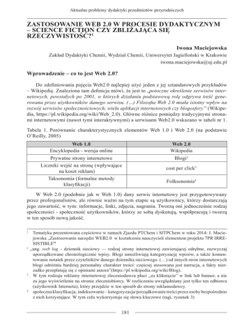 Aktualne problemy dydaktyki przedmiotów przyrodniczych ZASTOSOWANIE WEB 2.0 W PROCESIE DYDAKTYCZNYM – SCIENCE FICTION CZY ZBLIŻAJĄCA SIĘ RZECZYWISTOŚĆ?1 Iwona Maciejowska Zakład Dydaktyki Chemii, Wydział Chemii, Uniwersytet Jagielloński w Krakowie [email protected] Wprowadzenie – co to jest Web 2.0? Do zdefiniowania pojęcia Web2.0 najlepiej użyć jeden z jej sztandarowych przykładów – Wikipedię. Znaleziona tam definicja mówi, że jest to „potoczne określenie serwisów internetowych, powstałych po 2001, w których działaniu podstawową rolę odgrywa treść generowana przez użytkowników danego serwisu. (…) Filozofia Web 2.0 miała istotny wpływ na rozwój serwisów społecznościowych, wielu aplikacji internetowych czy blogosfery.” (Wikipedia, https://pl.wikipedia.org/wiki/Web_2.0). Główne różnice pomiędzy tradycyjnymi stronami internetowymi (nawet tymi interaktywnymi) a serwisami Web2.0 wskazano w tabeli nr 1. Tabela 1. Porównanie charakterystycznych elementów Web 1.0 i Web 2.0 (na podstawie O’Reilly, 2005) Web 1.0 Encyklopedia - wersja online Prywatne strony internetowe Liczniki wejść na stronę (wpływające na koszt reklam) Taksonomia (formalne metody klasyfikacji) Web 2.0 Wikipedia Blogi2 cost per click3 Folksonomia4 W Web 2.0 (podobnie jak w Web 1.0) dany serwis internetowy jest przygotowywany przez profesjonalistów, ale równie ważni na tym etapie są użytkownicy, którzy dostarczają jego zawartość, w tym: informacje, linki, zdjęcia, nagrania. Tworzą oni jednocześnie rodzaj społeczności - społeczność użytkowników, którzy ze sobą dyskutują, współpracują i tworzą w ten sposób nową jakość. Tematyka prezentowana częściowo w ramach Zjazdu PTChem i SITPChem w roku 2014: I. Maciejowska „Zastosowanie narzędzi WEB2.0 w kształceniu nauczycieli elementem projektu 7PR IRRESISTIBLE” 2 „ang. web log – dziennik sieciowy — rodzaj strony internetowej zawierającej odrębne, zazwyczaj uporządkowane chronologicznie wpisy. Blogi umożliwiają kategoryzację wpisów, a także komentowanie notatek przez czytelników danego dziennika sieciowego. (…) od innych stron internetowych blogi odróżnia bardziej personalny charakter treści: częściej stosowana jest narracja, a fakty nierzadko przeplatają się z opiniami autora”(https://pl.wikipedia.org/wiki/Blog). 3 W tym rodzaju reklamy internetowej zleceniodawca płaci „za kliknięcie” w link lub banner, a nie za jego wyświetlenie na stronie zleceniobiorcy. W rozliczeniu uwzględniany jest tylko ten odbiorca (użytkownik Internetu), który przejdzie w ten sposób do strony reklamodawcy. 4 społeczna klasyfikacja, indeksowanie – kategoryzacja/porządkowanie treści przez osoby bezpośrednio z nich korzystające. W tym celu wykorzystuje się słowa kluczowe (tagi, rysunek 3) 1 181 Zastosowanie WEB 2.0 w procesie dydaktycznym – science fiction czy zbliżająca się rzeczywistość? Jednymi z bardziej znanych serwisów Web 2.0 są na przykład: Booking.com czy TripAdvisor, które – pozwalają na wymianę doświadczeń i informacji wśród podróżników i globtroterów, pomagają zaplanować wyjazd, zweryfikować informacje promocyjne kurortów i atrakcji turystycznych. Dostępne w kilkudziesięciu językach (np. Booking.com – w ponad czterdziestu), dysponują ogromną bazą danych (dziesiątki a nawet setki milionów opisów). Aby zachować wiarygodność, recenzje miejsc noclegowych na portalu Booking.com mogą zamieszczać wyłącznie osoby, który z niego skorzystały przy ich rezerwacji. Natomiast w TripAdvisor redakcja zastrzega sobie kilka dni na weryfikację postu – poprzez sprawdzenie IP i adresu e-mailowego nadawcy, użytego słownictwo (brak wulgaryzmów) itd. Wykształcenie się idei Web 2.0 z pasywnych stron internetowych można porównać do przejścia w edukacji od tradycyjnego nauczania skoncentrowanego na nauczycielu (ang. teacher centered approach), w którym podstawą była transmisja gotowej wiedzy od nauczyciela do uczniów - do współczesnego nauczania-uczenia się zorientowanego na ucznia i podkreślającego jego aktywną rolę w tym procesie (ang. student centered approach). Przykładowo, powstały w 2000 roku TripAdvisor rozpoczął działalność od publikowania opisów i recenzji na podstawie ogólnodostępnych przewodników i informacji prasowych, ale wkrótce niewielka opcja „możesz dodać swoją własną opinię” zajęła główne miejsce w serwisie. Innego rodzajem serwisem, tworzonym przez użytkowników, jest YouTube zawierający głównie pliki wideo – choć stworzony głównie do rozrywki, zawiera obecnie wiele treści, takich jak: sfilmowane eksperymenty chemiczne, wykłady, prezentacje. Tego typu materiały łatwo mogą znaleźć zastosowanie dydaktyczne, zarówno jako źródło wiedzy, jak i prowokacji w formie pytania „Czy to mogło się tak zdarzyć? Czy przedstawiona informacja/sytuacja jest poprawna?” (rysunek 1). Rysunek 1. Przykład prezentacji eksperymentu chemicznego dostępnego w serwisie YouTube (https://www.youtube.com/watch?v=qcbKLhpvZZE) Jeden z najbardziej znanych serwisów jest Facebook (podobnie: tweeter, instagram, flicker, czy polski „wykop”). Ich zadaniem jest tworzenie społeczności internetowych - daje możliwość budowania sieci kontaktów poprzez tworzenie listy znajomych i zapraszanie nowych, wysyłania wiadomości do innych użytkowników oraz wymieniania się informacjami w obrębie grup dyskusyjnych. Facebook doczekał się już wielu badań na swój temat. Na przykład, Anna Krasińska w swojej pracy magisterskiej, wykonanej w Szkole Wyższej Psychologii Społecznej w Warszawie, wykazała, że „Największą aktywnością na Facebooku charakteryzują się osoby energiczne i otwarte na innych. Żadna z cech osobowości nie ma natomiast związku z liczbą wejść na ten portal” (Doniesienia ze świata nauki. Kto jest 182 Aktualne problemy dydaktyki przedmiotów przyrodniczyc