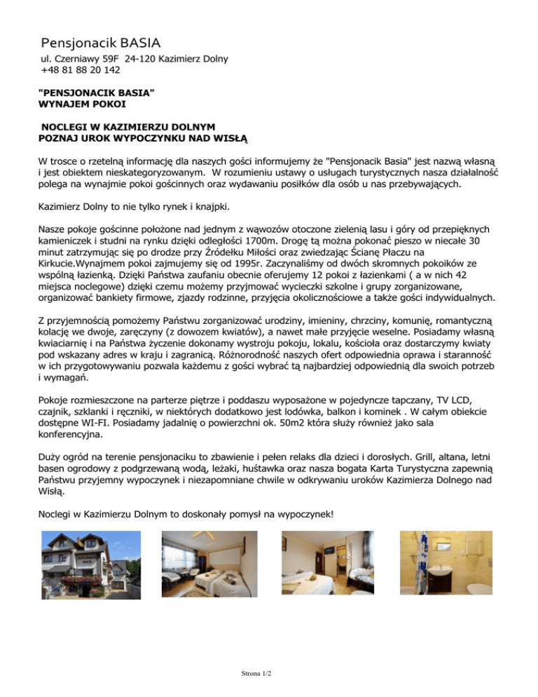 Pensjonacik BASIA ul. Czerniawy 59F 24-120 Kazimierz Dolny +48 81 88 20 142 "PENSJONACIK BASIA" WYNAJEM POKOI NOCLEGI W KAZIMIERZU DOLNYM POZNAJ UROK WYPOCZYNKU NAD WISŁĄ W trosce o rzetelną informację dla naszych gości informujemy że "Pensjonacik Basia" jest nazwą własną i jest obiektem nieskategoryzowanym. W rozumieniu ustawy o usługach turystycznych nasza działalność polega na wynajmie pokoi gościnnych oraz wydawaniu posiłków dla osób u nas przebywających. Kazimierz Dolny to nie tylko rynek i knajpki. Nasze pokoje gościnne położone nad jednym z wąwozów otoczone zielenią lasu i góry od przepięknych kamieniczek i studni na rynku dzięki odległości 1700m. Drogę tą można pokonać pieszo w niecałe 30 minut zatrzymując się po drodze przy Źródełku Miłości oraz zwiedzając Ścianę Płaczu na Kirkucie.Wynajmem pokoi zajmujemy się od 1995r. Zaczynaliśmy od dwóch skromnych pokoików ze wspólną łazienką. Dzięki Państwa zaufaniu obecnie oferujemy 12 pokoi z łazienkami ( a w nich 42 miejsca noclegowe) dzięki czemu możemy przyjmować wycieczki szkolne i grupy zorganizowane, organizować bankiety firmowe, zjazdy rodzinne, przyjęcia okolicznościowe a także gości indywidualnych. Z przyjemnością pomożemy Państwu zorganizować urodziny, imieniny, chrzciny, komunię, romantyczną kolację we dwoje, zaręczyny (z dowozem kwiatów), a nawet małe przyjęcie weselne. Posiadamy własną kwiaciarnię i na Państwa życzenie dokonamy wystroju pokoju, lokalu, kościoła oraz dostarczymy kwiaty pod wskazany adres w kraju i zagranicą. Różnorodność naszych ofert odpowiednia oprawa i staranność w ich przygotowywaniu pozwala każdemu z gości wybrać tą najbardziej odpowiednią dla swoich potrzeb i wymagań. Pokoje rozmieszczone na parterze piętrze i poddaszu wyposażone w pojedyncze tapczany, TV LCD, czajnik, szklanki i ręczniki, w niektórych dodatkowo jest lodówka, balkon i kominek . W całym obiekcie dostępne WI-FI. Posiadamy jadalnię o powierzchni ok. 50m2 która służy również jako sala konferencyjna. Duży ogród na terenie pensjonaciku to zbawienie i pełen relaks dla dzieci i dorosłych. Grill, altana, letni basen ogrodowy z podgrzewaną wodą, leżaki, huśtawka oraz nasza bogata Karta Turystyczna zapewnią Państwu przyjemny wypoczynek i niezapomniane chwile w odkrywaniu uroków Kazimierza Dolnego nad Wisłą. Noclegi w Kazimierzu Dolnym to doskonały pomysł na wypoczynek! Strona 1/2 Strona 2/2 Powered by TCPDF (www.tcpdf.org)