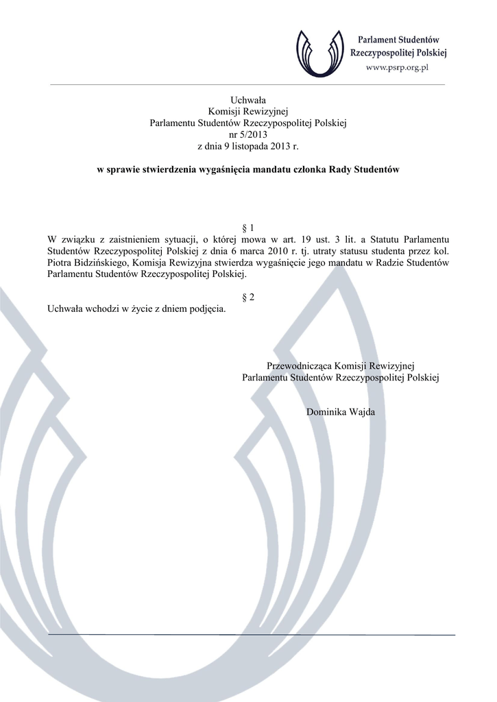 Uchwała Komisji Rewizyjnej Parlamentu Studentów Rzeczypospolitej Polskiej nr 5/2013 z dnia 9 listopada 2013 r. w sprawie stwierdzenia wygaśnięcia mandatu członka Rady Studentów §1 W związku z zaistnieniem sytuacji, o której mowa w art. 19 ust. 3 lit. a Statutu Parlamentu Studentów Rzeczypospolitej Polskiej z dnia 6 marca 2010 r. tj. utraty statusu studenta przez kol. Piotra Bidzińskiego, Komisja Rewizyjna stwierdza wygaśnięcie jego mandatu w Radzie Studentów Parlamentu Studentów Rzeczypospolitej Polskiej. §2 Uchwała wchodzi w życie z dniem podjęcia. Przewodnicząca Komisji Rewizyjnej Parlamentu Studentów Rzeczypospolitej Polskiej Dominika Wajda