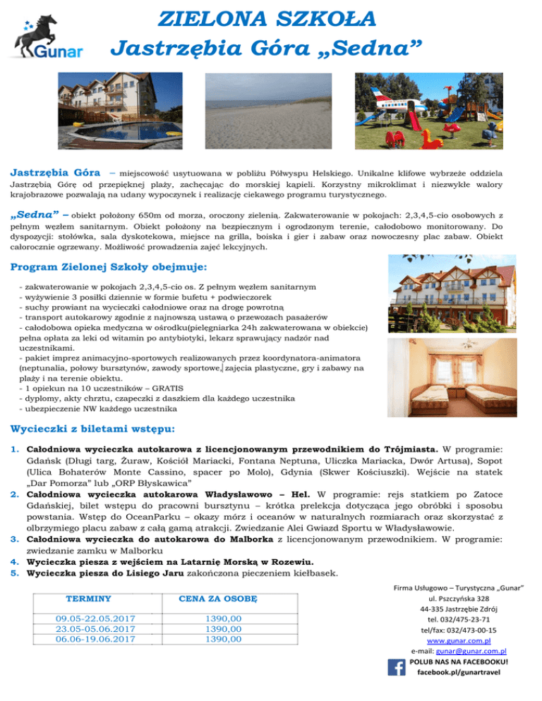 ZIELONA SZKOŁA Jastrzębia Góra „Sedna” Jastrzębia Góra – miejscowość usytuowana w pobliżu Półwyspu Helskiego. Unikalne klifowe wybrzeże oddziela Jastrzębią Górę od przepięknej plaży, zachęcając do morskiej kąpieli. Korzystny mikroklimat i niezwykłe walory krajobrazowe pozwalają na udany wypoczynek i realizację ciekawego programu turystycznego. „Sedna” – obiekt położony 650m od morza, oroczony zielenią. Zakwaterowanie w pokojach: 2,3,4,5-cio osobowych z pełnym węzłem sanitarnym. Obiekt położony na bezpiecznym i ogrodzonym terenie, całodobowo monitorowany. Do dyspozycji: stołówka, sala dyskotekowa, miejsce na grilla, boiska i gier i zabaw oraz nowoczesny plac zabaw. Obiekt całorocznie ogrzewany. Możliwość prowadzenia zajęć lekcyjnych. Program Zielonej Szkoły obejmuje: - zakwaterowanie w pokojach 2,3,4,5-cio os. Z pełnym węzłem sanitarnym - wyżywienie 3 posiłki dziennie w formie bufetu + podwieczorek - suchy prowiant na wycieczki całodniowe oraz na drogę powrotną - transport autokarowy zgodnie z najnowszą ustawą o przewozach pasażerów - całodobowa opieka medyczna w ośrodku(pielęgniarka 24h zakwaterowana w obiekcie) pełna opłata za leki od witamin po antybiotyki, lekarz sprawujący nadzór nad uczestnikami. - pakiet imprez animacyjno-sportowych realizowanych przez koordynatora-animatora (neptunalia, połowy bursztynów, zawody sportowe, zajęcia plastyczne, gry i zabawy na plaży i na terenie obiektu. - 1 opiekun na 10 uczestników – GRATIS - dyplomy, akty chrztu, czapeczki z daszkiem dla każdego uczestnika - ubezpieczenie NW każdego uczestnika Wycieczki z biletami wstępu: 1. Całodniowa wycieczka autokarowa z licencjonowanym przewodnikiem do Trójmiasta. W programie: Gdańsk (Długi targ, Żuraw, Kościół Mariacki, Fontana Neptuna, Uliczka Mariacka, Dwór Artusa), Sopot (Ulica Bohaterów Monte Cassino, spacer po Molo), Gdynia (Skwer Kościuszki). Wejście na statek „Dar Pomorza” lub „ORP Błyskawica” 2. Całodniowa wycieczka autokarowa Władysławowo – Hel. W programie: rejs statkiem po Zatoce Gdańskiej, bilet wstępu do pracowni bursztynu – krótka prelekcja dotycząca jego obróbki i sposobu powstania. Wstęp do OceanParku – okazy mórz i oceanów w naturalnych rozmiarach oraz skorzystać z olbrzymiego placu zabaw z całą gamą atrakcji. Zwiedzanie Alei Gwiazd Sportu w Władysławowie. 3. Całodniowa wycieczka do autokarowa do Malborka z licencjonowanym przewodnikiem. W programie: zwiedzanie zamku w Malborku 4. Wycieczka piesza z wejściem na Latarnię Morską w Rozewiu. 5. Wycieczka piesza do Lisiego Jaru zakończona pieczeniem kiełbasek. TERMINY 09.05-22.05.2017 23.05-05.06.2017 06.06-19.06.2017 CENA ZA OSOBĘ 1390,00 1390,00 1390,00 Firma Usługowo – Turystyczna „Gunar” ul. Pszczyńska 328 44-335 Jastrzębie Zdrój tel. 032/475-23-71 tel/fax: 032/473-00-15 www.gunar.com.pl e-mail: [email protected] POLUB NAS NA FACEBOOKU! facebook.pl/gunartravel