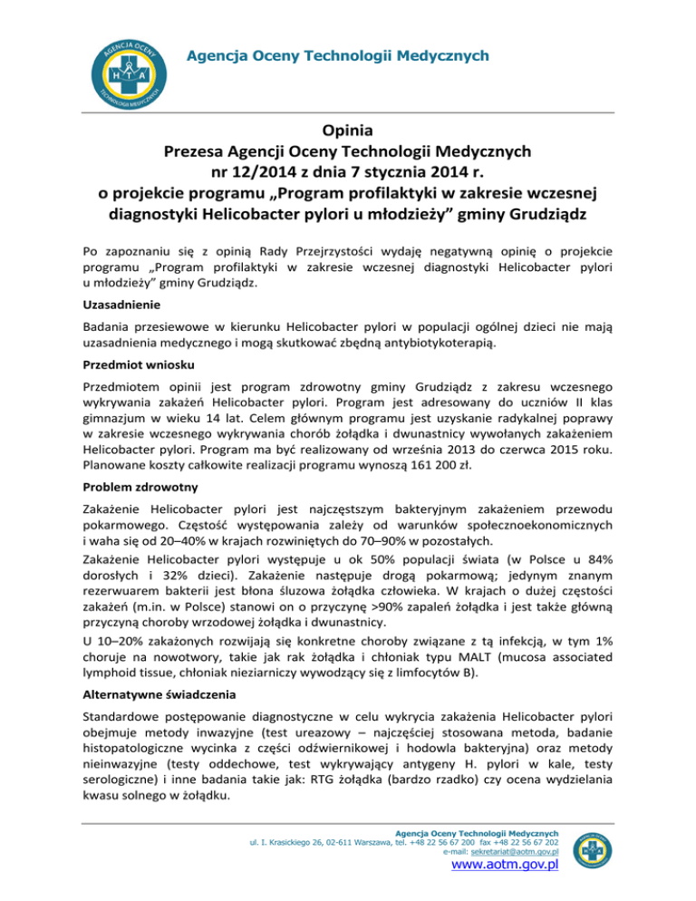 Agencja Oceny Technologii Medycznych Opinia Prezesa Agencji Oceny Technologii Medycznych nr 12/2014 z dnia 7 stycznia 2014 r. o projekcie programu „Program profilaktyki w zakresie wczesnej diagnostyki Helicobacter pylori u młodzieży” gminy Grudziądz Po zapoznaniu się z opinią Rady Przejrzystości wydaję negatywną opinię o projekcie programu „Program profilaktyki w zakresie wczesnej diagnostyki Helicobacter pylori u młodzieży” gminy Grudziądz. Uzasadnienie Badania przesiewowe w kierunku Helicobacter pylori w populacji ogólnej dzieci nie mają uzasadnienia medycznego i mogą skutkować zbędną antybiotykoterapią. Przedmiot wniosku Przedmiotem opinii jest program zdrowotny gminy Grudziądz z zakresu wczesnego wykrywania zakażeń Helicobacter pylori. Program jest adresowany do uczniów II klas gimnazjum w wieku 14 lat. Celem głównym programu jest uzyskanie radykalnej poprawy w zakresie wczesnego wykrywania chorób żołądka i dwunastnicy wywołanych zakażeniem Helicobacter pylori. Program ma być realizowany od września 2013 do czerwca 2015 roku. Planowane koszty całkowite realizacji programu wynoszą 161 200 zł. Problem zdrowotny Zakażenie Helicobacter pylori jest najczęstszym bakteryjnym zakażeniem przewodu pokarmowego. Częstość występowania zależy od warunków społecznoekonomicznych i waha się od 20–40% w krajach rozwiniętych do 70–90% w pozostałych. Zakażenie Helicobacter pylori występuje u ok 50% populacji świata (w Polsce u 84% dorosłych i 32% dzieci). Zakażenie następuje drogą pokarmową; jedynym znanym rezerwuarem bakterii jest błona śluzowa żołądka człowieka. W krajach o dużej częstości zakażeń (m.in. w Polsce) stanowi on o przyczynę >90% zapaleń żołądka i jest także główną przyczyną choroby wrzodowej żołądka i dwunastnicy. U 10–20% zakażonych rozwijają się konkretne choroby związane z tą infekcją, w tym 1% choruje na nowotwory, takie jak rak żołądka i chłoniak typu MALT (mucosa associated lymphoid tissue, chłoniak nieziarniczy wywodzący się z limfocytów B). Alternatywne świadczenia Standardowe postępowanie diagnostyczne w celu wykrycia zakażenia Helicobacter pylori obejmuje metody inwazyjne (test ureazowy – najczęściej stosowana metoda, badanie histopatologiczne wycinka z części odźwiernikowej i hodowla bakteryjna) oraz metody nieinwazyjne (testy oddechowe, test wykrywający antygeny H. pylori w kale, testy serologiczne) i inne badania takie jak: RTG żołądka (bardzo rzadko) czy ocena wydzielania kwasu solnego w żołądku. Agencja Oceny Technologii Medycznych ul. I. Krasickiego 26, 02-611 Warszawa, tel. +48 22 56 67 200 fax +48 22 56 67 202 e-mail: [email protected] www.aotm.gov.pl Opinia Prezesa AOTM nr 12/2014 z dnia 7 stycznia 2014 r. Zgodnie z opinią eksperta test oddechowy z mocznikiem znakowanym izotopem 13C węgla w celu wykrycia zakażenia Helicobacter pylori jest stosowaną metodą diagnostyczną tylko w niektórych i nielicznych jednostkach gastroenterologicznych, które są mało dostępne dla ogółu populacji. Nie jest on rozliczany jako oddzielna procedura medyczna przez system opieki zdrowotnej obowiązujący w Polsce. Wnioski z oceny przeprowadzonej przez Agencję Podsumowanie wytycznych i rekomendacji: − Zgodnie z ustaleniami Grupy Roboczej PTG-E dotyczące postępowania w zakażeniu Helicobacter pylori, które są rekomendowane przez Polskie Towarzystwo Gastroenterologii zalecanymi testami do diagnostyki zakażenia H. pylori są: w przypadkach, gdy planowane jest badanie endoskopowe – pobranie wycinka błony śluzowej (szybki test ureazowy i/lub badanie histopatologiczne), u innych pacjentów przy pomocy jednego z testów nieinwazyjnych (ilościowa ocena miana przeciwciał antyH. pylori w klasie IgG, test oddechowy 13C, oznaczenie antygenu H. pylori w kale). − Do oceny skuteczności eradykacji H. pylori preferowany jest test oddechowy o dużej czułości i swoistości. Alternatywą jest ocena obecności antygenu H. pylori w stolcu z użyciem przeciwciał monoklonalnych (mniejsza czułość w porównaniu do testu oddechowego). − ESPGHAN w swoich wytycznych dotyczących zakażenia Helicobacter pylori u dzieci podkreśla, że 13C UBT stanowi wiarygodną nieinwazyjną metodę oceny skuteczności eradykacji zakażenia H. pylori. − Test na obecność antygenu Helicobacter pylori w kale (czułość 94%, swoistość 92%) jest porównywalnie skuteczny z oddechowym testem urazowym (czułość 88-95%, swoistość 95-100%), z kolei spośród testów serologicznych, powinny być stosowane walidowane testy w kierunku IgG. − Testy wykrywające zakażenie H. pylori (biopsja, test ureazowy, 13C UBT, HpSA) powinno się wykonywać co najmniej 4 tygodnie po zakończeniu antybiotykoterapii. − Przed wykonywaniem większości testów diagnostycznych (oddechowy test urazowy, oznaczanie antygenu w kale itd.) należy przerwać leczenie inhibitorami pompy protonowej przynajmniej na 2 tygodnie przed badaniem z uwagi na zwiększony odsetek wyników fałszywie ujemnych. Jeżeli nie jest to możliwe, należy zastosować testy z IgG. − Według Europejskiego Towarzystwa Gastroentorologicznego badanie endoskopowe z biopsją (metoda histologiczna i szybki test ureazowy), test oddechowy ze znakowanym mocznikiem oraz oznaczanie antygenu w kale mają bardzo wiarygodne zastosowanie dla diagnozowania zakażenia H. pylori i dla potwierdzenia skuteczności eradykacji. − Zgodnie z wytycznymi American College of Gastroenterology wybór badania diagnostycznego zależy od aktualnej sytuacji klinicznej, a zwłaszcza od ewentualnego wykonania badania endoskopowego. W populacjach o małym prawdopodobieństwie zakażenia H. pylori zaleca się stosowanie metod nieendoskopowych, takich jak ureazowy test oddechowy i test antygenowy w kale, cechujących się większą dodatnią wartością predykcyjną niż testy serologiczne. − Najlepszym niewymagającym endoskopii testem potwierdzającym za