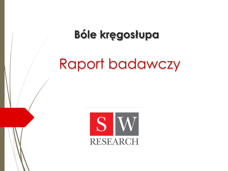 Bóle kręgosłupa Raport badawczy Choroby kręgosłupa – raport badawczy Spis treści Slajdy Metodologia badania 3 Podsumowanie wyników 4-5 Szczegółowe wyniki badania 6-19 Struktura demograficzna 20-23 Kontakt 24 Choroby kręgosłupa – raport badawczy Metodologia badania Badanie zostało zrealizowane w dniach 17.12-23.12.2015 przez agencję SW RESEARCH metodą wywiadów on-line (CAWI) na panelu internetowych SW Panel. Próba badawcza ma charakter losowy i jest reprezentatywna względem kluczowych zmiennych demograficznych. Łącznie zebrano 1011 wywiadów. Kwestionariusz badawczy został przygotowany przez agencję SW RESEARCH na podstawie zagadnień dostarczonych przez agencję PR Compress. Choroby kręgosłupa Podsumowanie wyników (1/2) Bóle pleców dotyczą częściej badanych z najstarszych grup wiekowych oraz częściej kobiety niż mężczyzn. 45% ankietowanych odczuwa ból pleców od maksymalnie 5 lat, a 29% boryka się z tym problemem dłużej. Najczęściej bóle pleców towarzyszą badanym parę razy w tygodniu (35%) lub w miesiącu (29%), a w 26% przypadków nawet codziennie. Częstotliwość odczuwania bólów pleców zwiększa się wraz z wiekiem – w grupie powyżej 60 roku życia codziennie odczuwa je ponad 40% badanych. Również wśród kobiet widać większy odsetek skarżących się na bóle pleców każdego dnia. Nasilenie bólu u ankietowanych zazwyczaj ma związek z wysiłkiem fizycznym (dźwiganiem ciężkich przedmiotów, aktywnością fizyczną), ale również statycznym trybem pracy, czy też jest wynikiem stresu. Wśród przyczyn odczuwania bólu w okolicach kręgosłupa respondenci wymieniali również schorzenia i zwyrodnienia kręgosłupa oraz nieprawidłową postawę. Wedle ankietowanych ból pleców ustępuje najczęściej po krótszym lub dłuższym odpoczynku. Choroby kręgosłupa Podsumowanie wyników (2/2) Większość badanych odczuwających ból pleców zgłosiło się z tym do lekarza. Częściej robiło to kobiety, niż mężczyźni, a wraz ze wzrostem wieku zwiększał się odsetek takich osób (w grupie powyżej 60 lat taką konsultację z lekarzem zadeklarowało ponad 80% ankietowanych). Dla ponad połowy respondentów powodem wizyty u lekarza był przewlekły ból w plecach, ale prawie 40% badanych zgłosiło się, gdy odczuwało już problemy z poruszaniem się, a w co trzecim przypadku - gdy doszło do nagłego, ostrego bólu w plecach lub drętwienia kończyn. Dla większości badanych ból pleców wpływa negatywnie na ich jakość życia – obniża samopoczucie, powoduje ograniczenie aktywności fizycznej i problemy ze snem. Jedynie 10% ankietowanych odpowiedziało, że nie wpływa to w żaden szczególny sposób na ich życie. Szczegółowe wyniki badania Choroby kręgosłupa – raport badawczy Bóle pleców 93% badanych odczuwa bóle pleców. Czy odczuwasz bóle pleców? 7,3 TAK 92,7 TAK Dane w % N=1011 NIE Choroby kręgosłupa – raport badawczy Bóle pleców wg demografii Im starsza grupa wiekowa tym częstsze są w niej bóle pleców, różnice jednak pomiędzy grupami są bardzo niewielkie. Odczuwanie bólów pleców wśród grup demograficznych: TOTAL 92,7 kobieta 93,1 mężczyzna 92,4 do 24 lat 89,1 25-34 lat 89,9 35-44 lat 95,3 45-59 lat 94,9 60+ lat 93,3 Możliwość wyboru wielu odpowiedzi Dane w % N=1011 Choroby kręgosłupa – raport badawczy Okres odczuwania bóli w plecach 17% osób, które mają bóle pleców odczuwa ból od 1-2 lat, najwięcej – ponad ¼ badanych odczuwa ból od 3-5 lat, ponad 13% ma bóle już przeszło od dekady. Od ilu lat odczuwasz bóle pleców? 17,4 26,5 27,4 13,1 15,7 od 1-2 lat od 3-5 lat od 6-10 lat Pytanie skierowane do badanych, którzy odczuwają ból pleców Dane w % N=937 powyżej 10 lat nie pamiętam Choroby kręgosłupa – raport badawczy Częstotliwość odczuwania bóli w plecach Co czwarty badany odczuwa bóle pleców każdego dnia. Co trzeci raz, parę razy w tygodniu, 29% respondentów bolą plecy raz, parę razy w miesiącu. Jak często odczuwasz bóle pleców? 6,5 0,6 0,4 3,4 26,0 28,5 34,7 Każdego dnia Raz, parę razy w tygodniu Raz, parę razy w miesiącu Raz, parę razy na pół roku Raz, parę razy na rok Rzadziej niż raz w roku Nie wiem, trudno powiedzieć Pytanie skierowane do badanych, którzy odczuwają ból pleców Dane w % N=937 Choroby kręgosłupa – raport badawczy Częstotliwość bólu pleców a demografia Widać sporą różnicę w częstotliwości odczuwania bólów pleców wśród różnych grup wiekowych. Im starsza osoba, tym częściej odczuwa takie bóle. Kobiety także częściej niż mężczyźni cierpią na codzienne bóle pleców. Jak często odczuwasz bóle pleców? TOTAL 24,1 Kobieta 26,3 Mężczyzna do 24 lat 25-34 lat 35-44 lat 45-59 lat 32,1 32,5 21,5 32,0 8,0 60+ lat Każdego dnia Raz, parę razy na pół roku Nie wiem, trudno powiedzieć 5,7 2,0 0,7 9,5 30,4 43,5 9,4 30,8 25,7 Raz, parę razy w tygodniu Raz, parę razy na rok 6,6 7,1 2,5 0,5 31,8 Pytanie skierowane do badanych, którzy odczuwają ból pleców Dane w % N=937 6,4 4,20,2 27,8 32,4 26,1 23,2 26,3 38,4 18,8 0,3 6,0 3,2 30,2 38,7 13,1 26,4 2,4 0,6 3,62,8 0,8 17,4 3,22,8- Raz, parę razy w miesiącu Rzadziej niż raz w roku Choroby kręgosłupa – raport badawczy Momenty, w których ból się nasila Ból pleców szczególnie nasila się u badanych podczas dźwigania ciężkich ciężarów (59,4%), po aktywności fizycznej (45,7%) oraz w trakcie siedzenia (44,6%). W jakich momentach ból się nasila? 59,4 Po dźwiganiu ciężkich rzeczy 45,7 Po aktywności fizycznej 44,6 W trakcie siedzenia 23,6 Po stresującym dniu 20,3 W trakcie leżenia 16,8 W nocy Ból jest cały czas taki sam Nie wiem, trudno powiedzieć 6,6 3,2 Możliwość wyboru wielu odpowiedzi Pytanie skierowane do badanych, którzy odczuwają ból pleców Dane w % N=937 Choroby kręgosłupa – raport badawczy Momenty, w których ból ustępuje U prawie połowy respondentów odczuwających ból pleców, ustęp