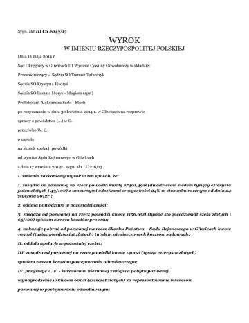 Sygn. akt III Ca 2043/13 WYROK W IMIENIU RZECZYPOSPOLITEJ POLSKIEJ Dnia 13 maja 2014 r. Sąd Okręgowy w Gliwicach III Wydział Cywilny Odwoławczy w składzie: Przewodniczący – Sędzia SO Tomasz Tatarczyk Sędzia SO Krystyna Hadryś Sędzia SO Lucyna Morys - Magiera (spr.) Protokolant Aleksandra Sado - Stach po rozpoznaniu w dniu 30 kwietnia 2014 r. w Gliwicach na rozprawie sprawy z powództwa (...) w O. przeciwko W. C. o zapłatę na skutek apelacji powódki od wyroku Sądu Rejonowego w Gliwicach z dnia 17 września 2013r., sygn. akt I C 216/13 I. zmienia zaskarżony wyrok w ten sposób, że: 1. zasądza od pozwanej na rzecz powódki kwotę 27401,49zł (dwadzieścia siedem tysięcy czterysta jeden złotych i 49/100) z umownymi odsetkami w wysokości 24% w stosunku rocznym od dnia 24 stycznia 2012r.; 2. oddala powództwo w pozostałej części; 3. zasądza od pozwanej na rzecz powódki kwotę 1156,65zł (tysiąc sto pięćdziesiąt sześć złotych i 65/100) tytułem zwrotu kosztów procesu; 4. nakazuje pobrać od pozwanej na rzecz Skarbu Państwa – Sądu Rejonowego w Gliwicach kwotę 1050zł (tysiąc pięćdziesiąt złotych) tytułem nieuiszczonych kosztów sądowych; II. oddala apelację w pozostałej części; III. zasądza od pozwanej na rzecz powódki kwotę 1400zł (tysiąc czterysta złotych) tytułem zwrotu kosztów postępowania odwoławczego; IV. przyznaje A. F. - kuratorowi nieznanej z miejsca pobytu pozwanej, wynagrodzenie w kwocie 600zł (sześćset złotych) za reprezentowanie interesów pozwanej w postępowaniu odwoławczym; IV. nakazuje pobrać od pozwanej na rzecz Skarbu Państwa – Sądu Rejonowego w Gliwicach kwotę 200zł (dwieście złotych) tytułem nieuiszczonych kosztów sądowych. SSO Lucyna Morys – Magiera SSO Tomasz TatarczykSSO Krystyna Hadryś Sygn. akt III Ca 2043/13 UZASADNIENIE Powódka (...) w O. wytoczyła w elektronicznym postępowaniu upominawczym przeciwko pozwanej W. C. powództwo o zapłatę kwoty 27.992,06 złotych wraz z umownymi odsetkami w wysokości 24 % w stosunku rocznym od dnia 24 stycznia 2012 roku do dnia zapłaty oraz kosztami procesu. W uzasadnieniu powódka podniosła, że na podstawie umowy z dnia 24 sierpnia 2010 roku udzielił pozwanej pożyczki w kwocie 23.900 zł. Pozwana zobowiązała się do zwrotu pożyczki wraz z odsetkami w 12 ratach, płatnych do dnia 24-tego każdego miesiąca, rozpoczynając od dnia 24 września 2010 roku, zgodnie z planem spłaty pożyczki. Pozwana nie spłacała rat w terminie, wobec czego w dniu 14 listopada 2011 roku powódka wypowiedziała umowę. Pomimo wezwania do zapłaty pozwana nie uregulowała zadłużenia. Nadto powódka wyjaśniła, że na kwotę dochodzoną pozwem składają się następujące sumy: 23.900 zł – niespłacona pożyczka, 1.256,15 zł – niespłacone odsetki za udzielenie pożyczki, 2.145,34 zł – odsetki za opóźnienie w spłacie, 690,57 zł – koszty windykacji, opłaty manipulacyjne za wysłane wezwania i zawiadomienia. W dniu 26 kwietnia 2012 roku Sąd Rejonowy Lublin-Zachód w Lublinie wydał w sprawie nakaz zapłaty w postępowaniu upominawczym, który postanowieniem z dnia 14 listopada 2012 roku został uchylony w całości, zaś sprawa przekazana do rozpoznania do tut. Sądu. Zarządzeniem z dnia 8 maja 2013 roku ustanowiono dla pozwanej, której miejsce pobytu nie jest znane, kuratora procesowego. W piśmie procesowym z dnia 13 czerwca 2013 roku kurator dla nieznanej z miejsca pobytu pozwanej wniósł o oddalenie powództwa w całości. Podniósł, że powódka nie wykazała roszczenia co do zasady i wysokości. Zakwestionował przedłożone przez stronę powodową dokumenty w postaci umowy pożyczki wskazując, że umowa nie zawiera podpisu pozwanej (umowa została parafowana) oraz brak jest dokumentów wykazujących umocowanie osób podpisanych na umowie w imieniu powódki do reprezentowania strony powodowej. Nadto twierdzenia, że kwota pożyczki została pozwanej wypłacona nie zostało poparte dowodami. Kurator podniósł również, że przedłożone przez powódkę dokumenty (historia operacji) stanowi niesprawdzalny wydruk z systemu finansowego, nieczytelny dla osób trzecich. Brak jest także informacji przez kogo wydruk ten został sporządzony (brak pieczątki, podpisu). Zanegował także wypowiedzenie umowy i sposobu wyliczenia zadłużenia pozwanej. W piśmie procesowym z dnia 3 września 2013 roku strona powodowa podtrzymała żądanie pozwu. Podkreśliła, ze wykazała żądanie pozwu co do zasady jak i wysokości. Zaś na stronie pozwanej ciąży obowiązek udowodnienia okoliczności uzasadniających oddalenie powództwa, czego pozwana nie uczyniła. Zaznaczyła, że osoby podpisujące umowę były do tego upoważnione, a wydruk dokonywany jest bezpośrednio z systemu i nie wymaga dla swojej ważności podpisu ani pieczęci. Zaskarżonym wyrokiem z dnia 17 września 2013 roku Sąd Rejonowy w Gliwicach oddalił powództwo. Postanowieniem z dnia 17 września 2013r. przyznano kuratorowi nieznanej z miejsca pobytu pozwanej A. F. wynagrodzenie w kwocie 800zł. Ustalił Sąd Rejonowy, iż w dniu 24 sierpnia 2010 roku W. C. zawarła ze (...) w O. umowę kredytową – renegocjowaną nr (...), zgodnie z treścią której (...) im. (...) zobowiązała się do udzielenia W. C. kredytu w kwocie 23.900 zł na warunkach określonych umową i Regulaminem udzielania kredytów i pożyczek (...) im. (...), stanowiącym załącznik do umowy. Kredyt miał zostać spłacony wraz z należnymi odsetkami do dnia 24 sierpnia 2011 roku. Kredytobiorca zobowiązał się dokonywać spłat rat w terminach i wysokościach określonych w planie spłaty, stanowiącym załącznik do umowy. Zgodnie z pkt 5 umowy kredyt był oprocentowany według zmiennej stopy procentowej, ustalonej przez Zarząd powódki, wynoszącej w dniu zawarcia umowy 20 % w skali roku. Nadto strony ustaliły, że w przypadku nieterminowej spłaty kredytu należność z tego tytułu staje się w dniu 