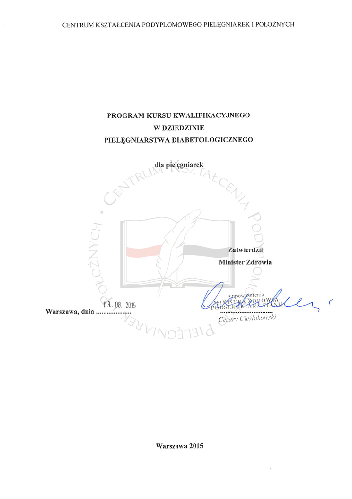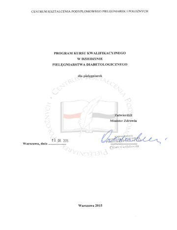 CENTRUM KSZTAŁCENIA PODYPLOMOWEGO PIELĘGNIAREK I POŁOŻNYCH PROGRAM PRZYGOTOWANY PRZEZ ZESPÓŁ PROGRAMOWY W SKŁADZIE1 1. dr n. biol. Renata Wójcik – Przewodnicząca Zespołu; Katedra Auksologii Klinicznej i Pielęgniarstwa Pediatrycznego, Uniwersytet Medyczny im. K. Marcinkowskiego w Poznaniu; Klinika Diabetologii i Otyłości Wieku Rozwojowego Szpital Kliniczny im. K. Jonschera, UM im. K. Marcinkowskiego w Poznaniu 2. dr n. med. Beata Hornik – Katedra Chorób Wewnętrznych, Zakład Pielęgniarstwa Internistycznego Wydział Nauk o Zdrowiu, Śląski Uniwersytet Medyczny w Katowicach 3. mgr Anna Ignaczak – Oddział Kliniczny Diabetologii i Gastroenterologii Ogólnej i Onkologicznej, Uniwersytecki Szpital Kliniczny nr 1 im. N. Barlickiego w Łodzi; Katedra Nauczania Pielęgniarstwa, Zakład Nauczania Pielęgniarstwa z Pracowniami Praktycznymi, Uniwersytet Medyczny w Łodzi 4. mgr Alicja Szewczyk – Konsultant Krajowy w dziedzinie pielęgniarstwa diabetologicznego, Klinika Endokrynologii i Diabetologii, Instytut „Pomnik – Centrum Zdrowia Dziecka” w Warszawie RECENZENCI PROGRAMU 1. prof. dr hab. n. med. Krzysztof Strojek – Konsultant Krajowy w dziedzinie diabetologii, Oddział Kliniczny Chorób Wewnętrznych, Diabetologii i Schorzeń Kardiometabolicznych, Śląskie Centrum Chorób Serca 2. dr n. med. Dorota Herbut – Specjalista w dziedzinie pielęgniarstwa diabetologicznego, Katedra i Klinika Endokrynologii i Poradnia Diabetologiczna, Samodzielny Publiczny Szpital Kliniczny nr 4 w Lublinie 1 Powołany Zarządzeniem Dyrektora Centrum Kształcenia Podyplomowego Pielęgniarek i Położnych Nr 73/13 z dnia 20 listopada 2013 r. w sprawie powołania Zespołu do spraw Opracowania Programu Kształcenia Podyplomowego Pielęgniarek i Położnych. str. 2 CENTRUM KSZTAŁCENIA PODYPLOMOWEGO PIELĘGNIAREK I POŁOŻNYCH 1. ZAŁOŻENIA ORGANIZACYJNO-PROGRAMOWE Rodzaj kształcenia Kurs kwalifikacyjny jest to rodzaj kształcenia, który zgodnie z ustawą z dnia 15 lipca 2011 r. o zawodach pielęgniarki i położnej (Dz. U. z 2014 r., poz. 1435, z późn. zm.) ma na celu uzyskanie przez pielęgniarkę lub położną wiedzy i umiejętności do udzielania określonych świadczeń zdrowotnych wchodzących w zakres danej dziedziny pielęgniarstwa lub dziedziny mającej zastosowanie w ochronie zdrowia. Efekty kształcenia wskazane w programie kursu kwalifikacyjnego w dziedzinie pielęgniarstwa diabetologicznego, dla pielęgniarek są dla organizatora i uczestnika kształcenia obowiązkowym elementem programu. Osiągnięcie wskazanych efektów kształcenia gwarantuje, że każdy uczestnik kursu kwalifikacyjnego będzie posiadać takie same kwalifikacje, niezależnie od miejsca ukończenia kształcenia, podmiotu organizującego kształcenie oraz systemu kształcenia. Cel kształcenia Przygotowanie pielęgniarki do sprawowania profesjonalnej opieki nad pacjentem z cukrzycą i jego rodziną. Czas kształcenia Łączna liczba godzin przeznaczonych na realizację programu kursu kwalifikacyjnego w kontakcie z wykładowcą/opiekunem stażu wynosi 338 godzin dydaktycznych: zajęcia teoretyczne – 170 godzin, zajęcia praktyczne – 168 godzin. Organizator kształcenia w porozumieniu z kierownikiem kursu, ma prawo dokonać modyfikacji czasu trwania zajęć teoretycznych. Oznacza to, że 80% łącznej liczby godzin przeznaczonych na realizację programu nie podlega zmianie. Wskazane 20%, co stanowi nie więcej niż 68 godzin, może być wykorzystane na samokształcenie. Sposób organizacji Za przebieg i organizację kursu kwalifikacyjnego odpowiedzialny jest organizator kształcenia. Planując realizację kształcenia, organizator powinien: 1. Opracować regulamin organizacyjny kursu kwalifikacyjnego, który w szczególności określa: organizację; zasady i sposób naboru osób; prawa i obowiązki osób uczestniczących; zakres obowiązków kadry dydaktycznej prowadzącej nauczanie teoretyczne i praktyczne; zasady przeprowadzenia egzaminu końcowego. 2. Powołać kierownika kursu kwalifikacyjnego. Do zadań kierownika kursu oprócz zadań określonych w przepisach Ministra Zdrowia z tego zakresu powinno należeć: współdecydowanie o doborze kadry dydaktycznej; przedstawienie uczestnikom kursu: celu, programu i organizacji kształcenia; ocenianie placówek szkolenia praktycznego wg specyfiki i organizacji zajęć; pomaganie w rozwiązywaniu problemów; udzielanie indywidualnych konsultacji uczestnikom kursu; zbieranie i analizowanie opinii o przebiegu kursu. str. 3 CENTRUM KSZTAŁCENIA PODYPLOMOWEGO PIELĘGNIAREK I POŁOŻNYCH 3. Przeprowadzić postępowanie kwalifikacyjne. 4. Powołać wykładowców posiadających kwalifikacje określone w programie kursu. 5. Powołać w uzgodnieniu z kierownikiem kursu opiekunów szkolenia praktycznego, którzy powinni być merytorycznymi pracownikami placówek, w których odbywa się szkolenie praktyczne. Do zadań opiekuna szkolenia praktycznego należy: instruktaż wstępny (zapoznanie z celem szkolenia praktycznego, z organizacją pracy, wyposażeniem placówki, jej personelem, zakresem udzielanych świadczeń i in.); instruktaż bieżący (organizacja i prowadzenie zajęć, kontrola nad ich prawidłowym przebiegiem, pomoc w rozwiązywaniu problemów i in.); instruktaż końcowy (omówienie i podsumowanie zajęć, zaliczenie świadczeń zdrowotnych określonych w programie kształcenia, ocena uzyskanych wiadomości i umiejętności). 6. Zapewnić bazę dydaktyczną do szkolenia teoretycznego, dostosowaną do liczby uczestników kursu. 7. Zapewnić środki dydaktyczne, o których mowa w programie poszczególnych modułów. 8. Dobrać placówki stażowe zgodnie z planem nauczania, w których możliwe będzie zdobywanie umiejętności niezbędnych do wykonywania określonych świadczeń zdrowotnych. 9. Posiadać wewnętrzny system monitorowania jakości kształcenia. Sposób sprawdzania efektów kształcenia W toku realizacji programu przewiduje się ocenianie: 1. 